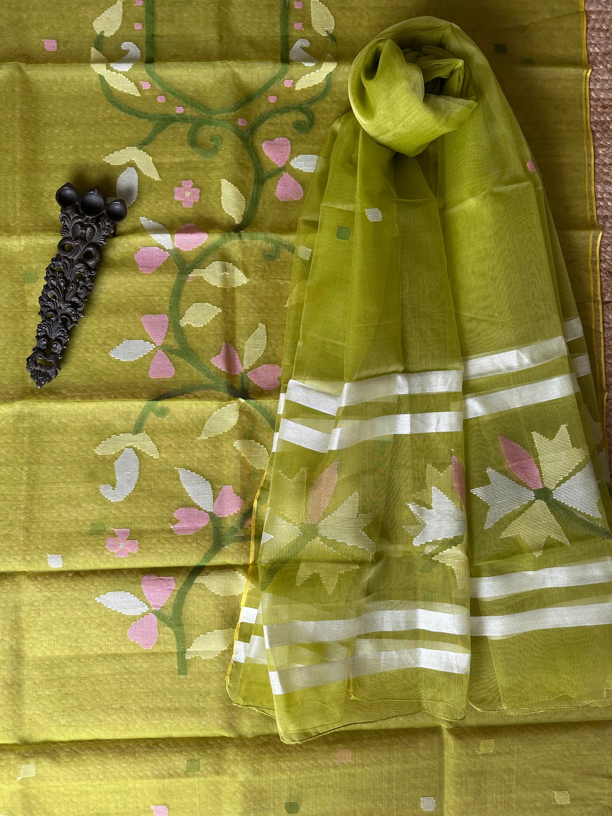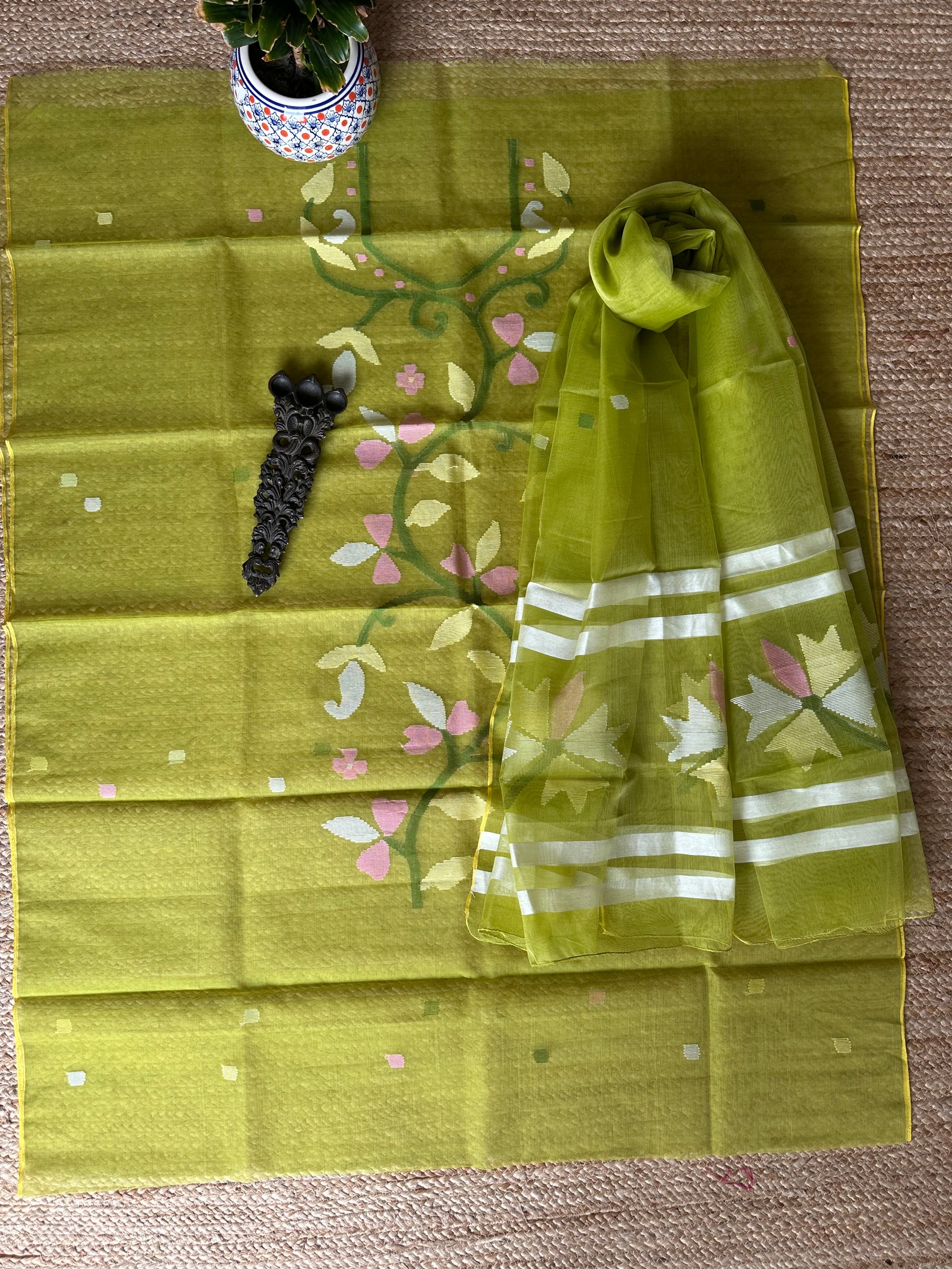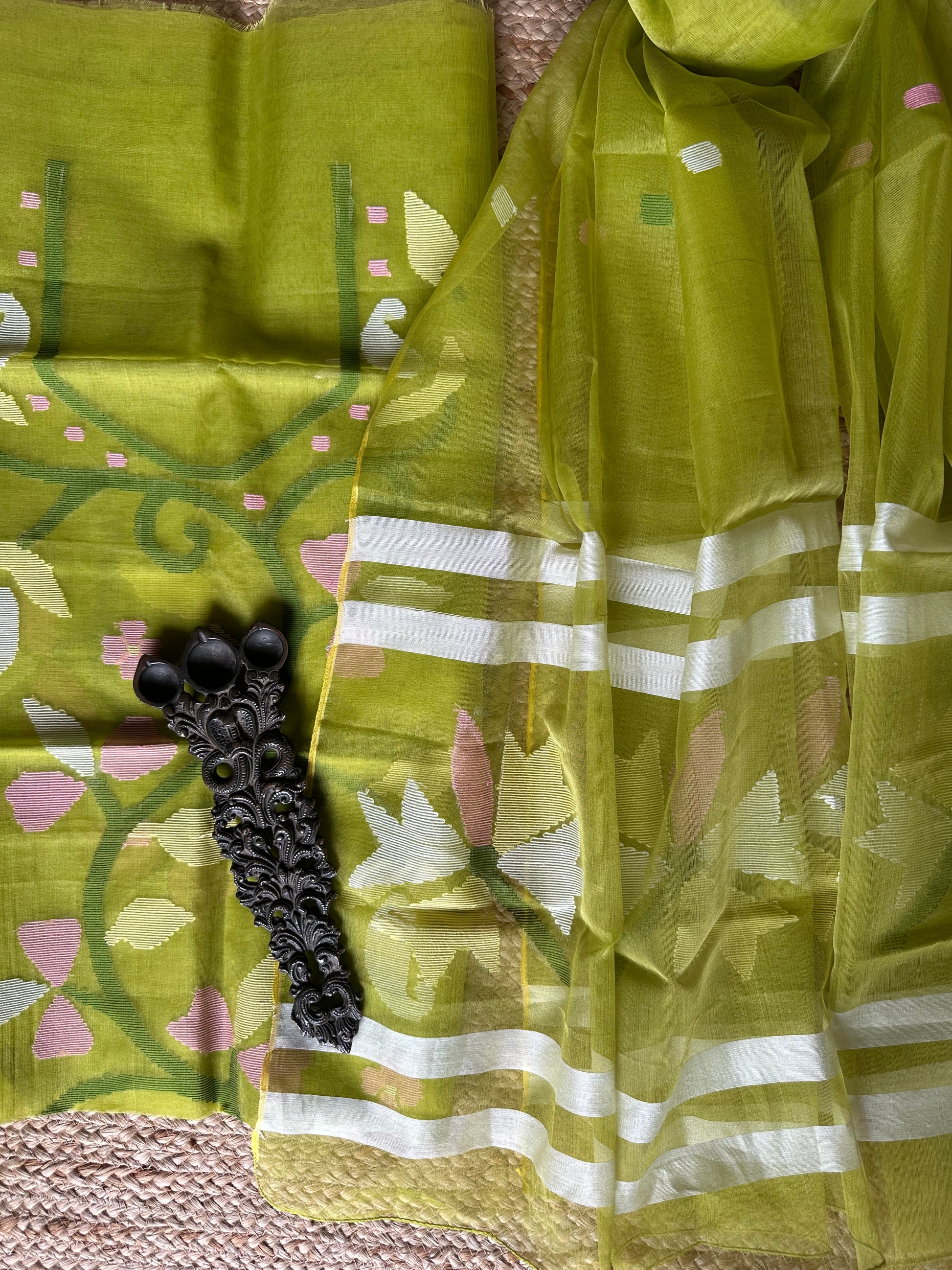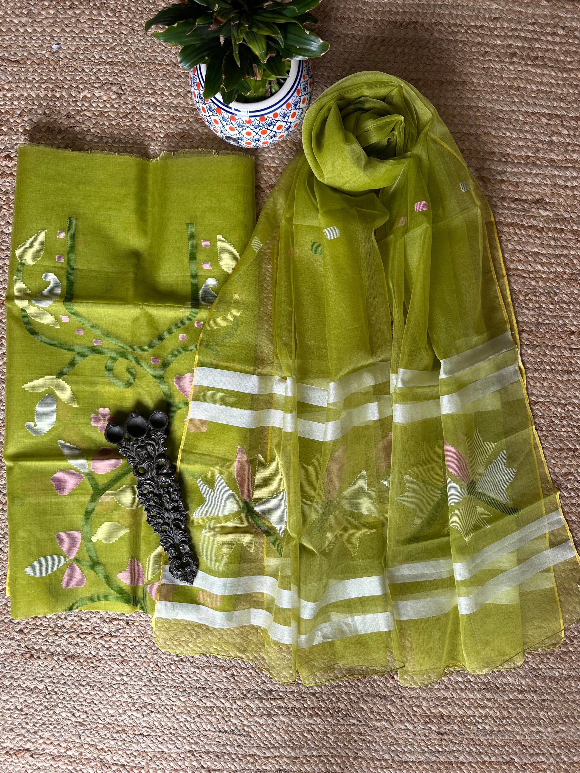 | Lime green handwoven pure muslin silk kurta with resham jamdani muslin dupatta fabric: 2.5 mtrs meter dupatta : 2.5 mtrs * 35'' slight difference in shade could be due to camera & lights. embrace the imperfection !! happy handloom dry clean only |