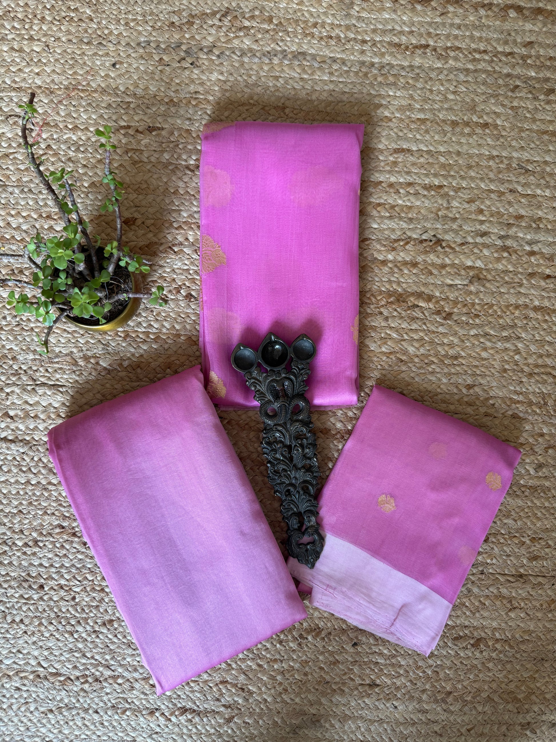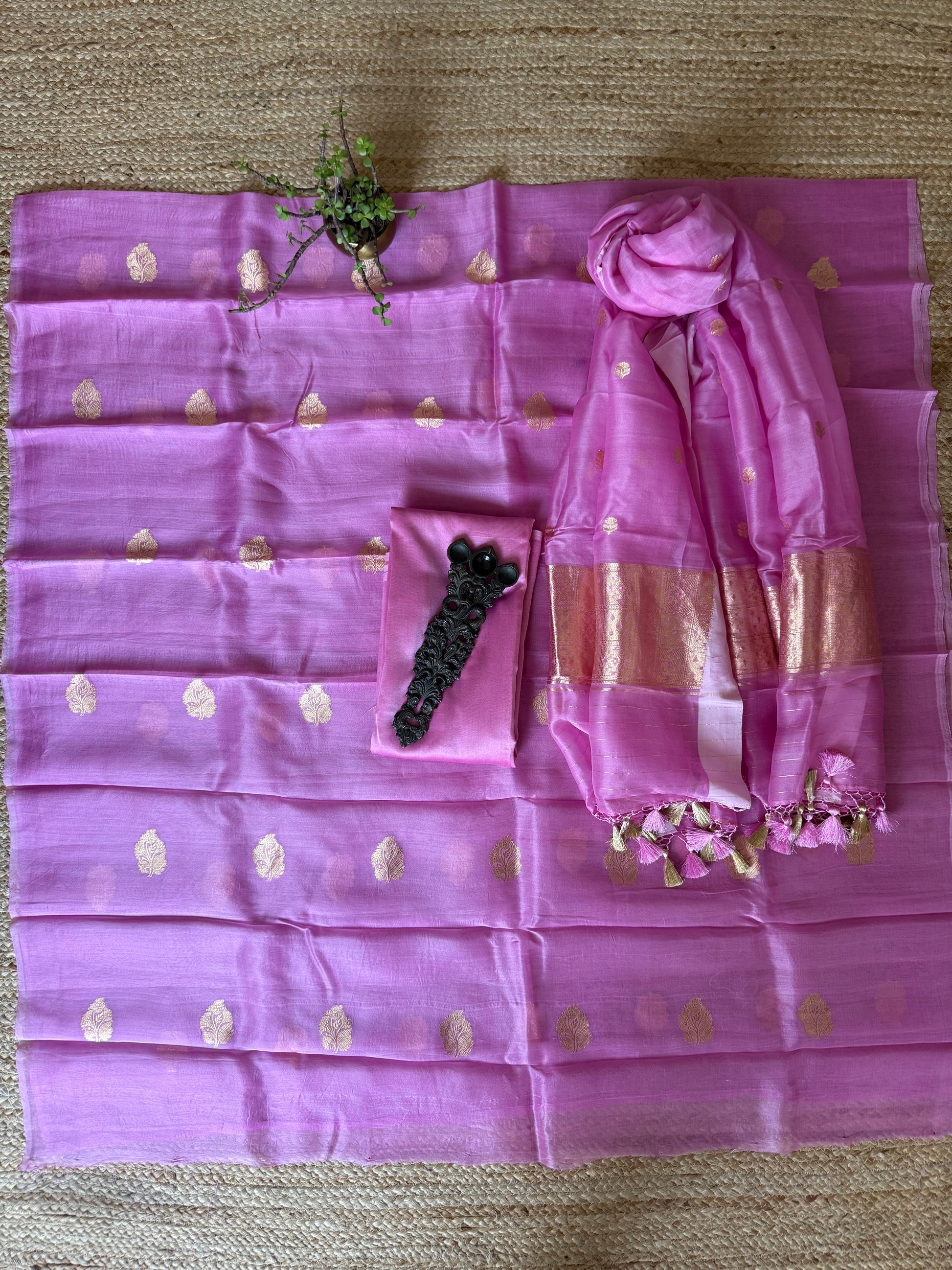 Rose pink purple Kora Silk certified handloom Banarsi kadwa booti meenakari 3 piece suit set The dupatta is Kota with Banarsi border FABRIC: 2.5 MTRS METER BOTTOM:2.5 MTS DUPATTA: 2.5 MTRS * 35'' A SLIGHT DIFFERENCE IN SHADE COULD BE DUE TO THE CAMERA & LIGHTS. EMBRACE THE IMPERFECTION !! HAPPY HANDLOOM DRY CLEAN ONLY |