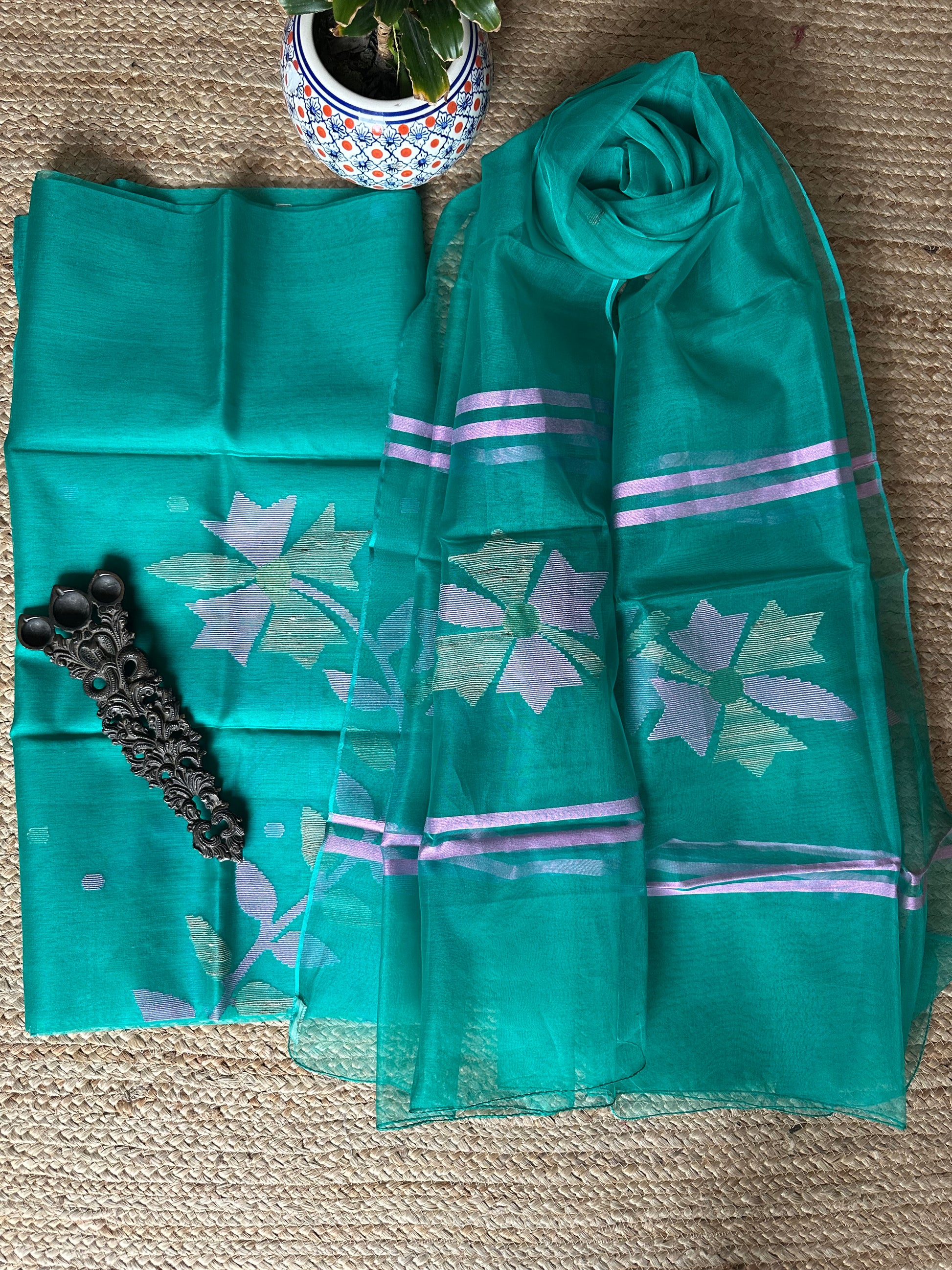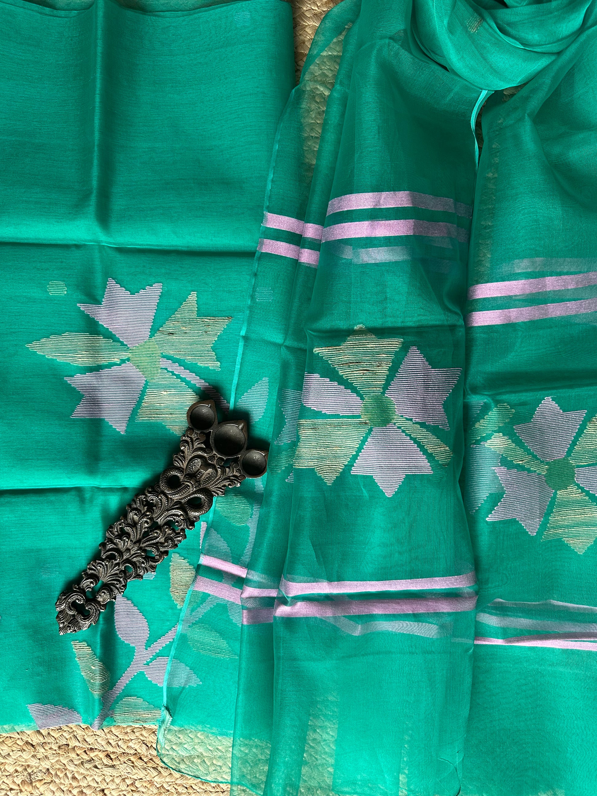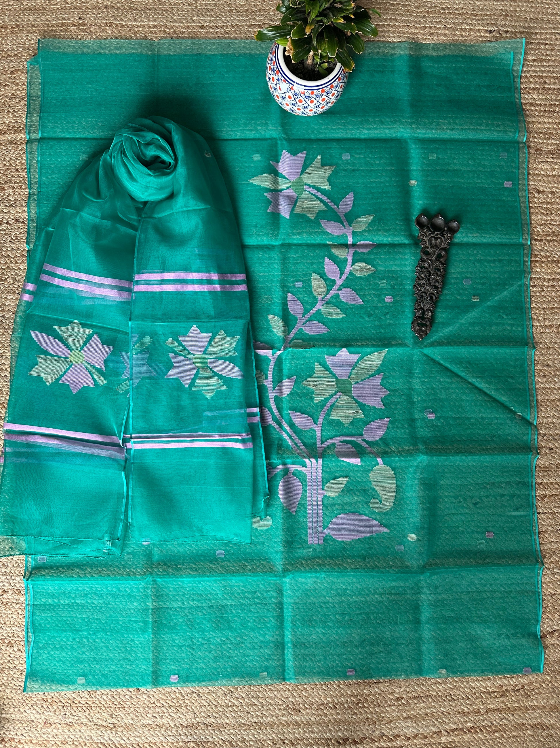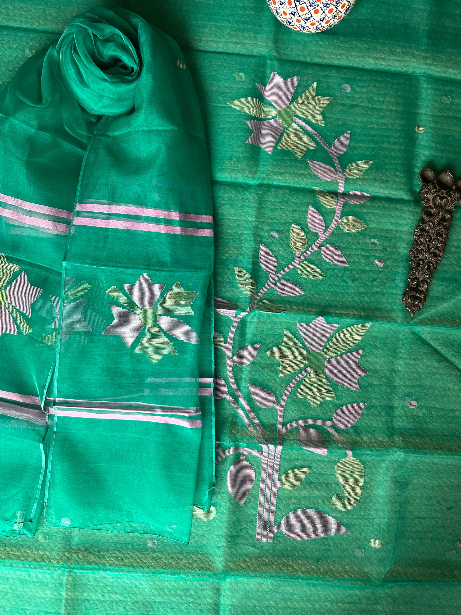 | Persian green handwoven pure muslin silk kurta with resham jamdani muslin dupatta fabric: 2.5 mtrs meter dupatta : 2.5 mtrs * 35'' slight difference in shade could be due to camera & lights. embrace the imperfection !! happy handloom dry clean only |