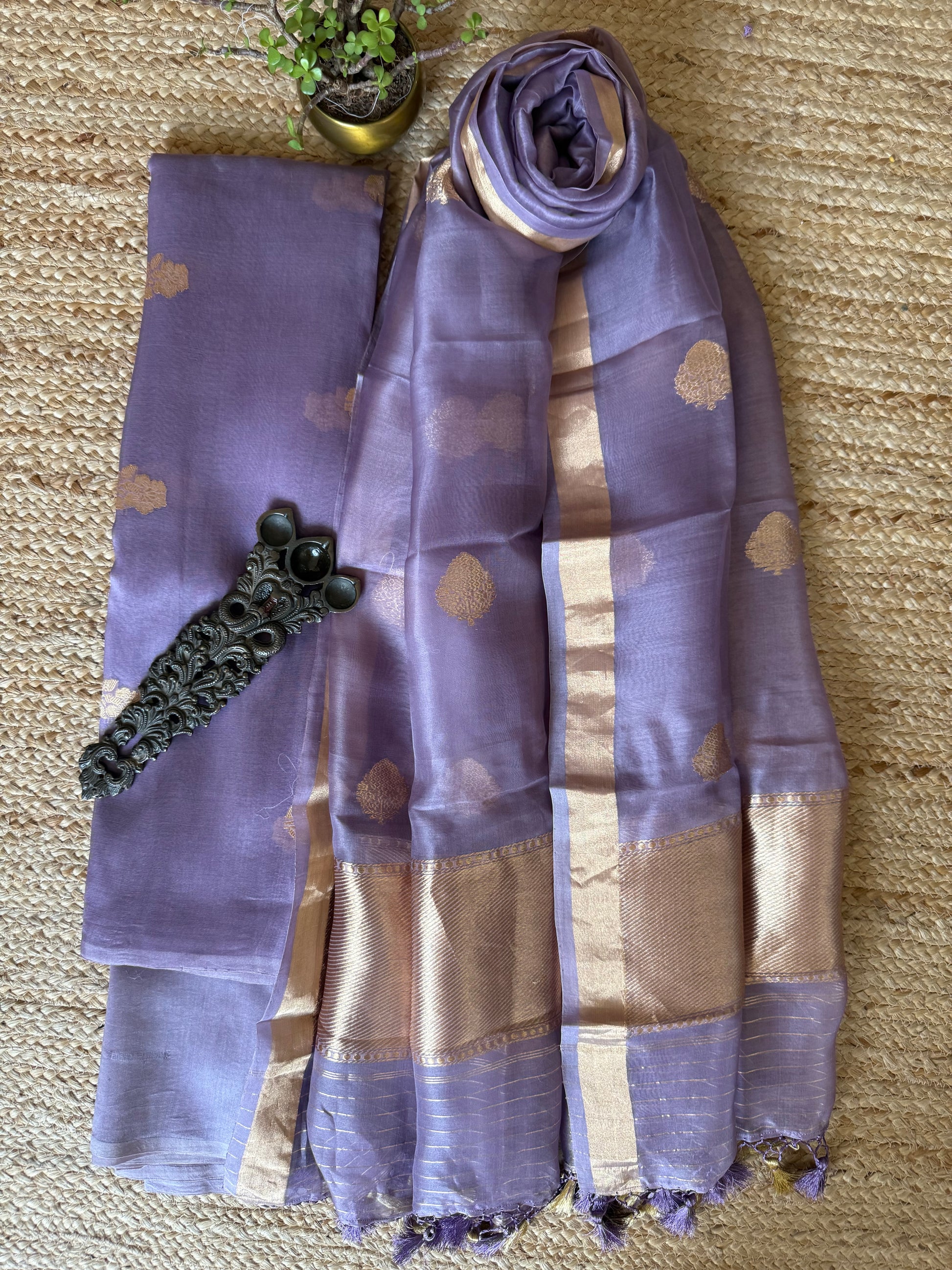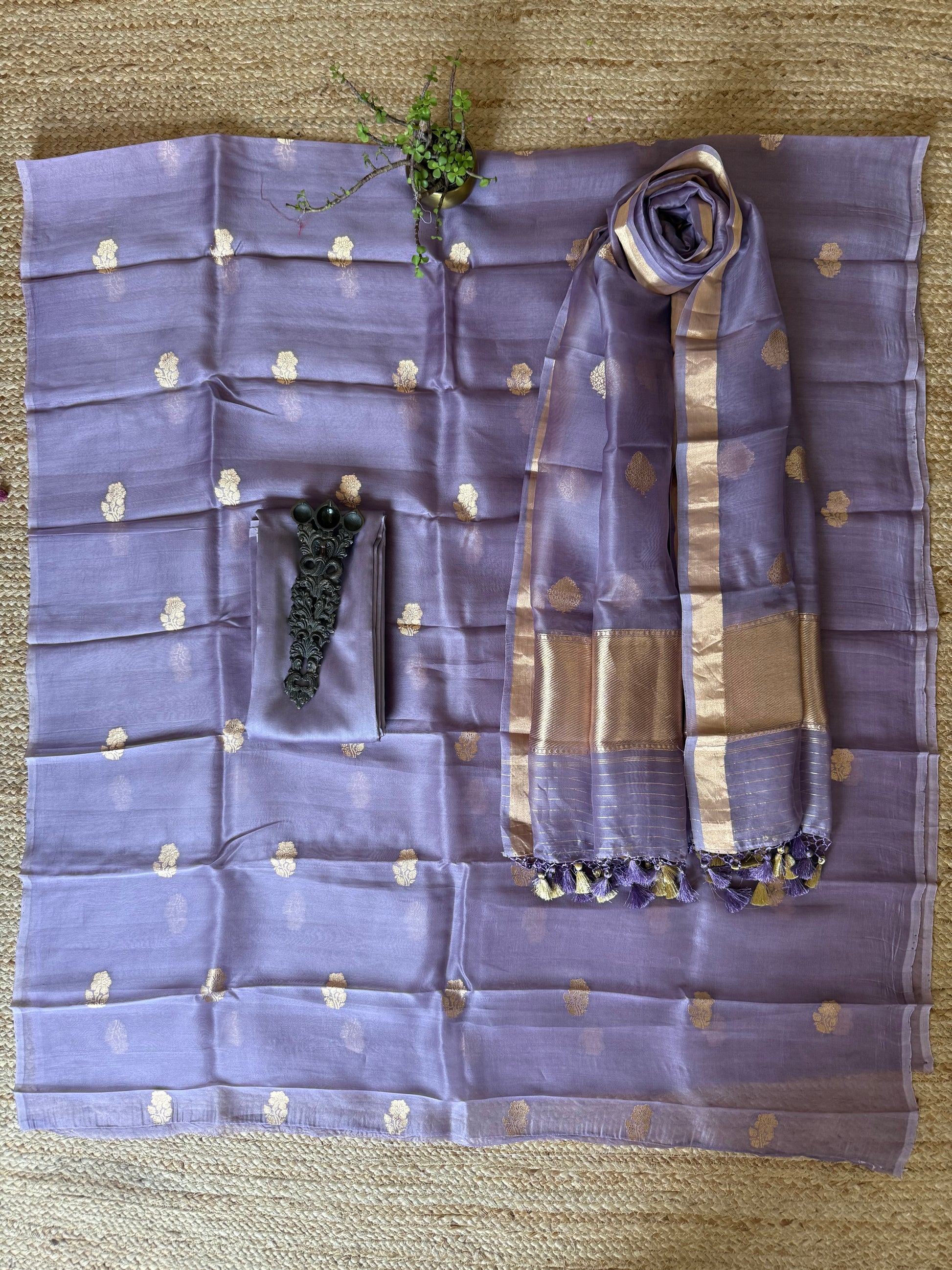 Heather purple Kora Silk certified handloom Banarsi kadwa booti meenakari 3 piece suit set The dupatta is Kota with Banarsi border FABRIC: 2.5 MTRS METER BOTTOM:2.5 MTS DUPATTA: 2.5 MTRS * 35'' A SLIGHT DIFFERENCE IN SHADE COULD BE DUE TO THE CAMERA & LIGHTS. EMBRACE THE IMPERFECTION !! HAPPY HANDLOOM DRY CLEAN ONLY |