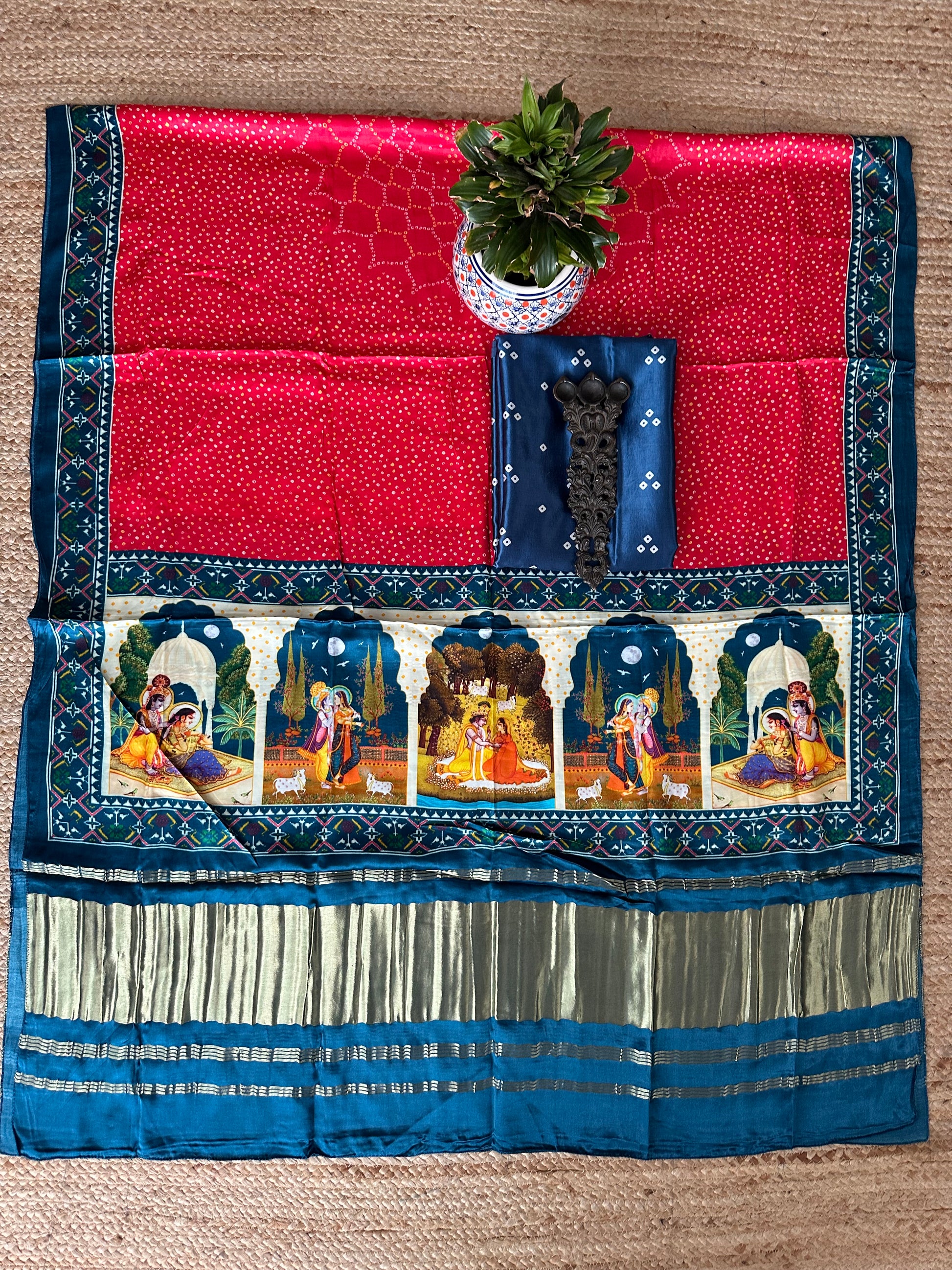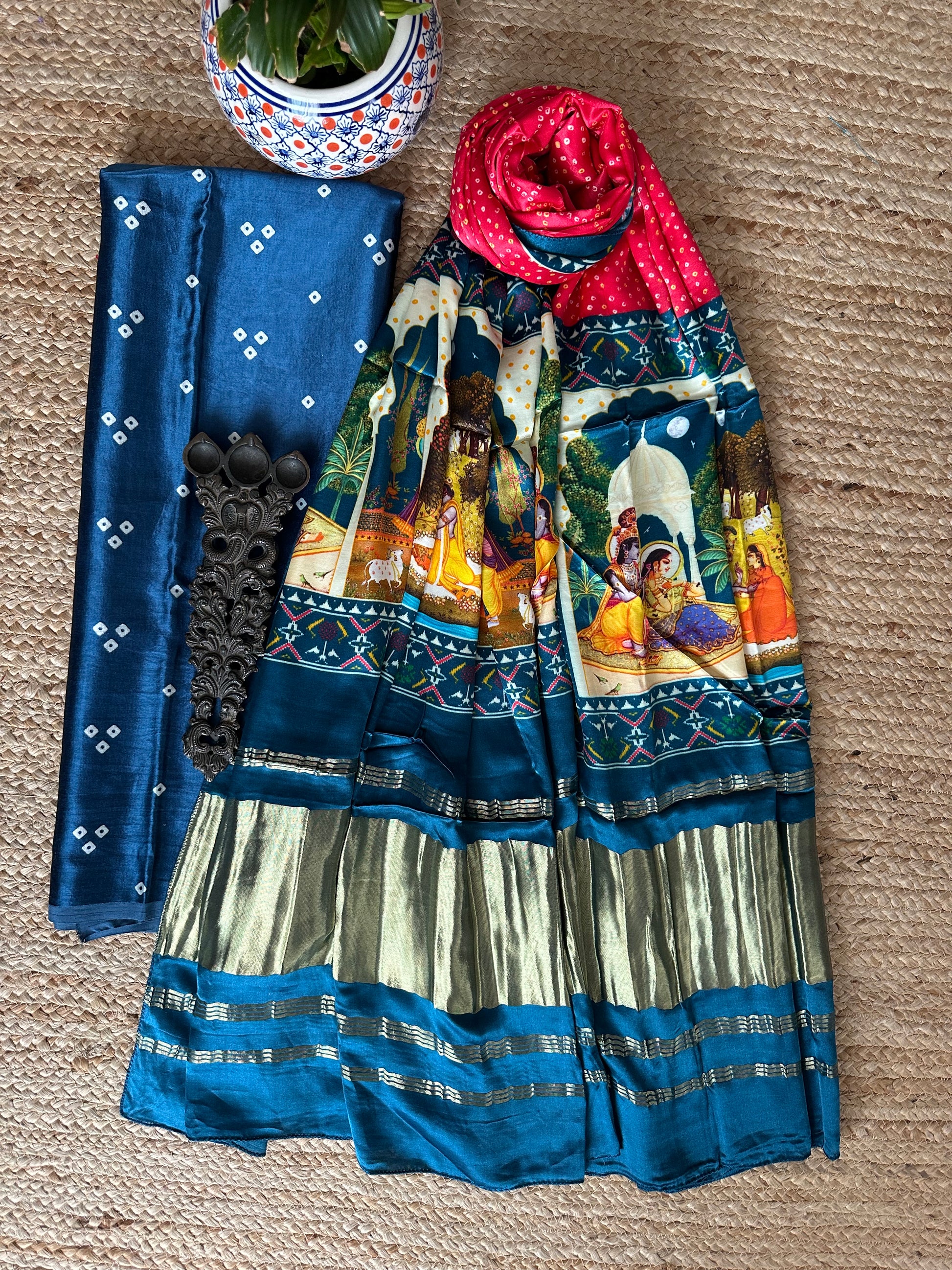 | BLUE THREE DOT MASHRU SILK KURTA WITH PATOLAPRINT MODAL SILK DUPATTA