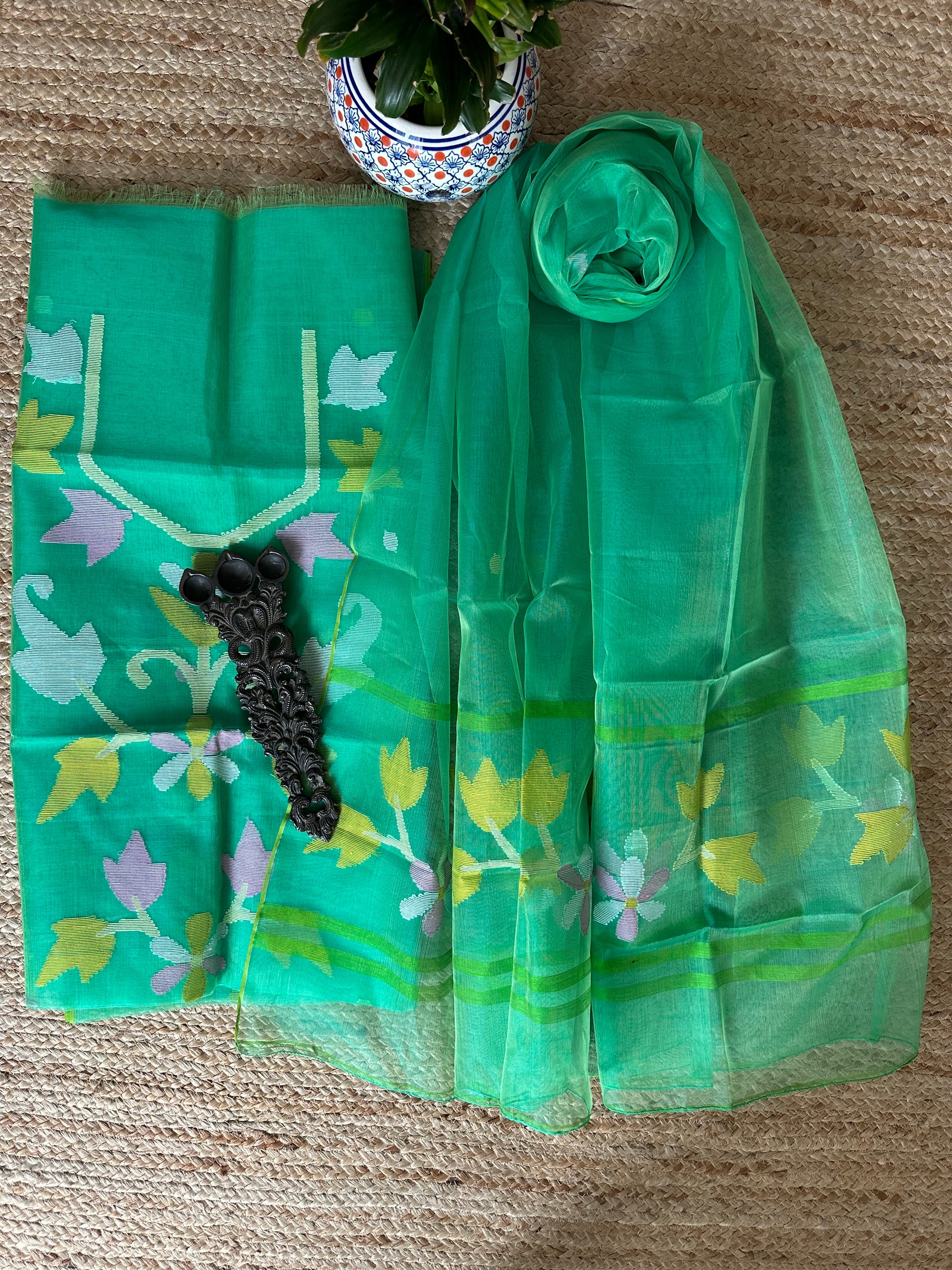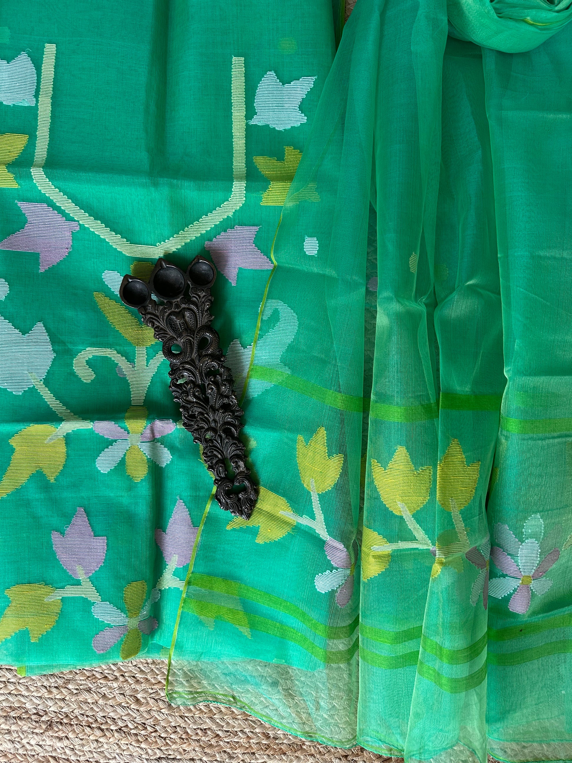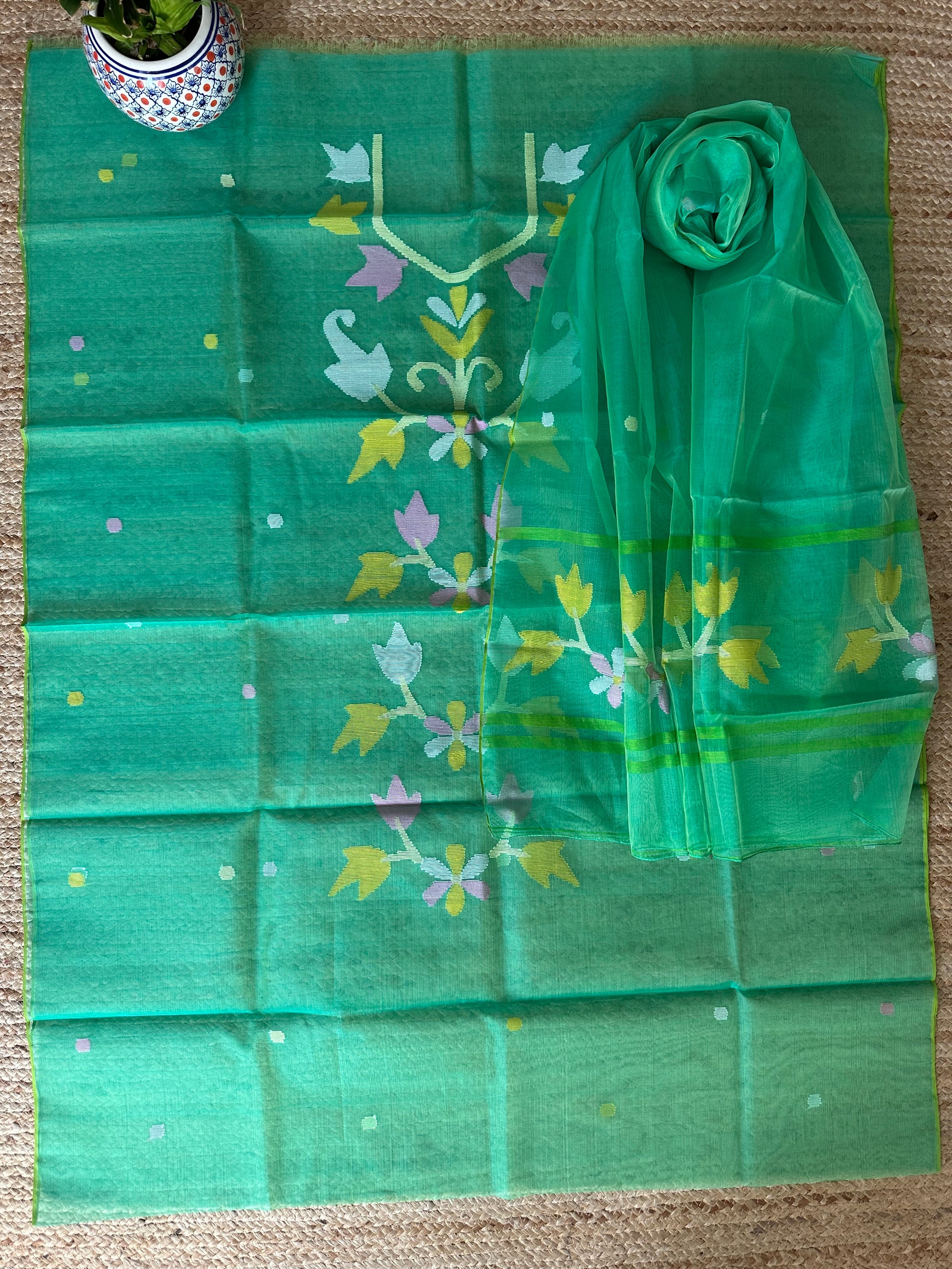 | neon green handwoven pure muslin silk kurta with resham jamdani muslin dupatta fabric: 2.5 mtrs meter dupatta : 2.5 mtrs * 35'' slight difference in shade could be due to camera & lights. embrace the imperfection !! happy handloom dry clean only |