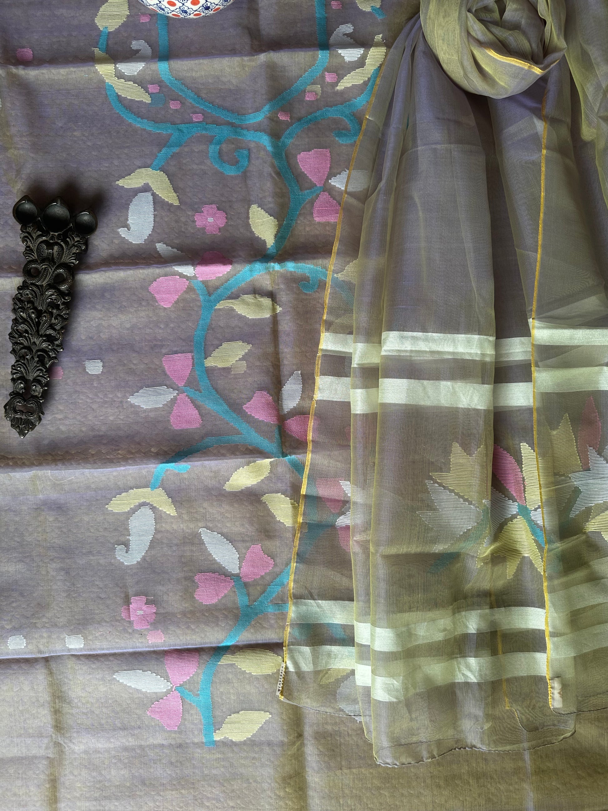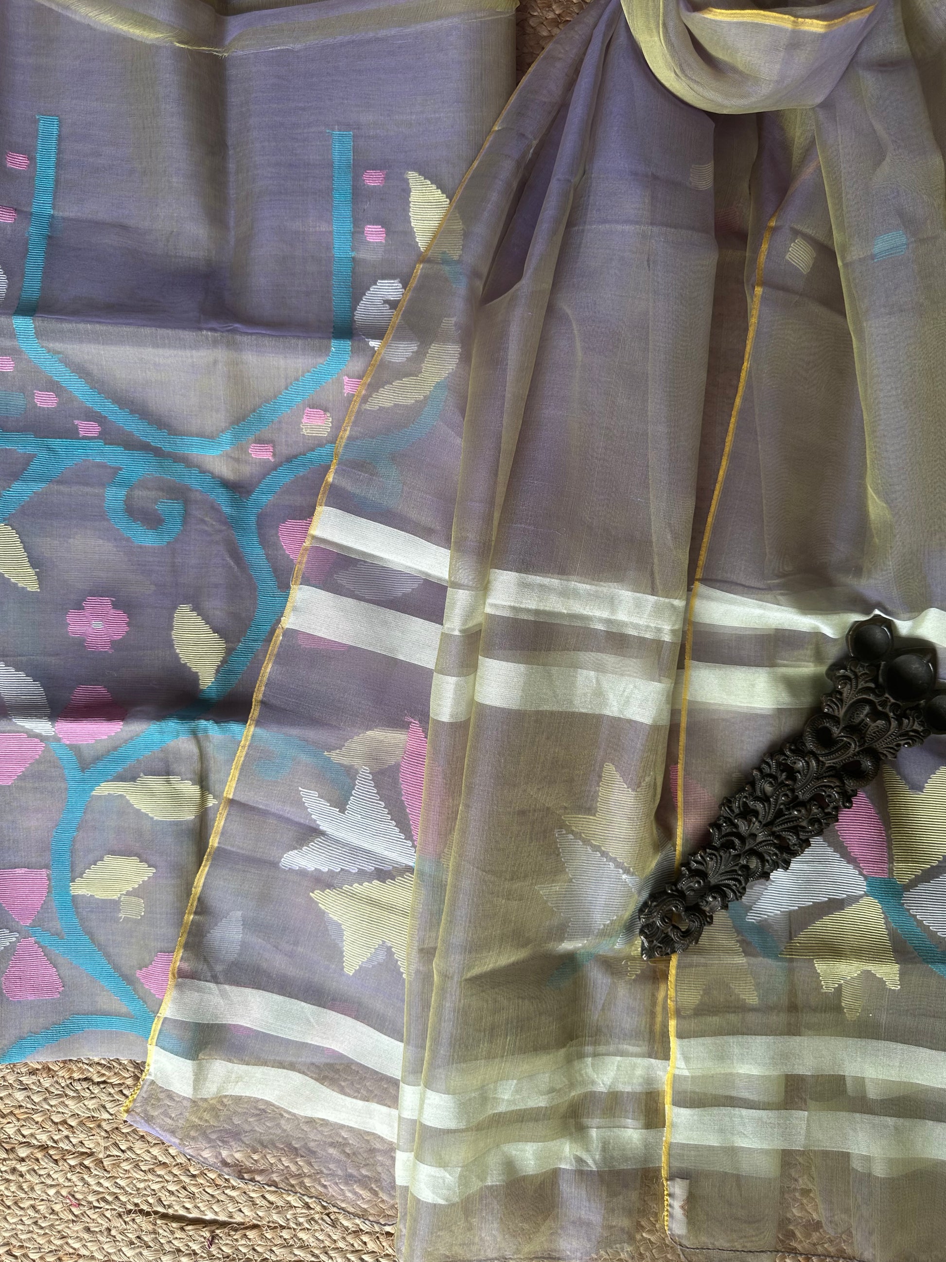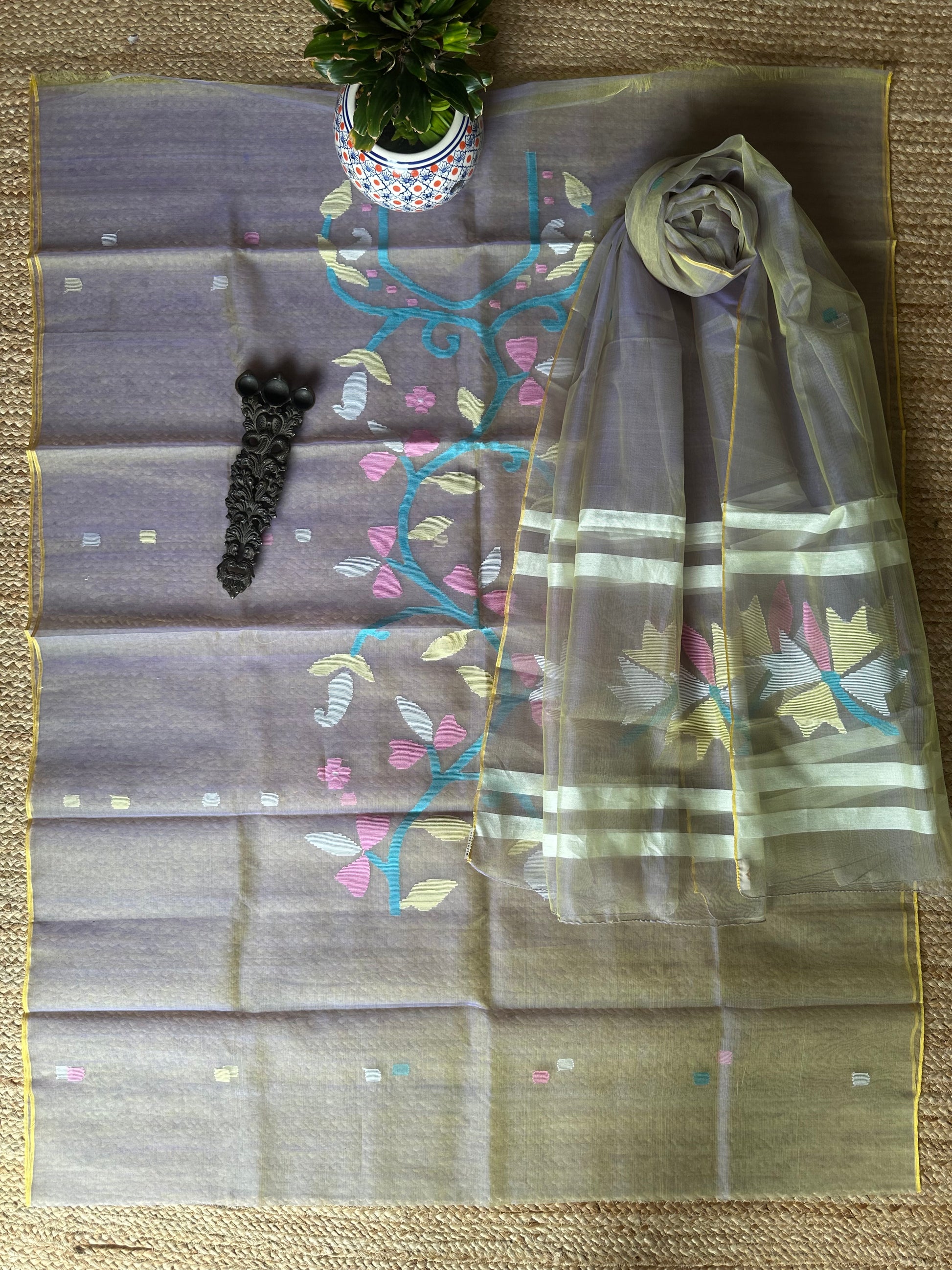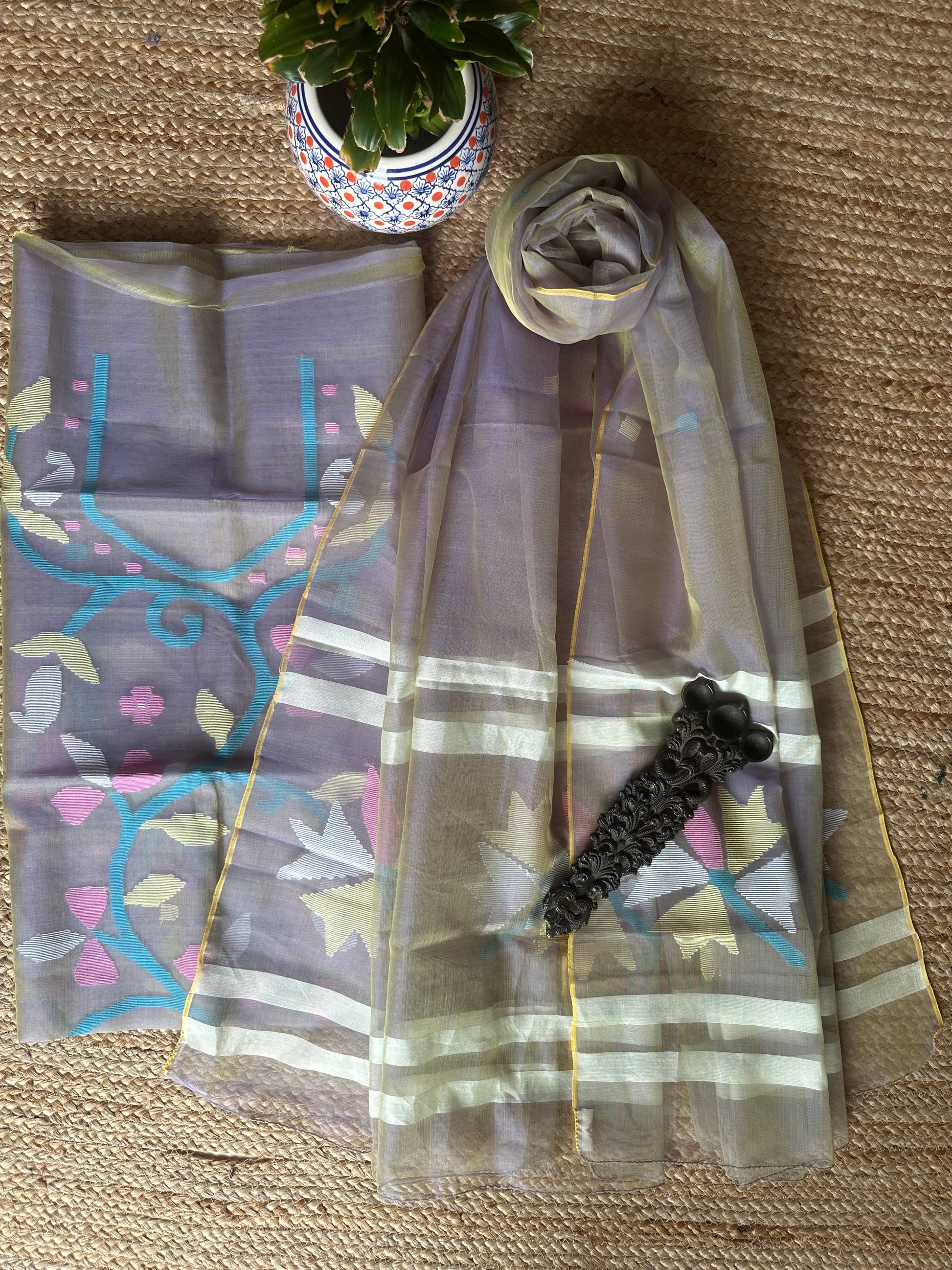 | Greenish Blue handwoven pure muslin silk kurta with resham jamdani muslin dupatta fabric: 2.5 mtrs meter dupatta : 2.5 mtrs * 35'' slight difference in shade could be due to camera & lights. embrace the imperfection !! happy handloom dry clean only |