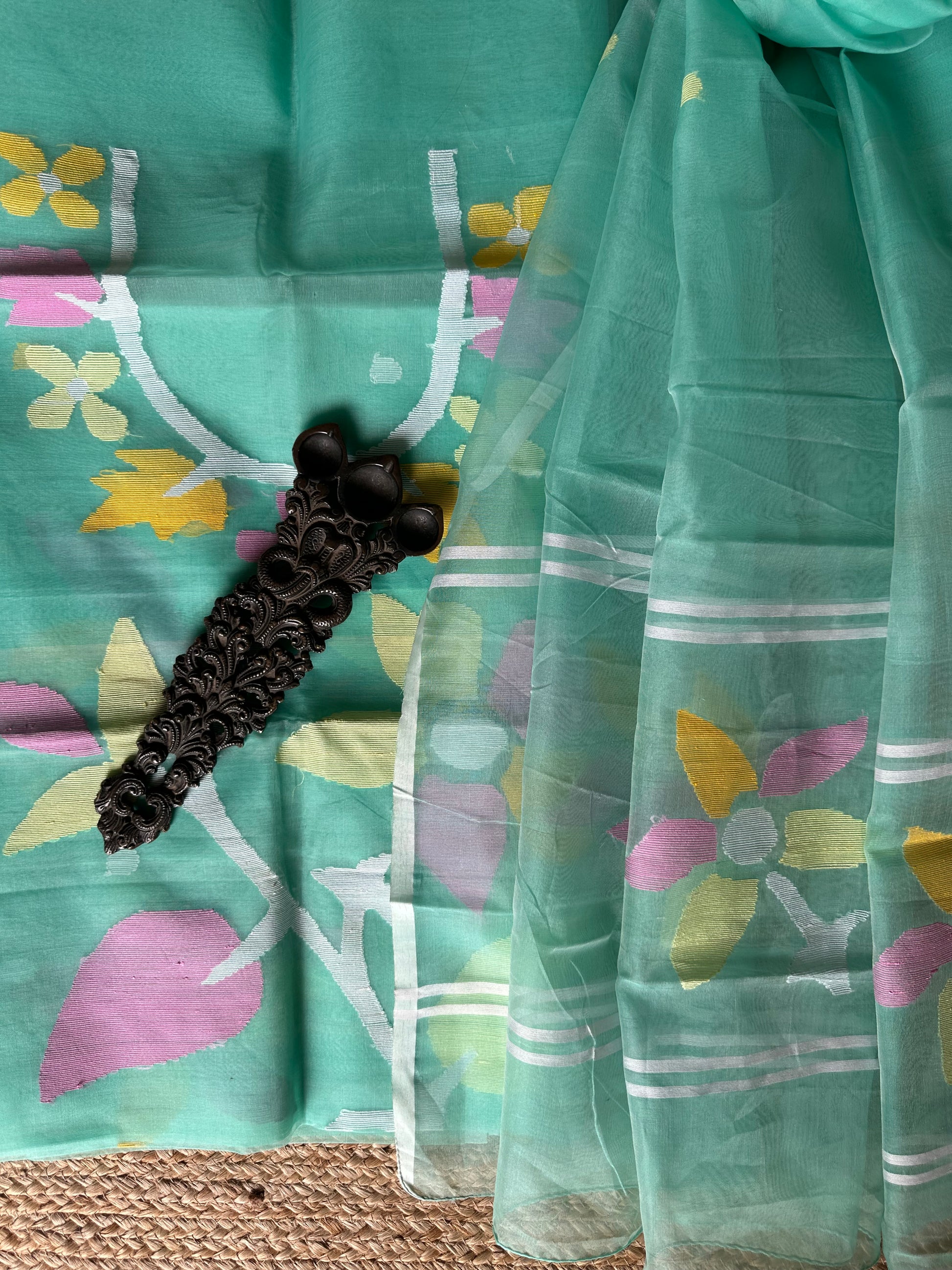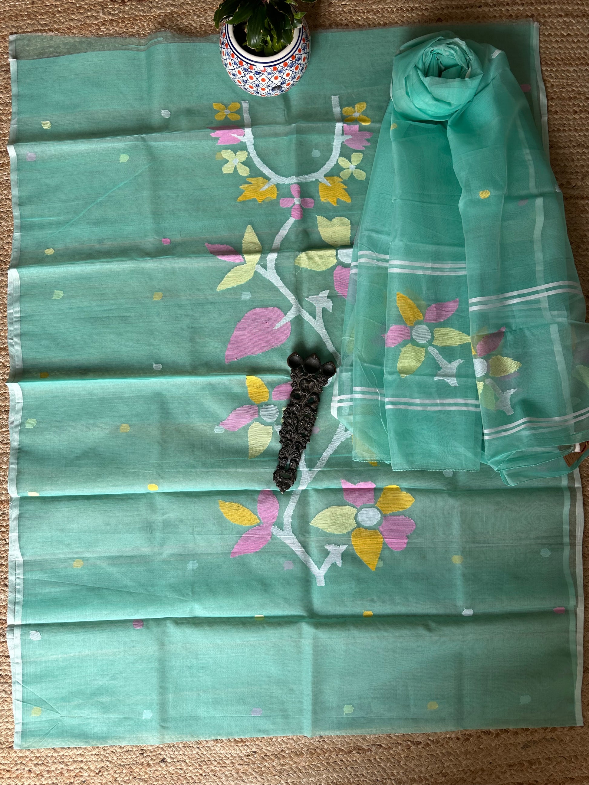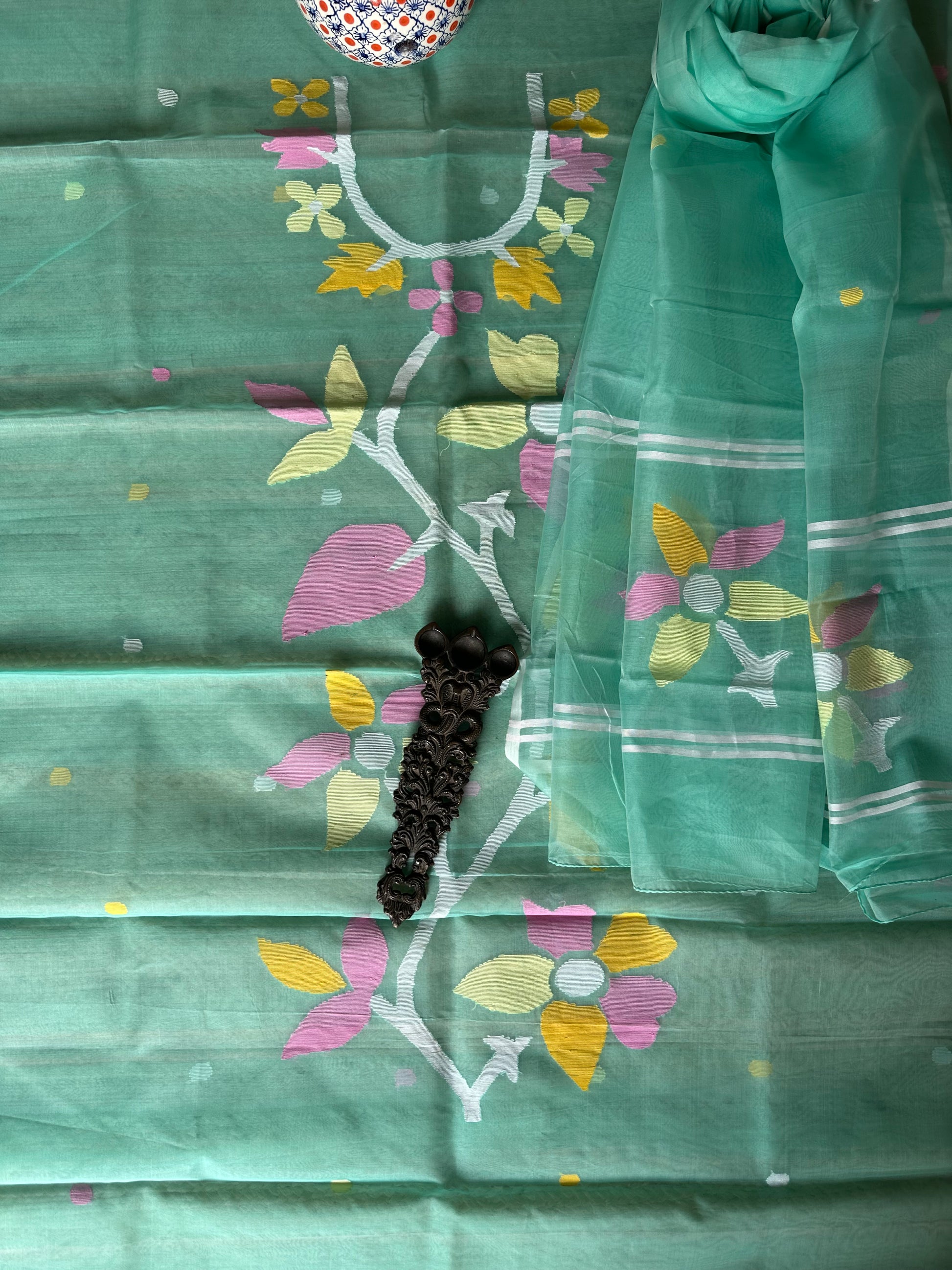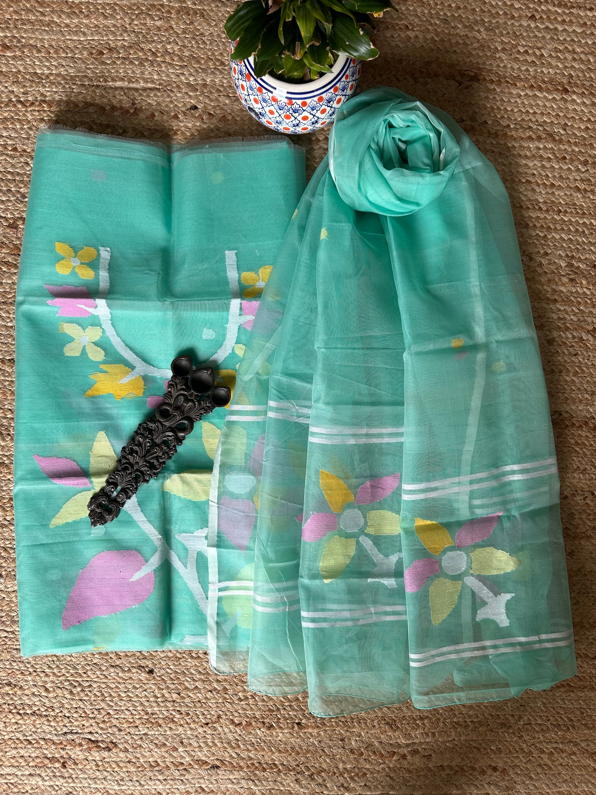 | Turquoise handwoven pure muslin silk kurta with resham jamdani muslin dupatta fabric: 2.5 mtrs meter dupatta : 2.5 mtrs * 35'' slight difference in shade could be due to camera & lights. embrace the imperfection !! happy handloom dry clean only |