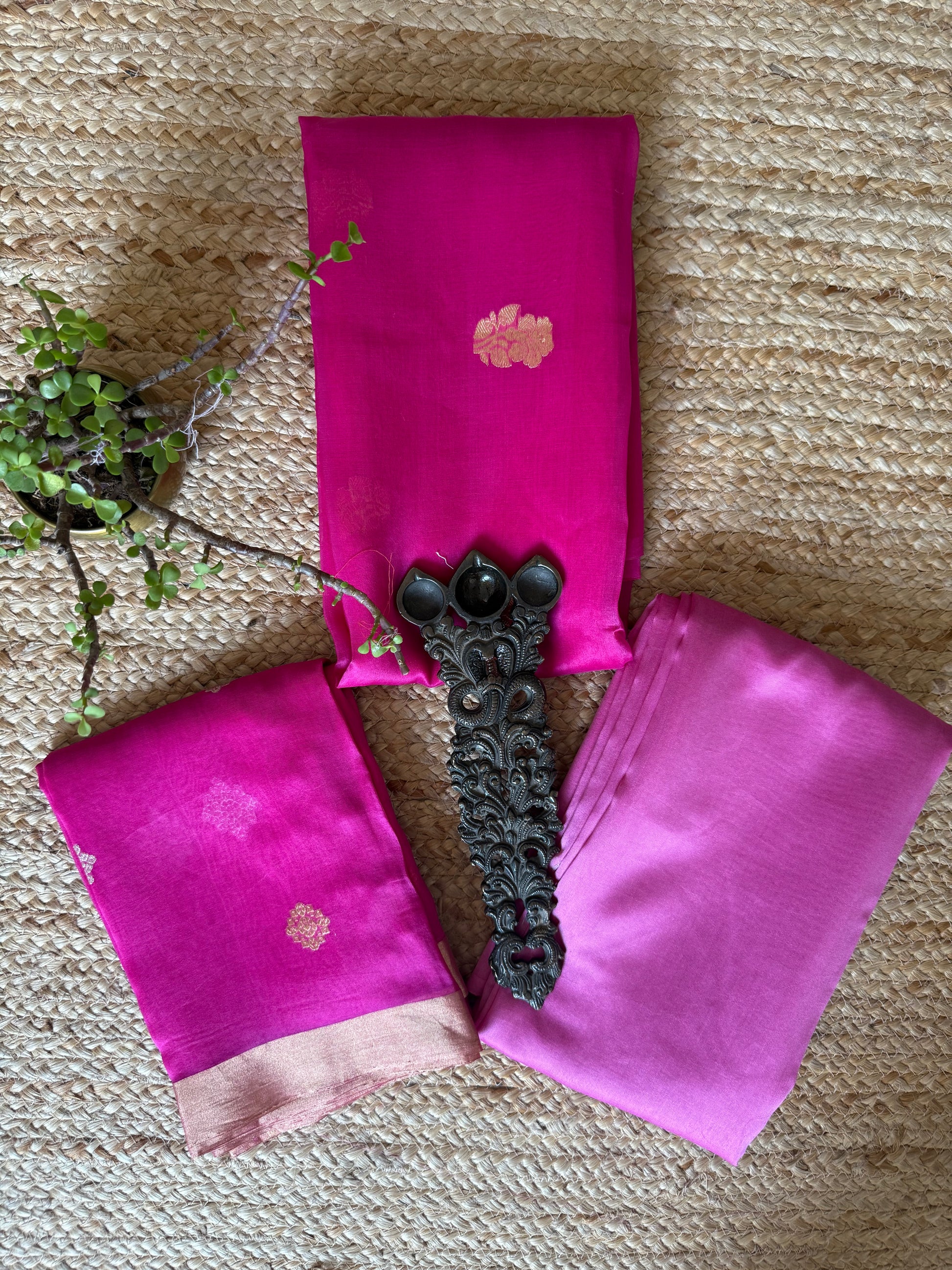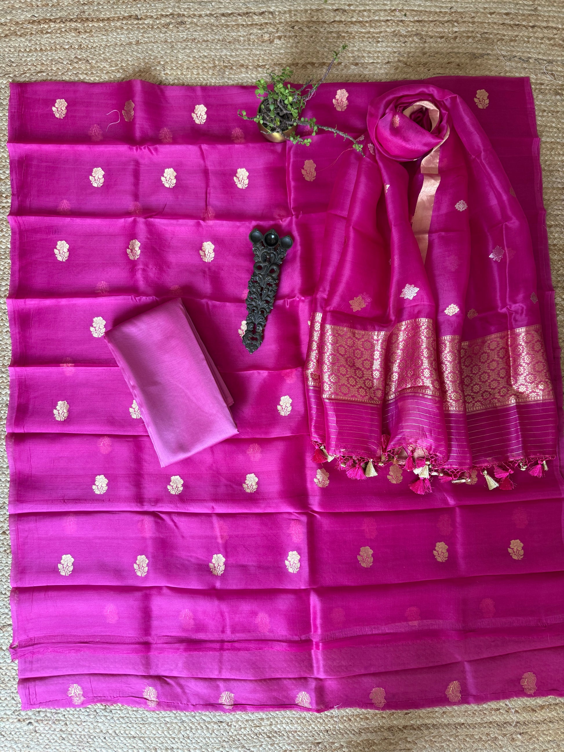 Magenta pink purple Kora Silk certified handloom Banarsi kadwa booti meenakari 3 piece suit set The dupatta is Kota with Banarsi border FABRIC: 2.5 MTRS METER BOTTOM:2.5 MTS DUPATTA: 2.5 MTRS * 35'' A SLIGHT DIFFERENCE IN SHADE COULD BE DUE TO THE CAMERA & LIGHTS. EMBRACE THE IMPERFECTION !! HAPPY HANDLOOM DRY CLEAN ONLY |