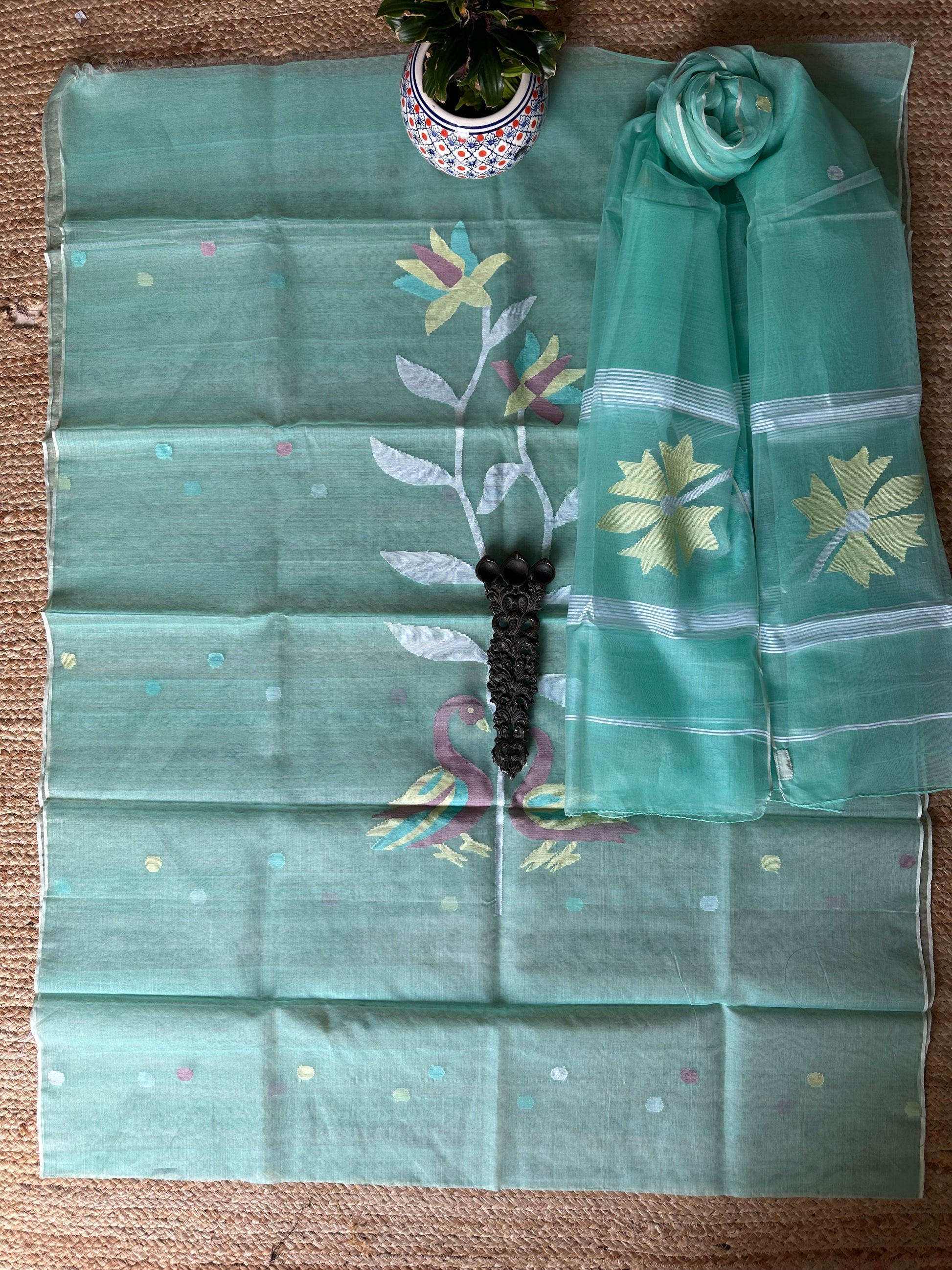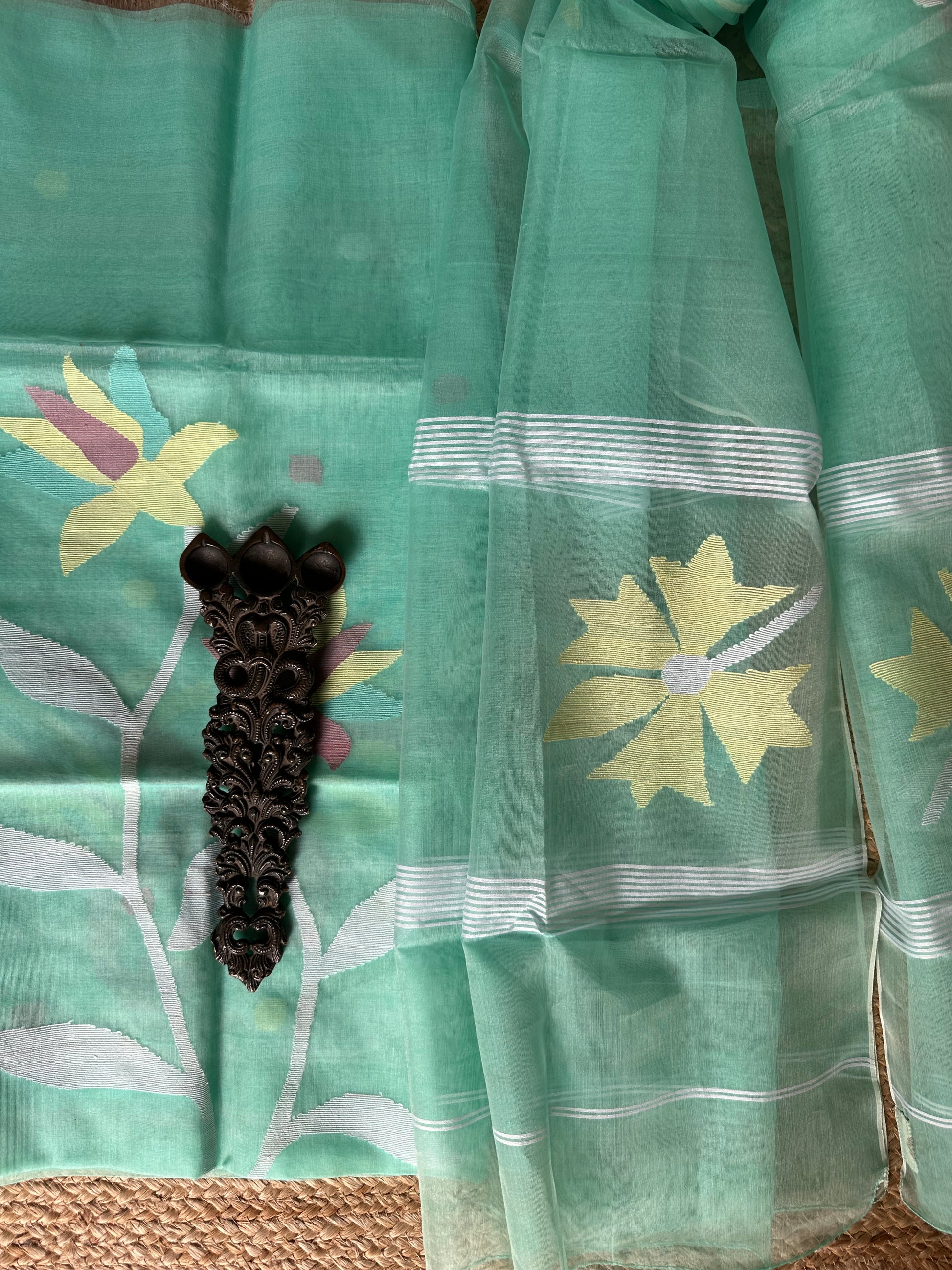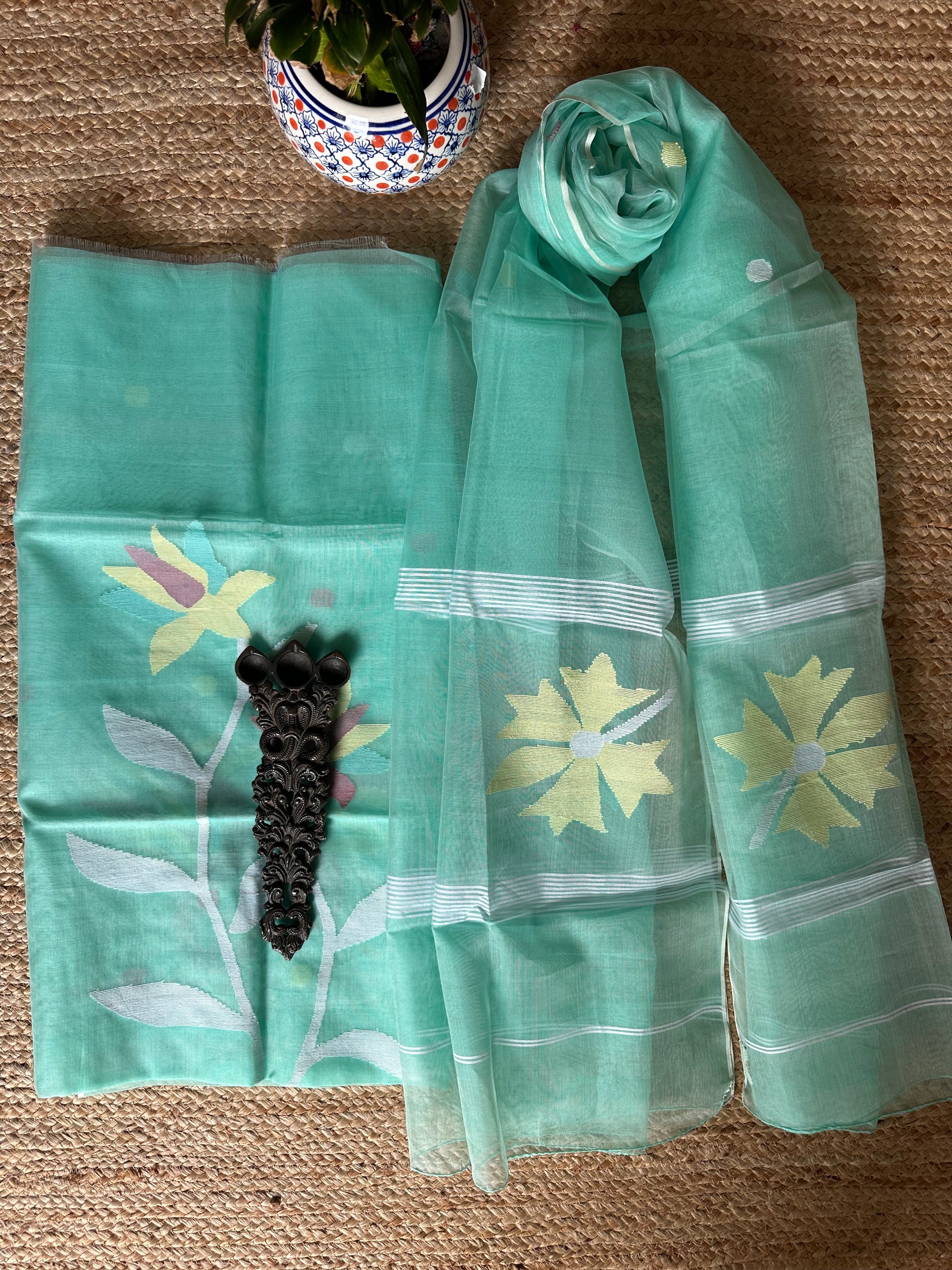 | aquamarine blue handwoven pure muslin silk kurta with resham jamdani muslin dupatta fabric: 2.5 mtrs meter dupatta : 2.5 mtrs * 35'' slight difference in shade could be due to camera & lights. embrace the imperfection !! happy handloom dry clean only |
