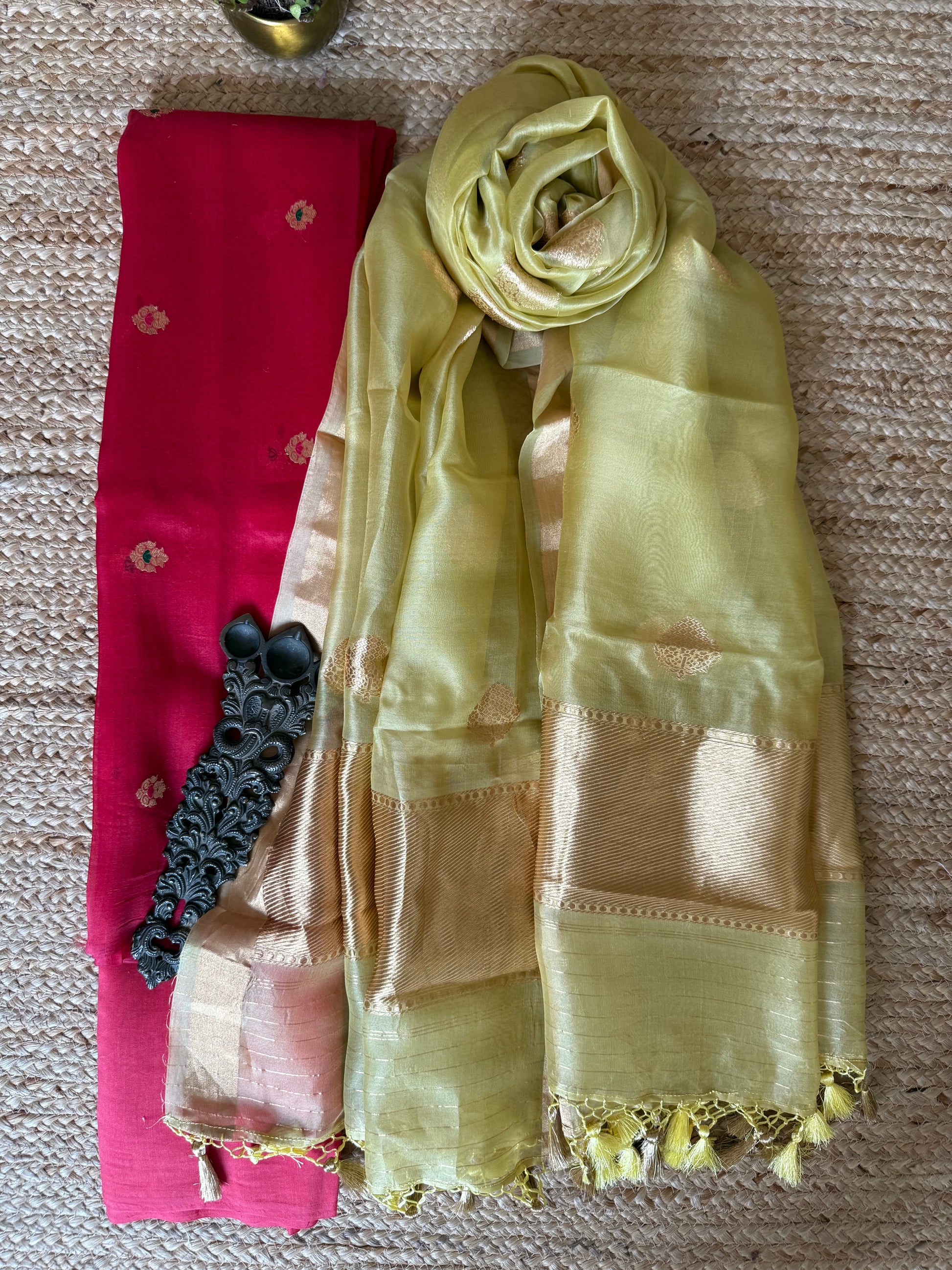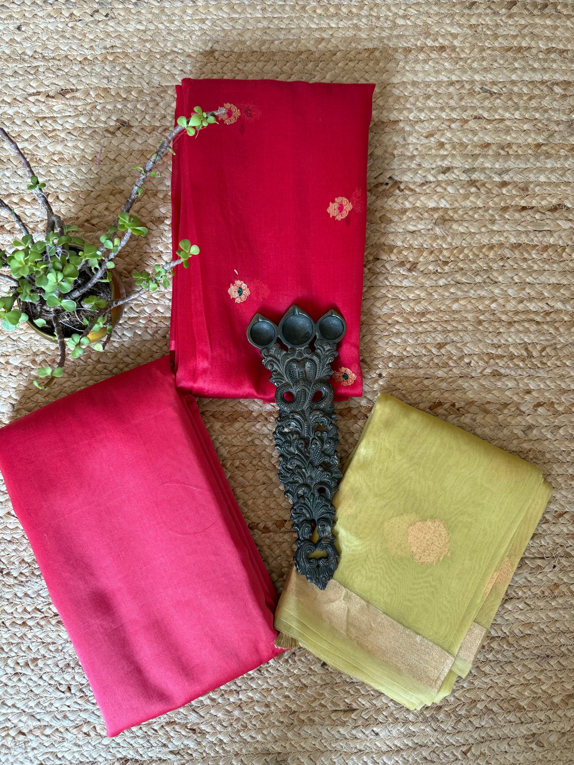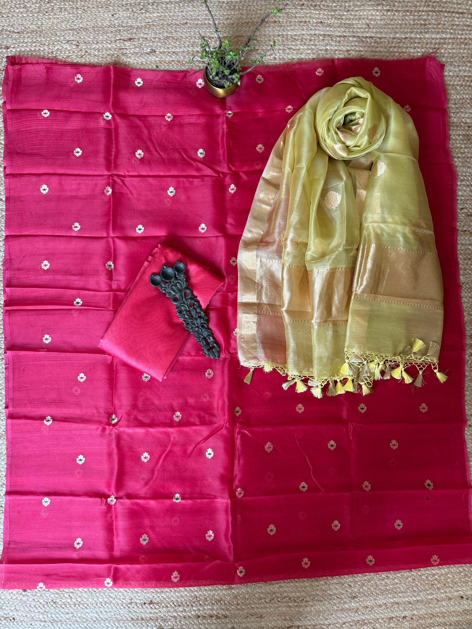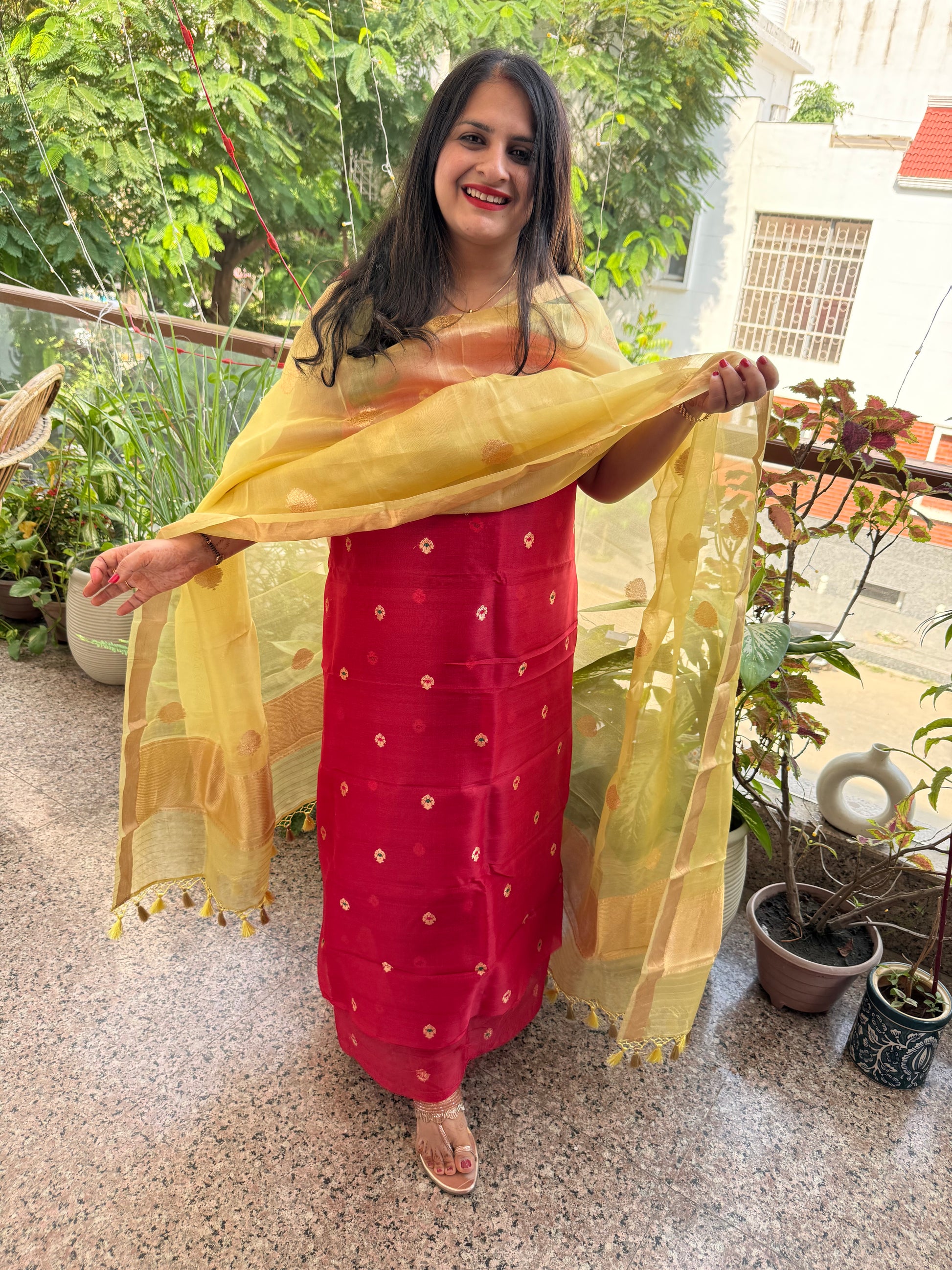 Carmine Red Kora silk certified handloom Banarsi kadwa Booti three piece suit