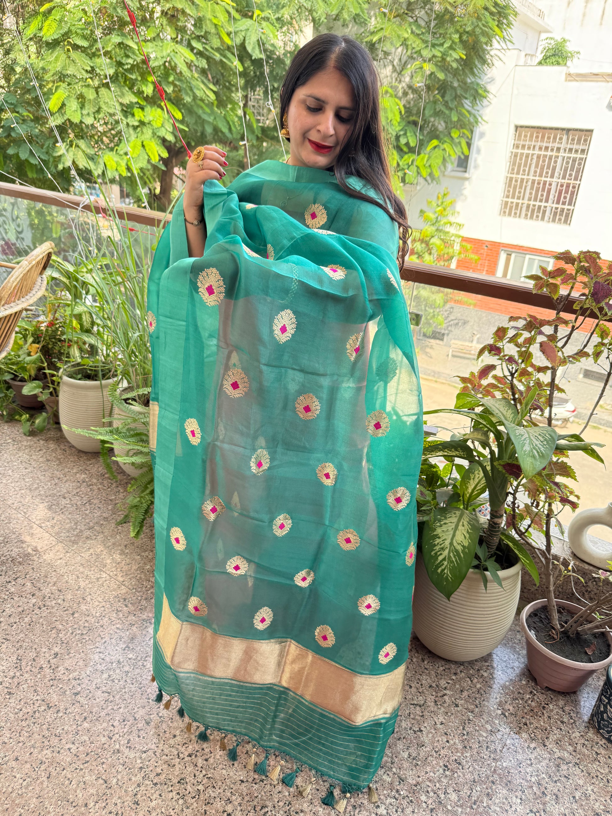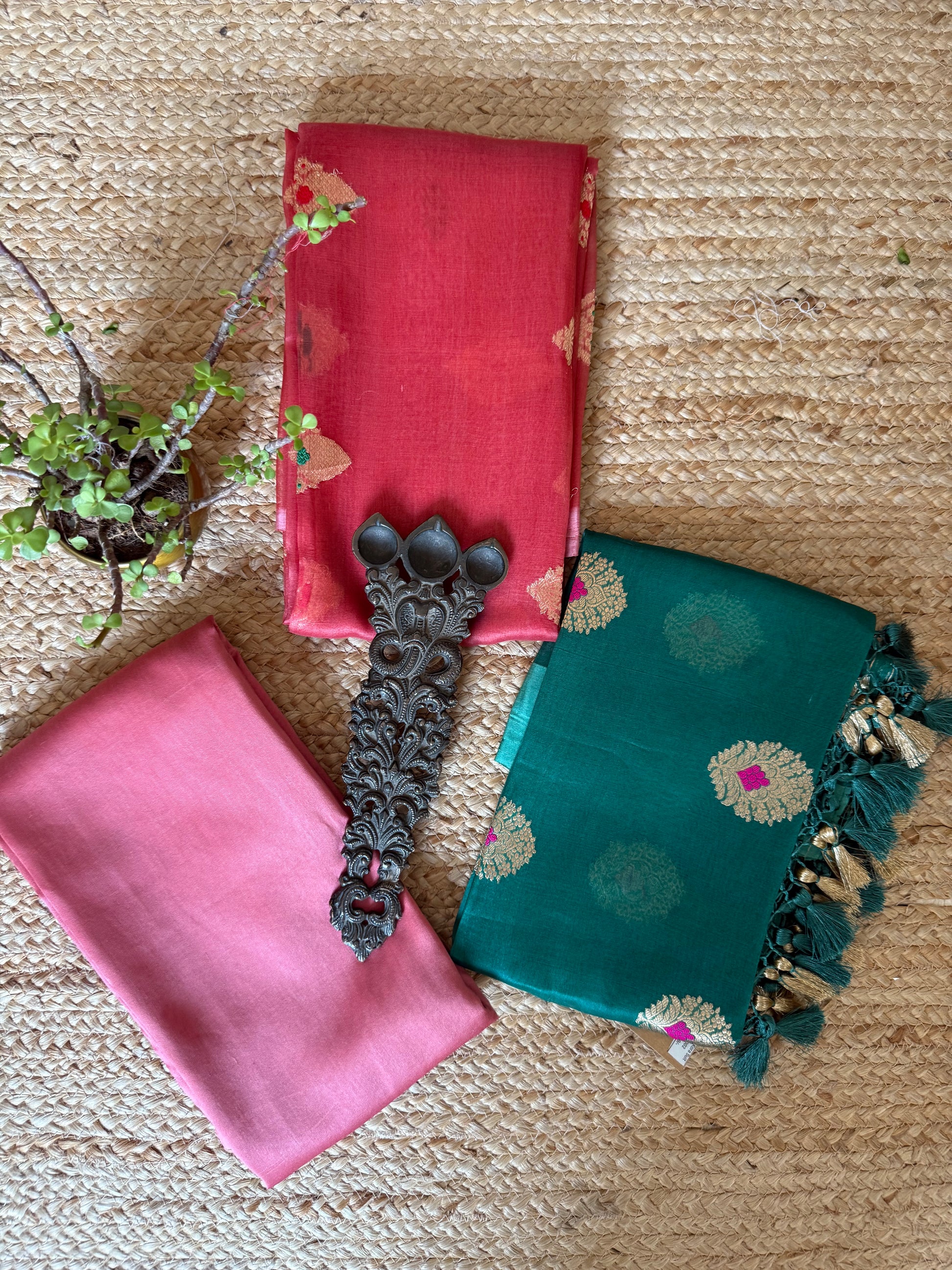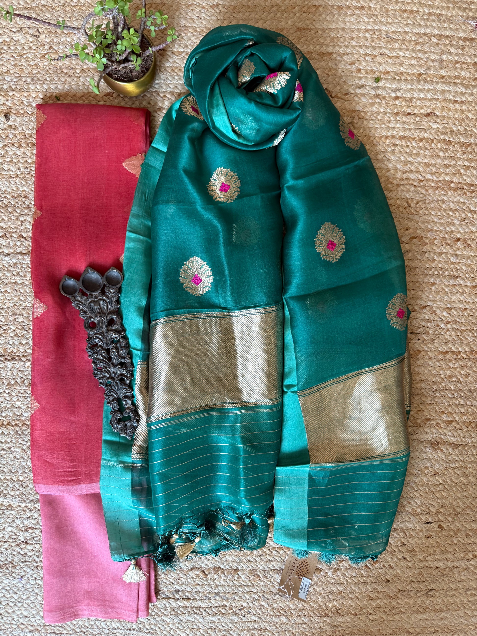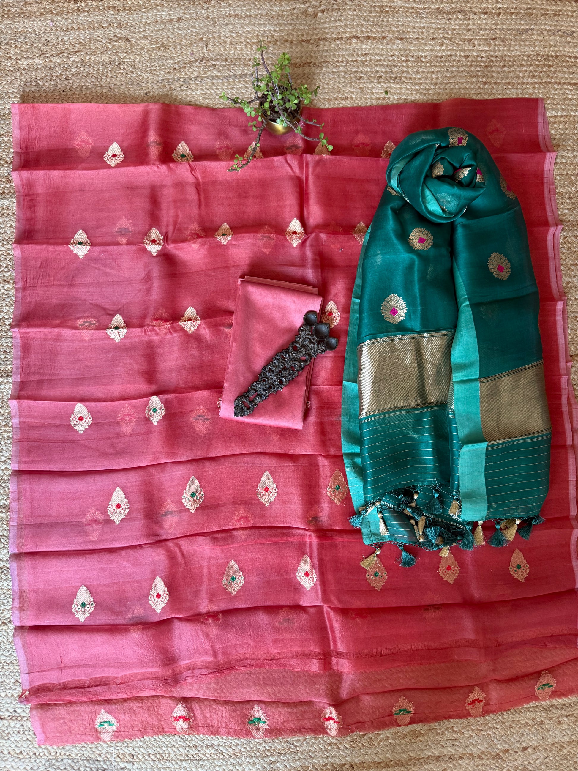 Brink pink Kora silk certified handloom Banarsi kadwa Booti three piece suit