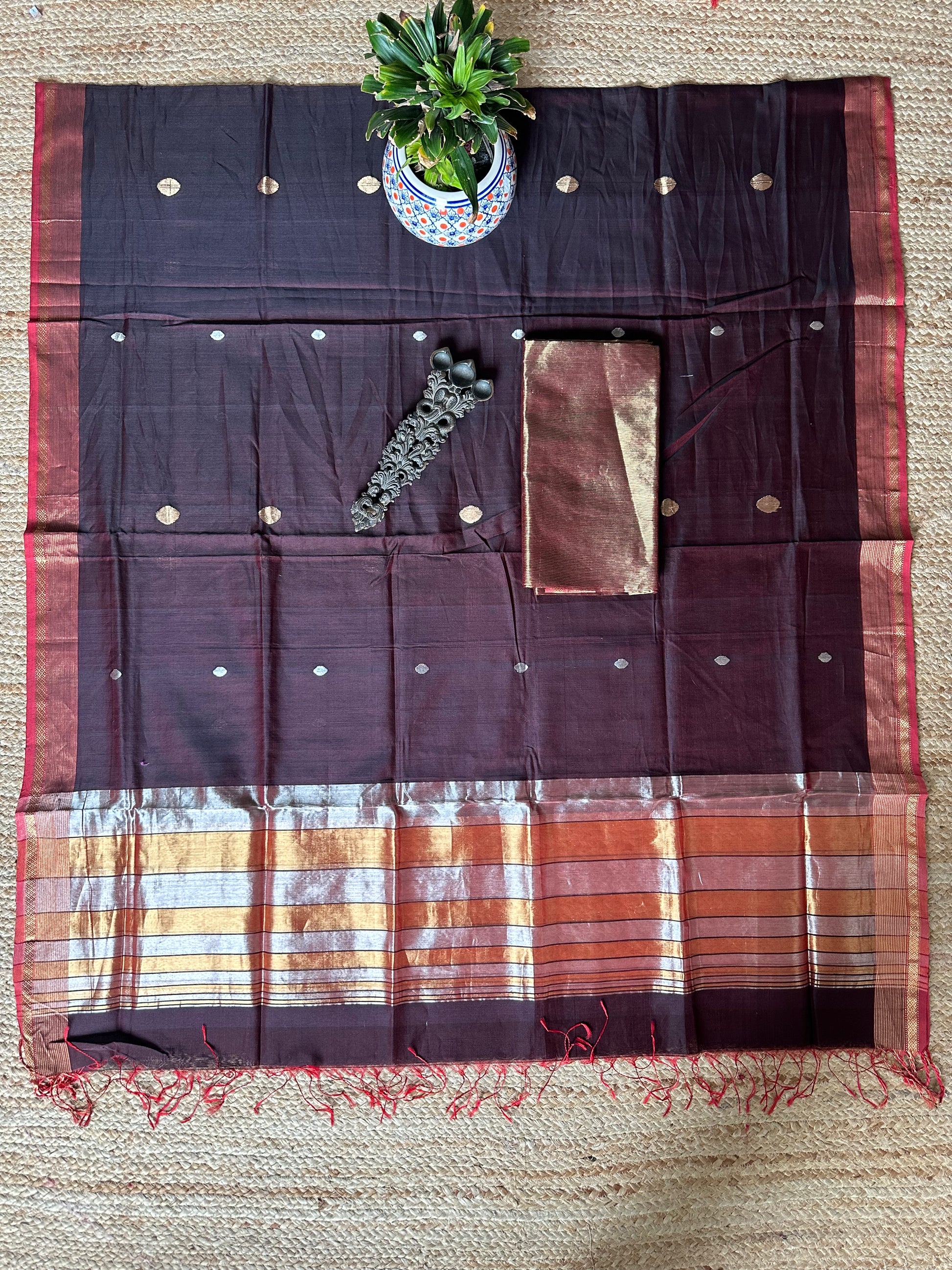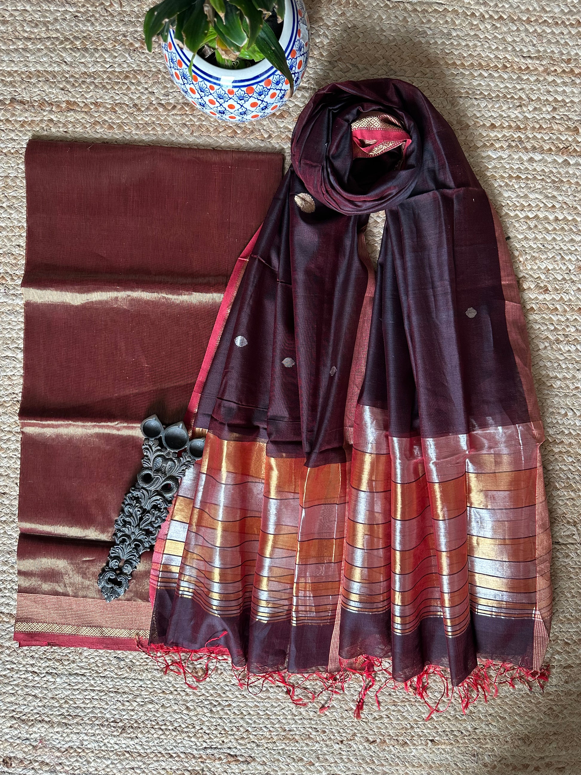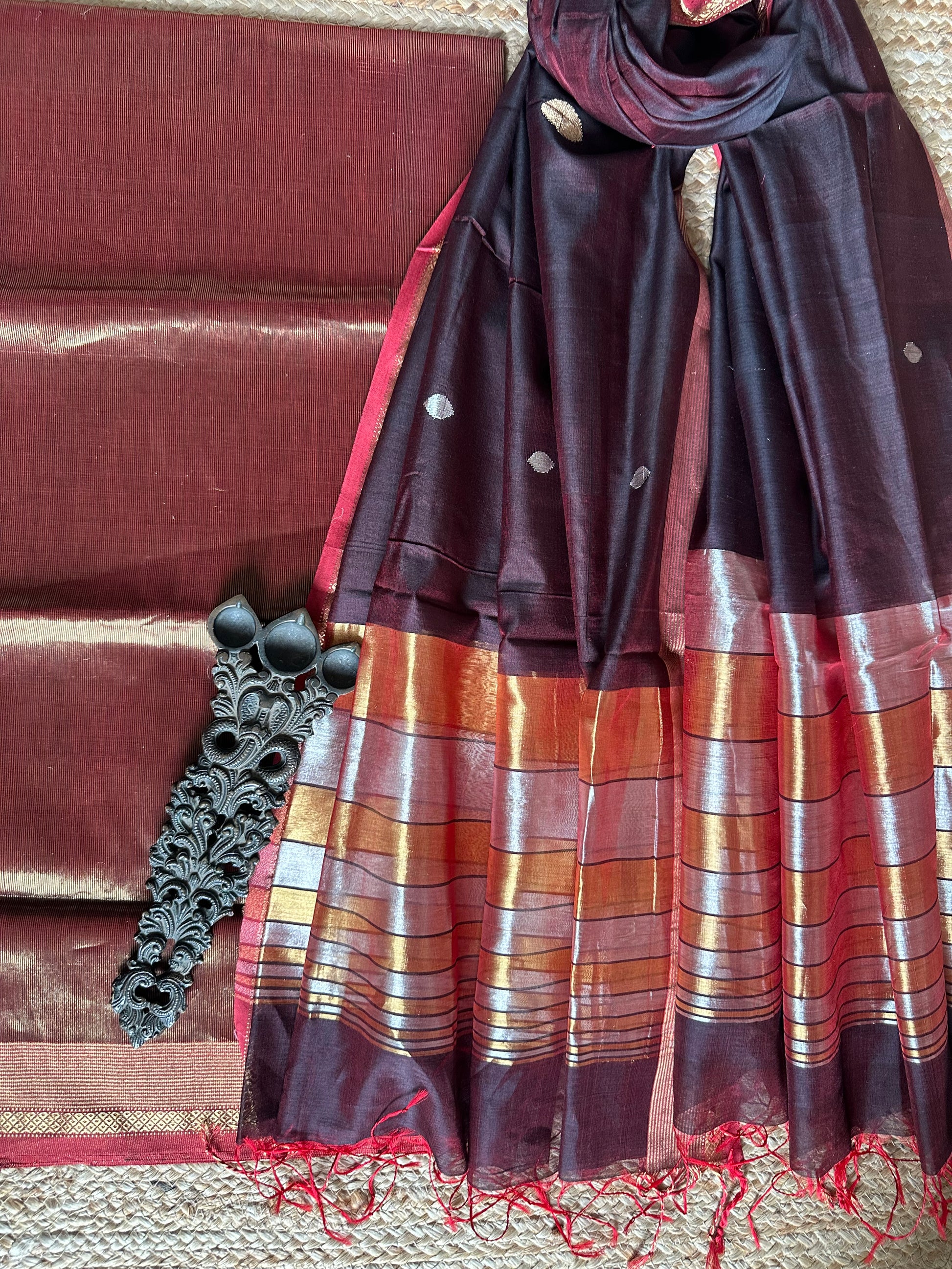 | DARK MAROON GOLDEN MAGENTA MAHESHWARI SILK HANDLOOM SUIT WITH ZARI WOVEN SILK DUPATT