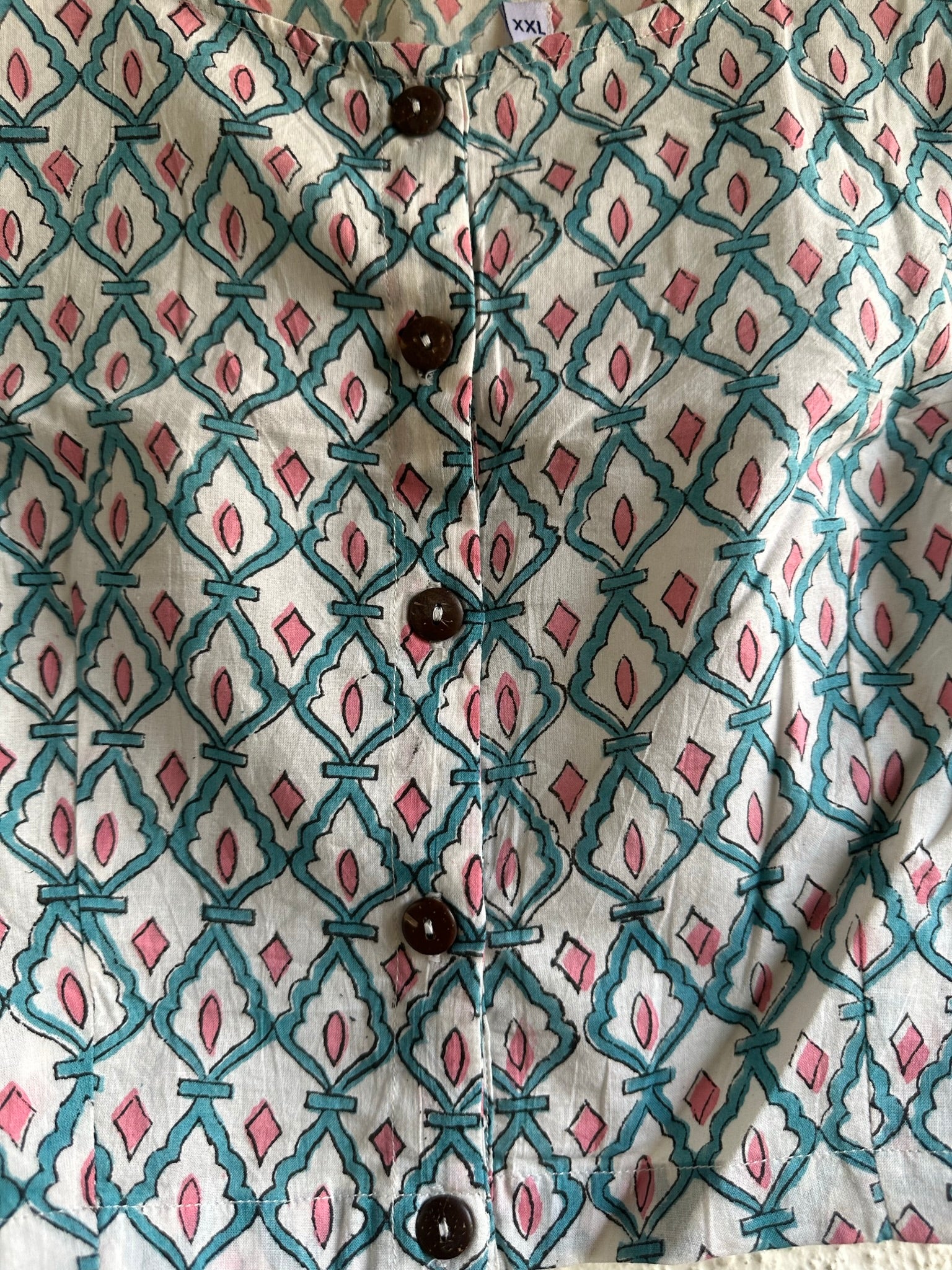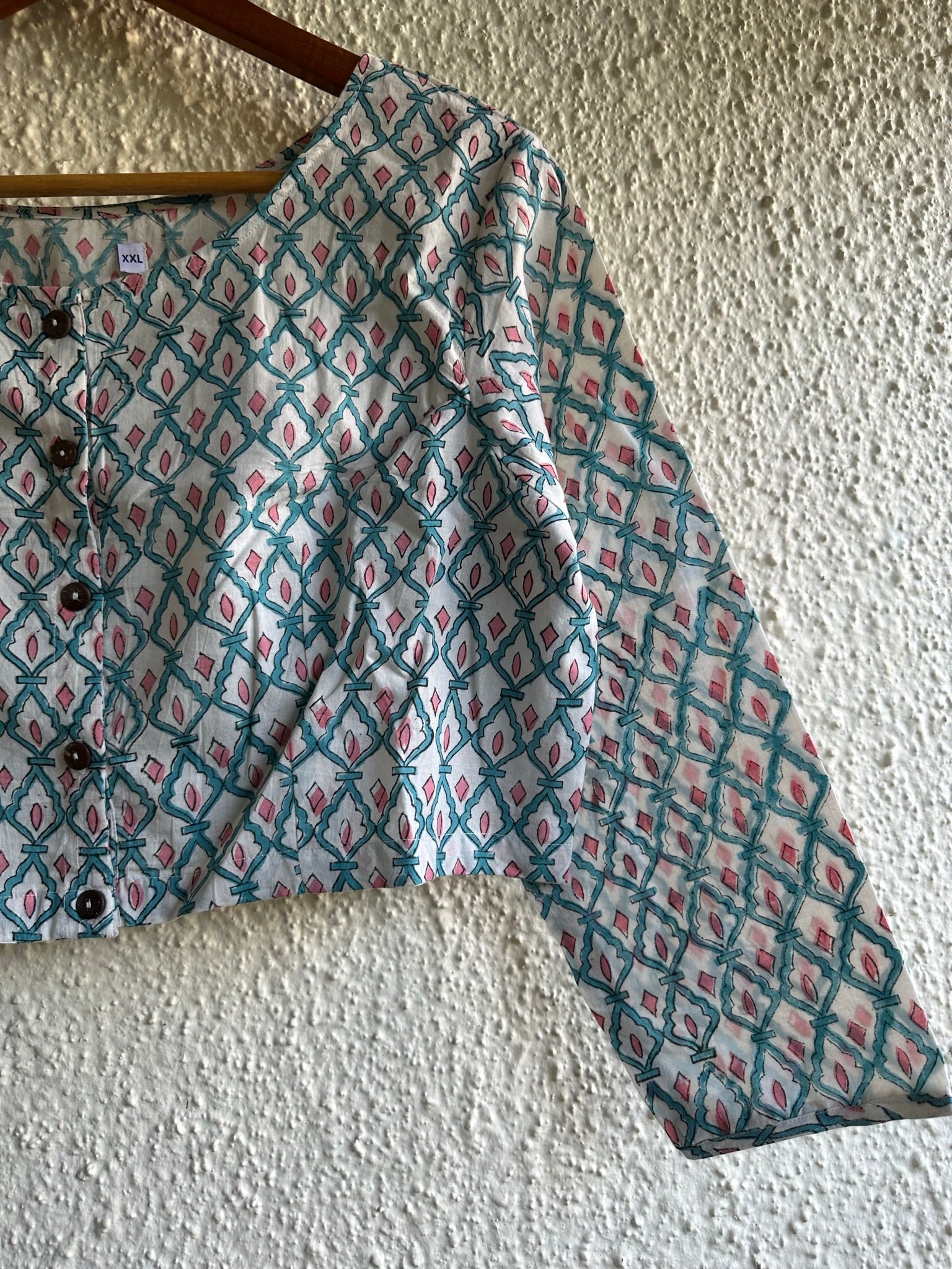WHITE AND SEA GREEN COTTON BLOUSE WITH WOODEN BUTTON