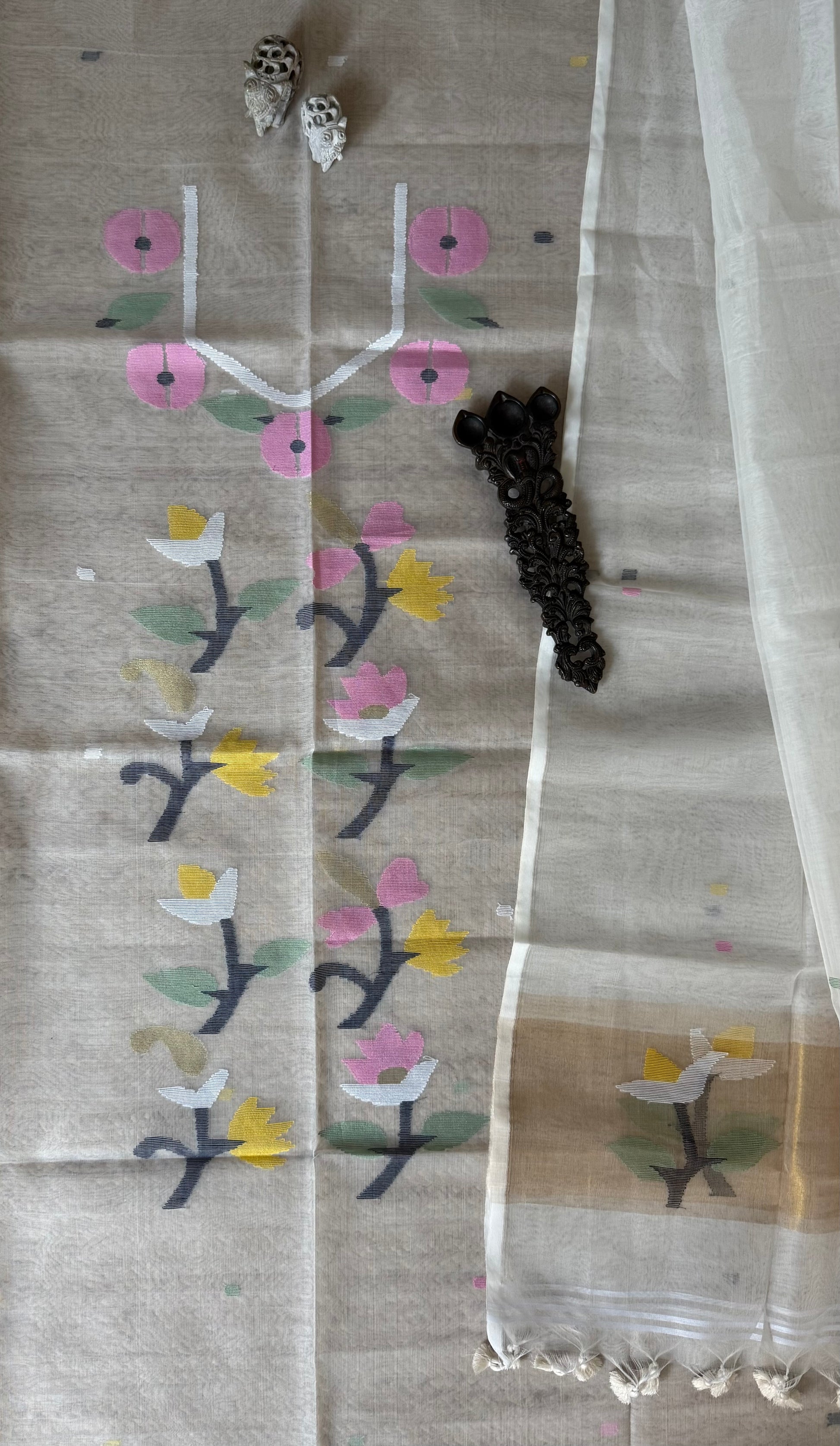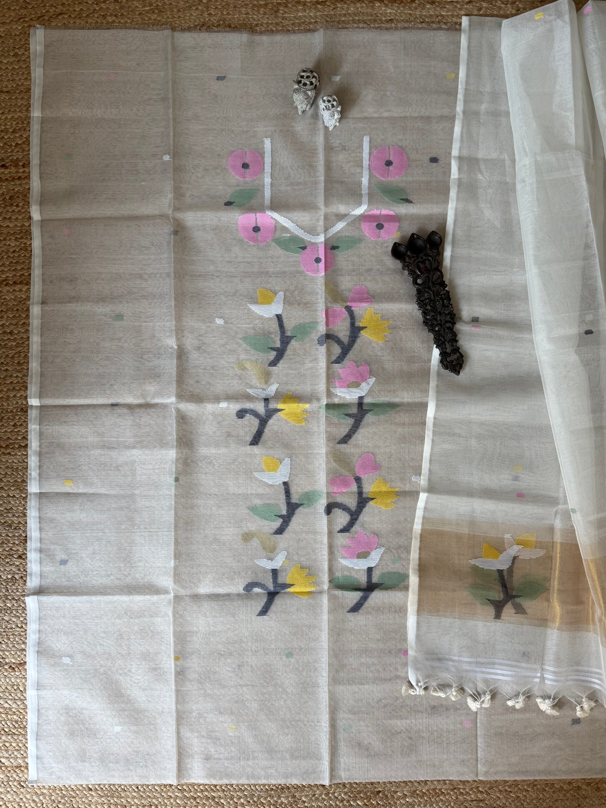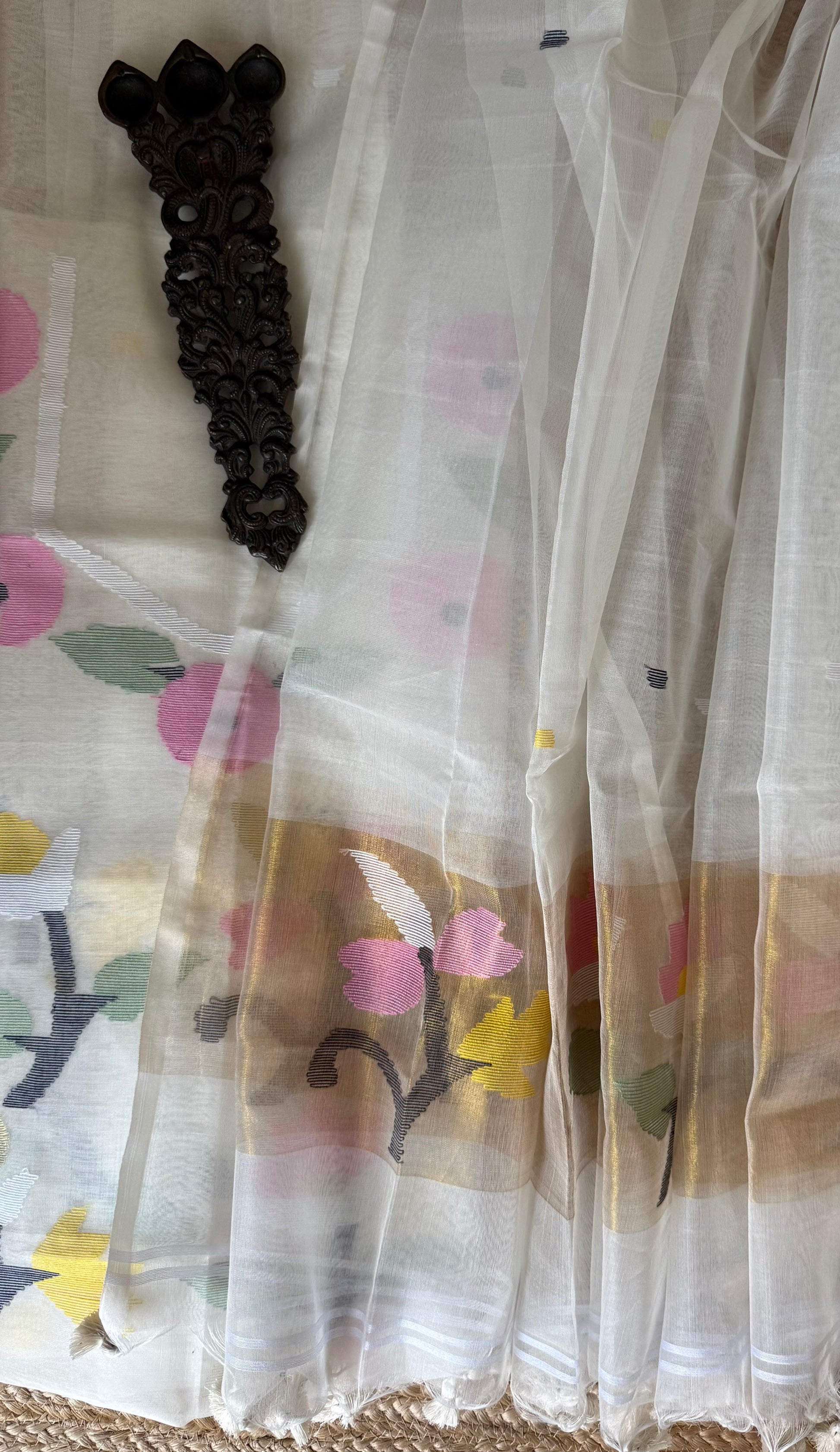 | ALL WHITE handwoven pure muslin silk kurta with resham jamdani muslin dupatta with handmade tassels fabric: 2.5 mtrs meter dupatta : 2.5 mtrs * 35'' slight difference in shade could be due to camera & lights. embrace the imperfection !! happy handloom dry clean only |