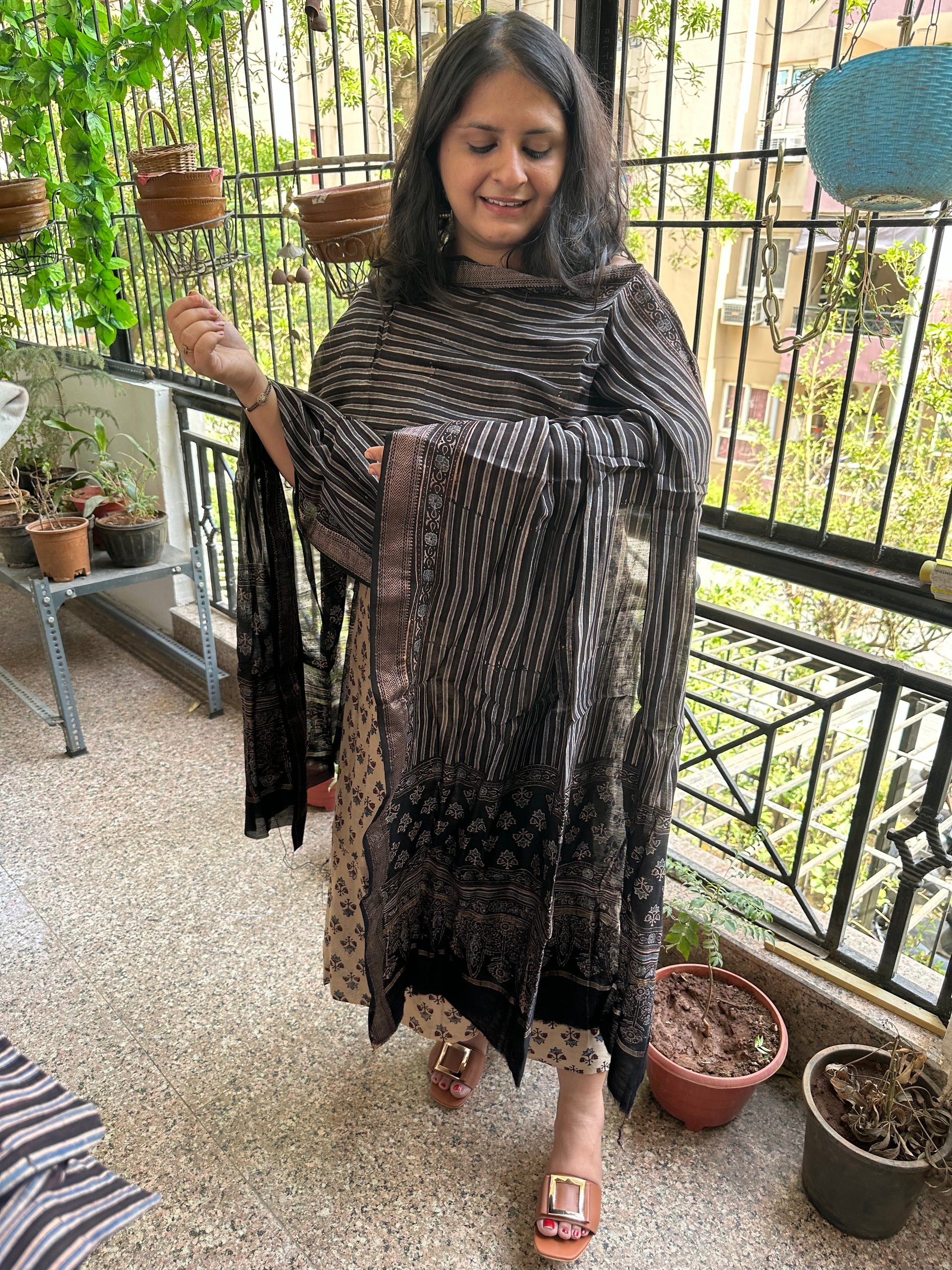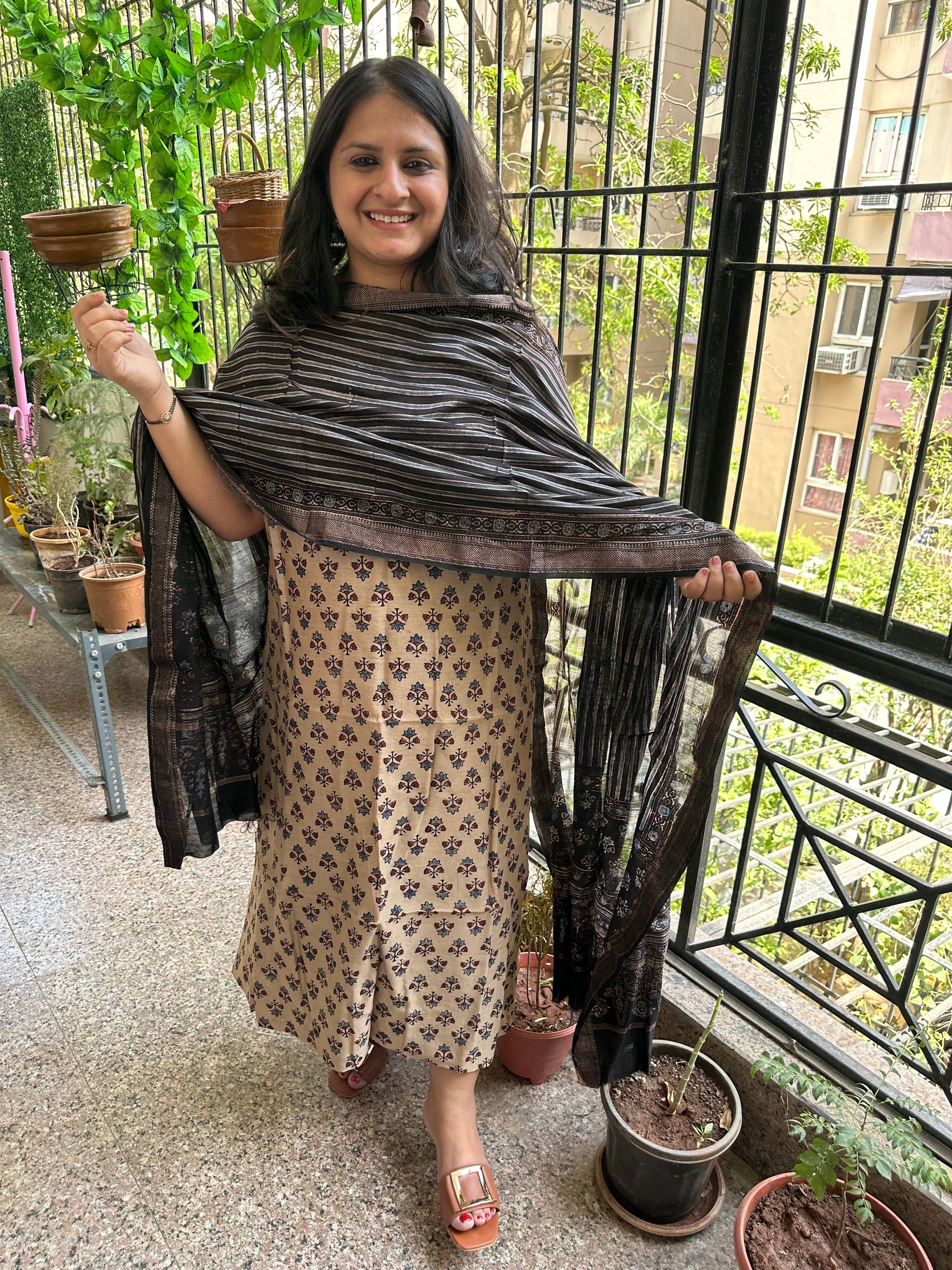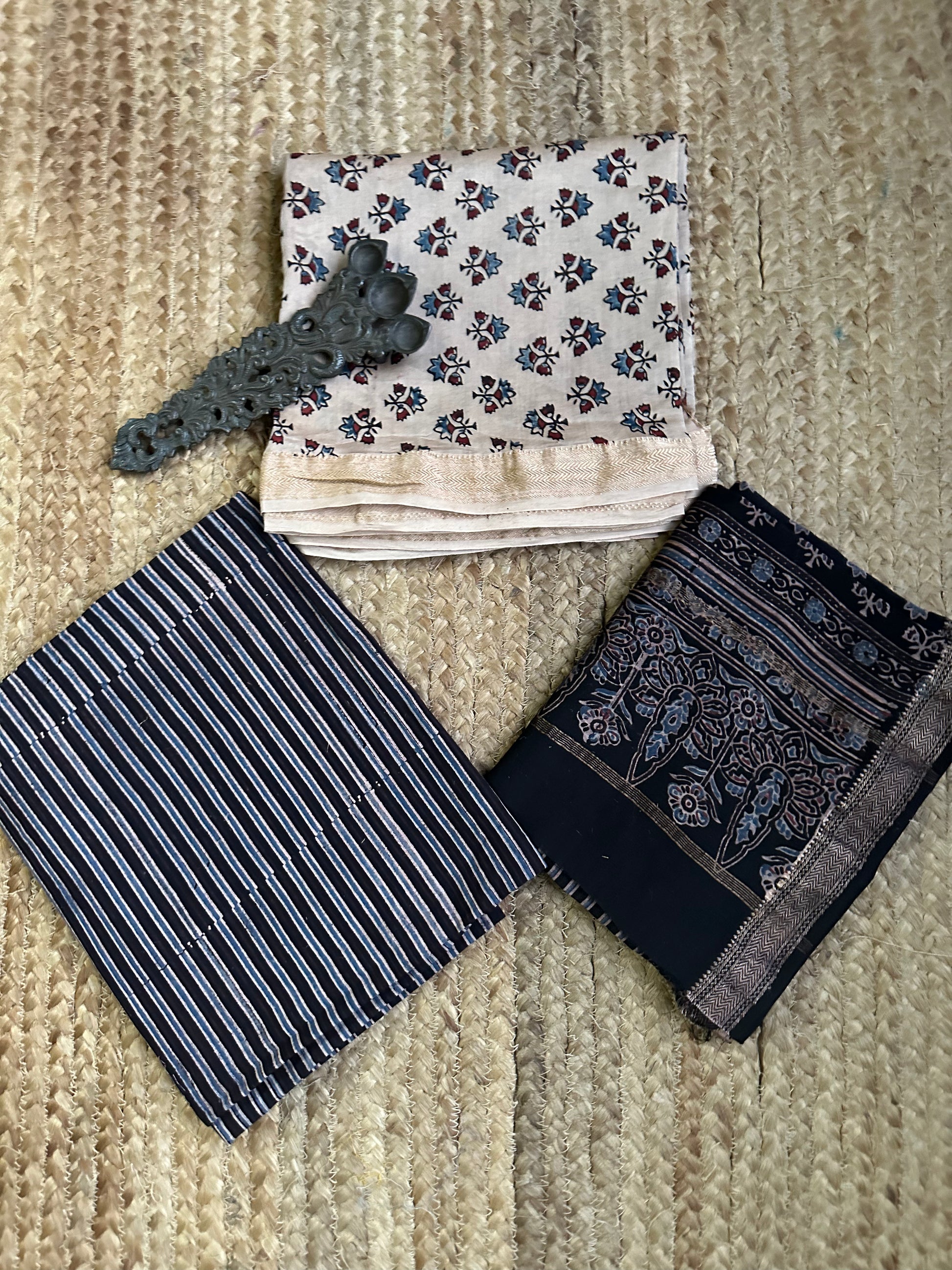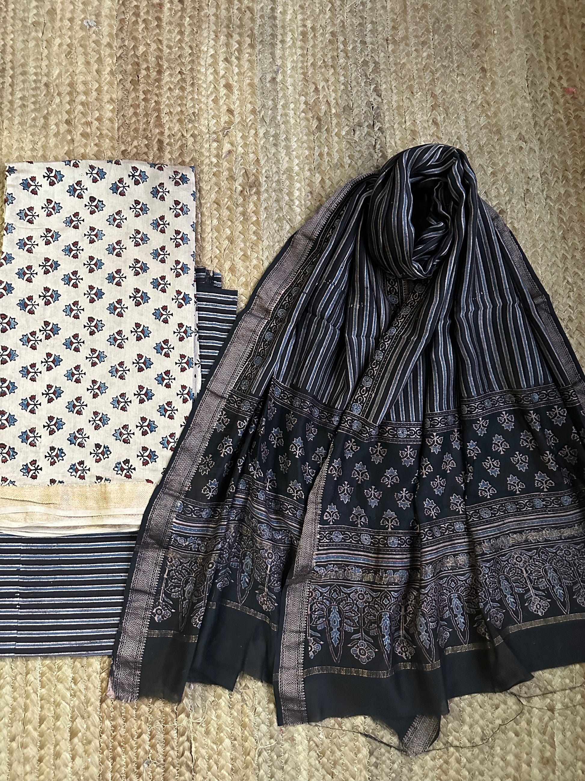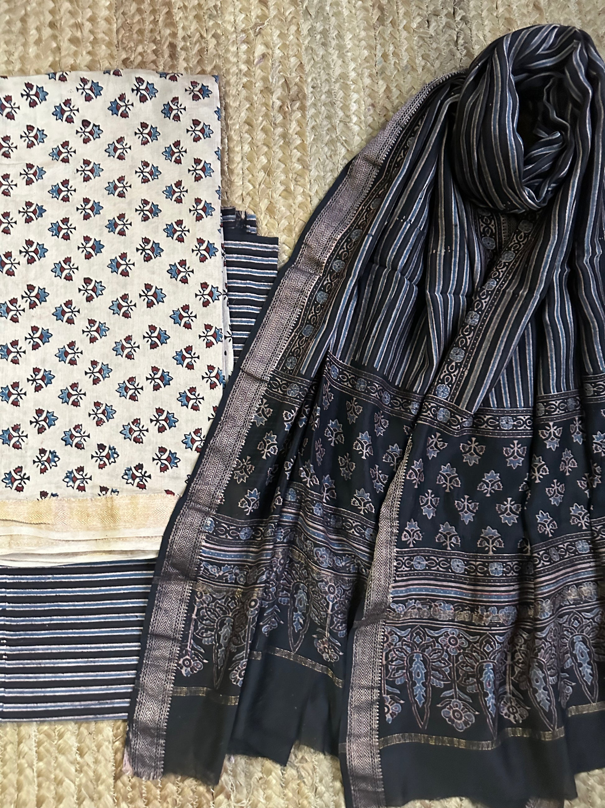 BEIGE AJRAKH MAHESHWARI SILK HANDBLOCK THREE PIECE  SET SUIT