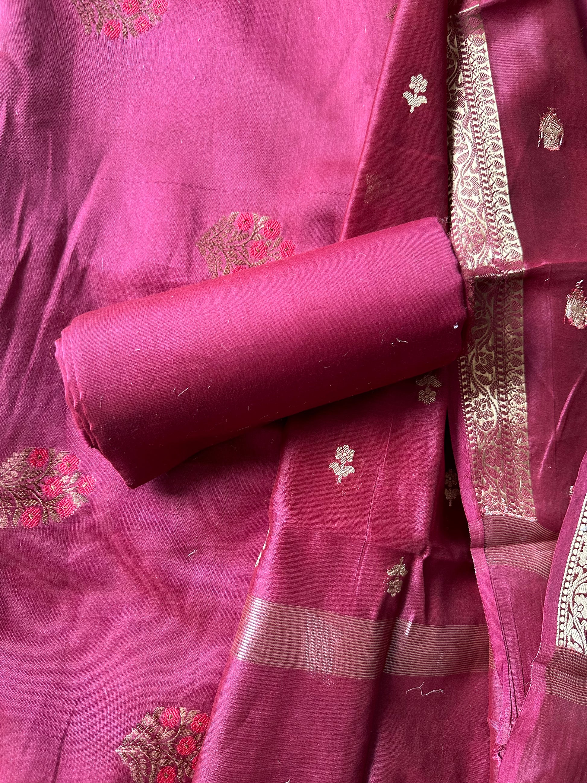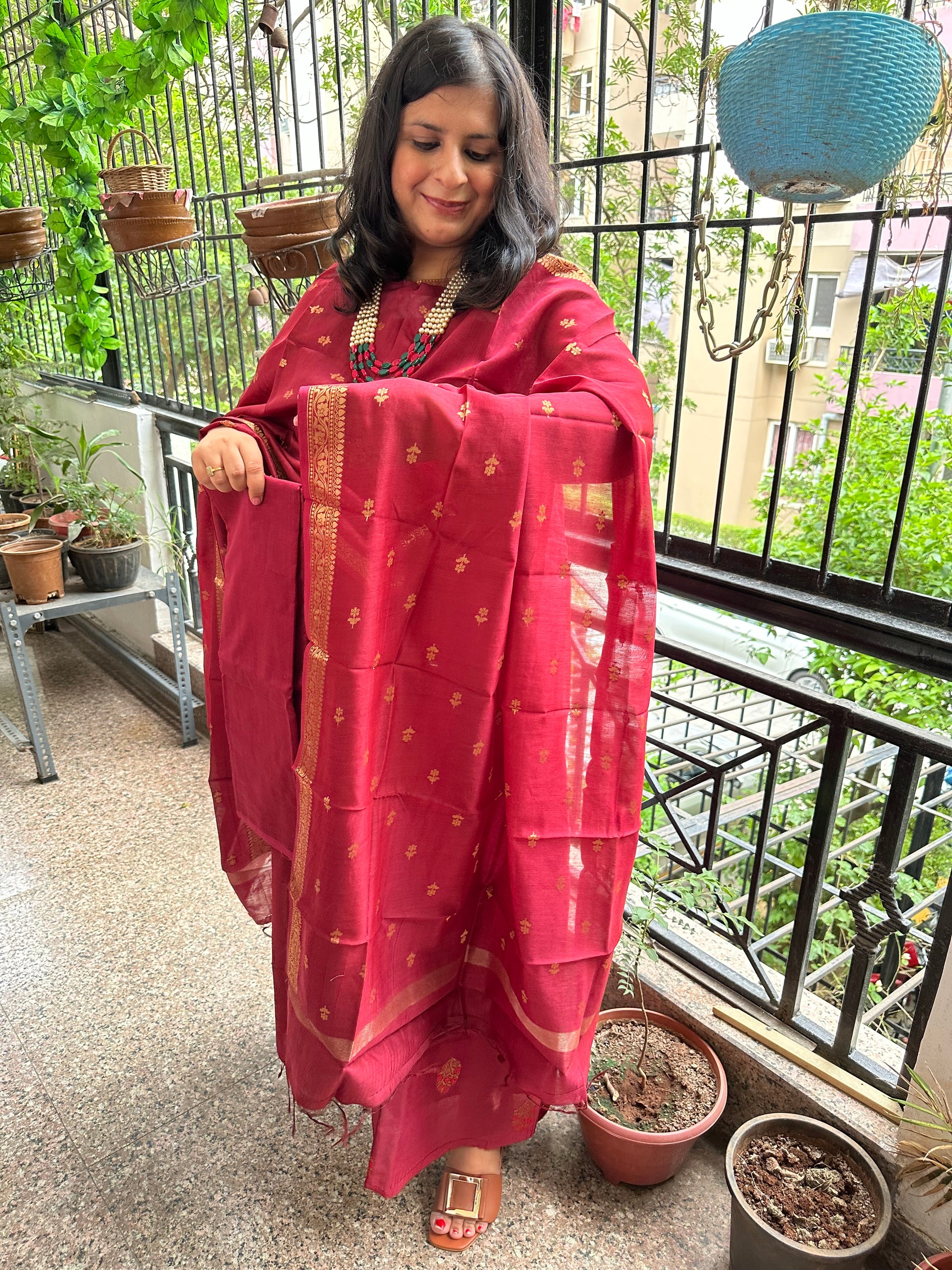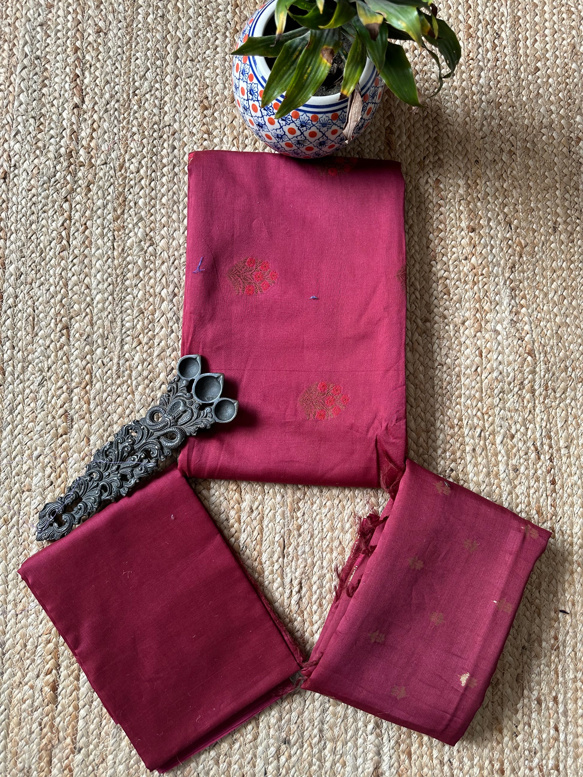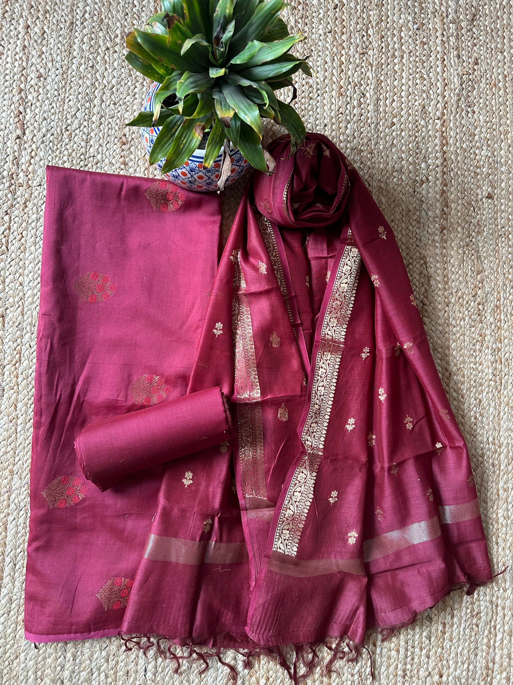 Maroon Chanderi handloom Banarsi Booti three piece suit
