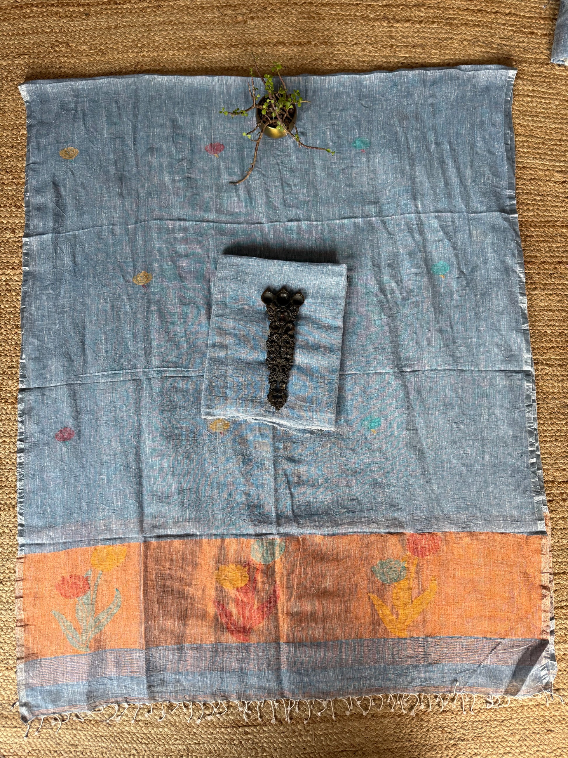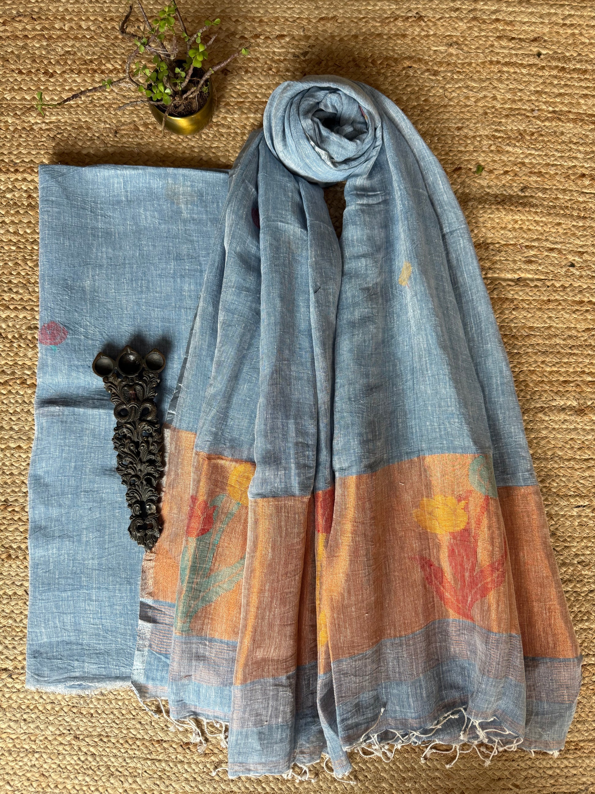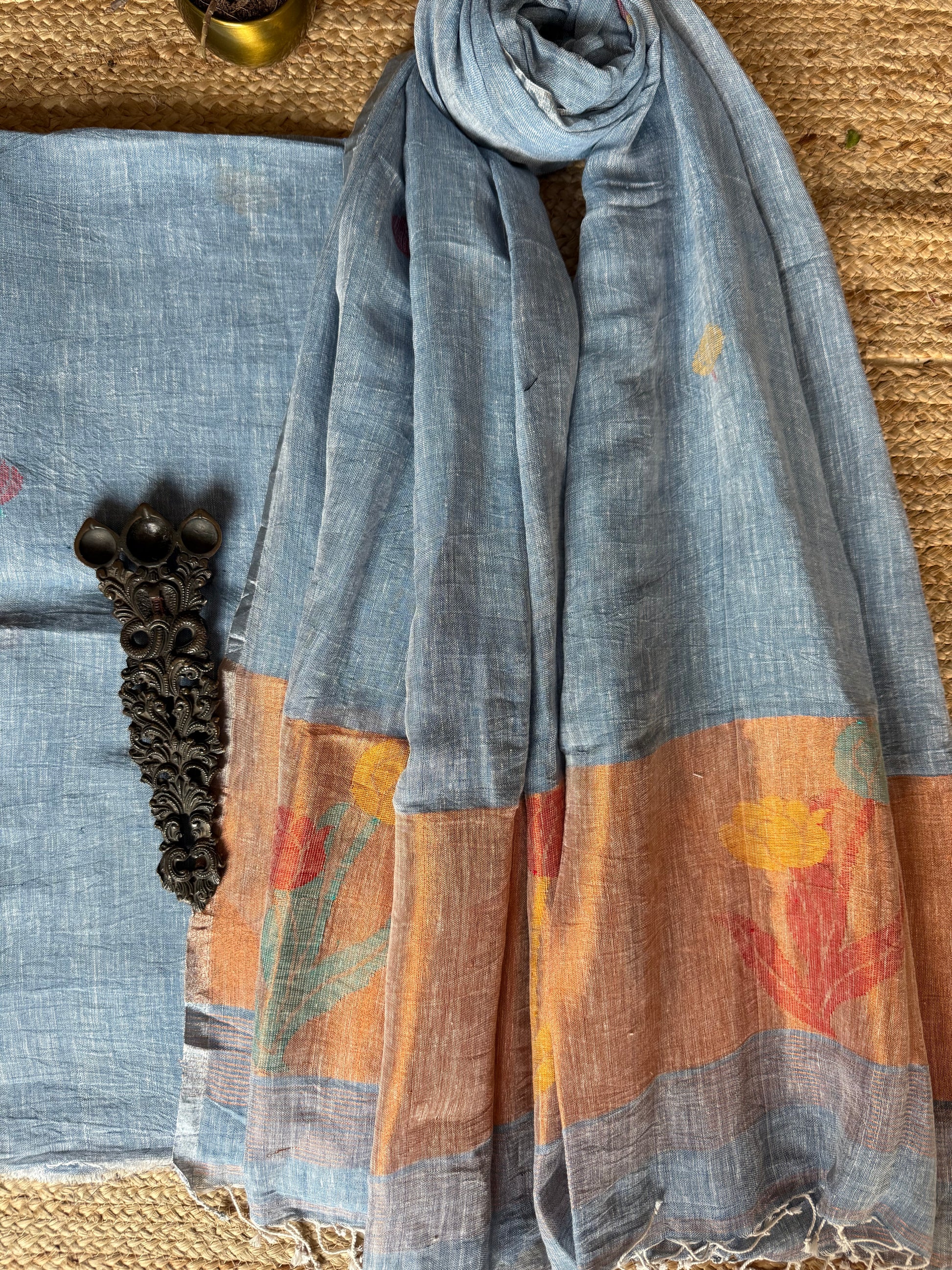SAPPHIRE BLUE JAMDANI WOVEN LINEN  KURTA SET WITH HAND EMBROIDERY JAMDANI DUPATTA