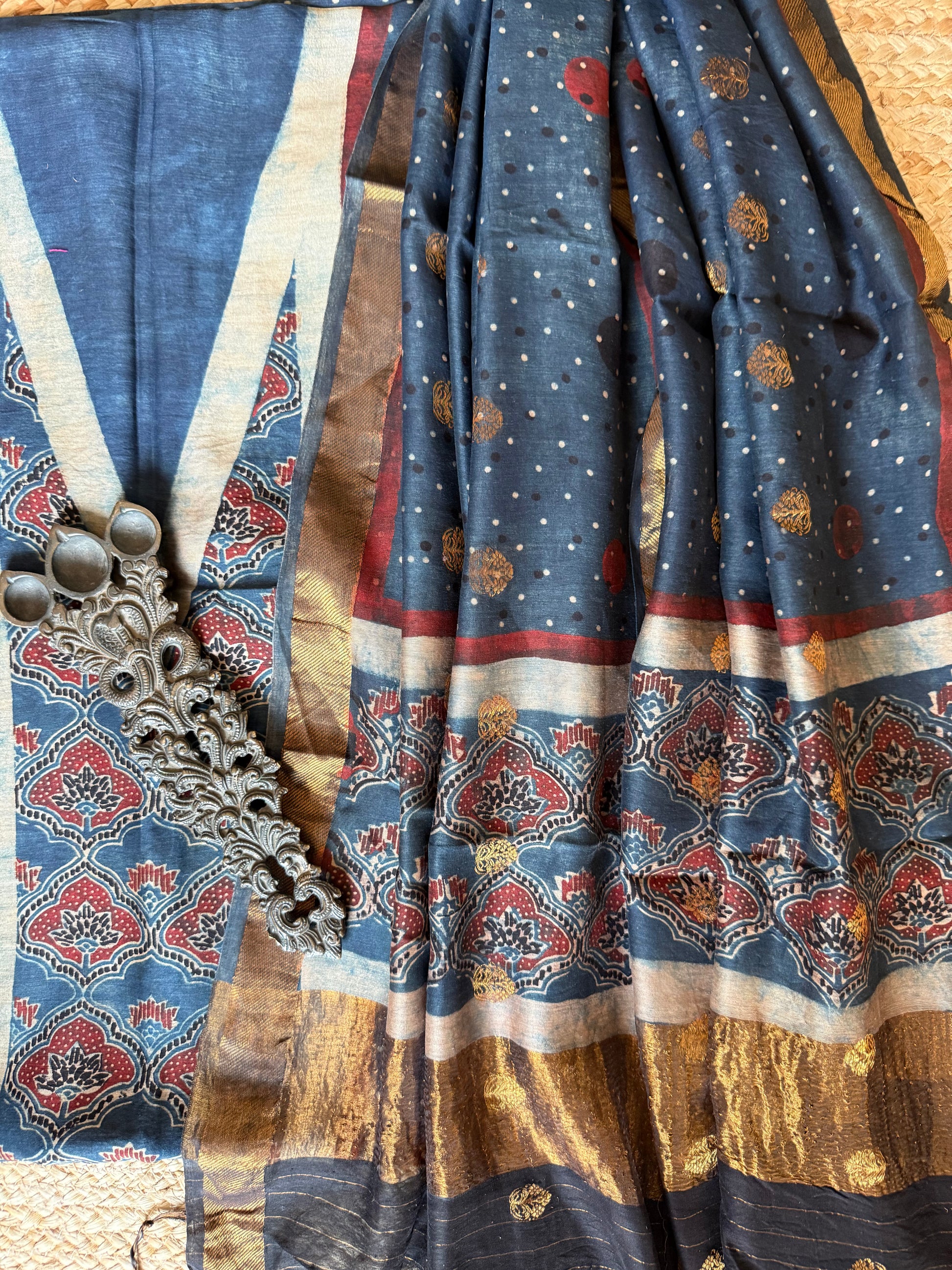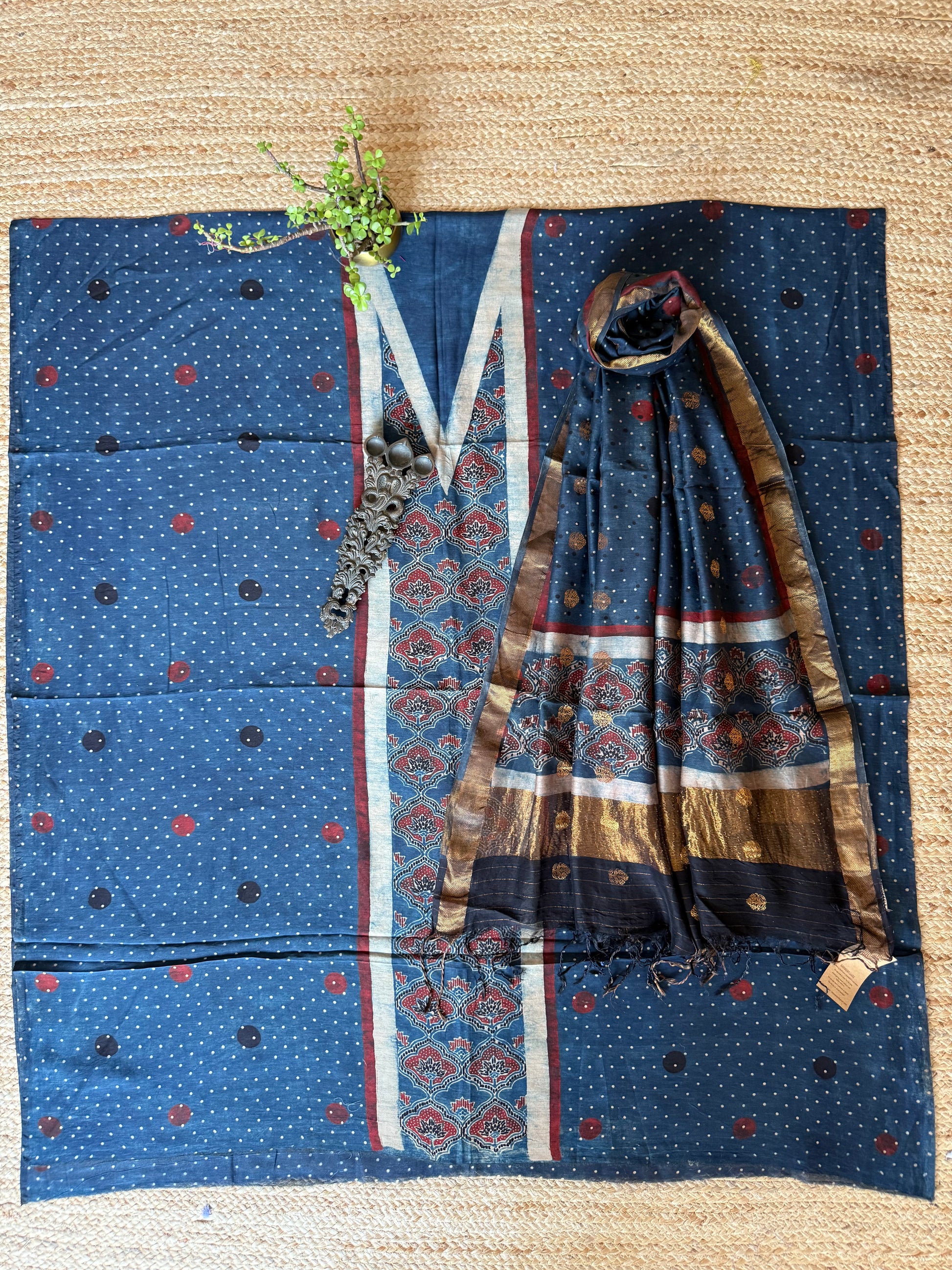 INDIGO BLUE CONTEMPORARY CHANDERI HAND BLOCK KURTA WITH CHANDERI SILK AJRAKH HAND CRAFTED COIN BUTTA DUPATTA WITH ZARI BORDER