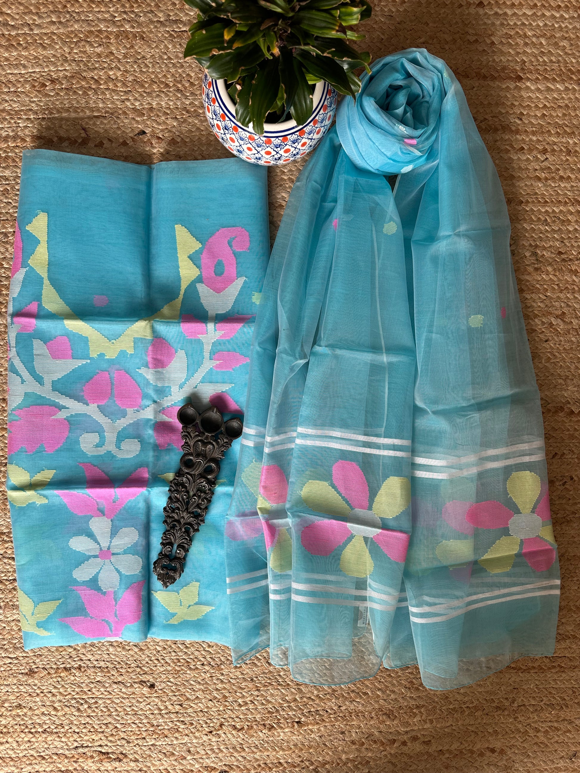 CYAN BLUE HANDWOVEN JAMDANI PURE MUSLIN SILK KURTA SET MJK-71