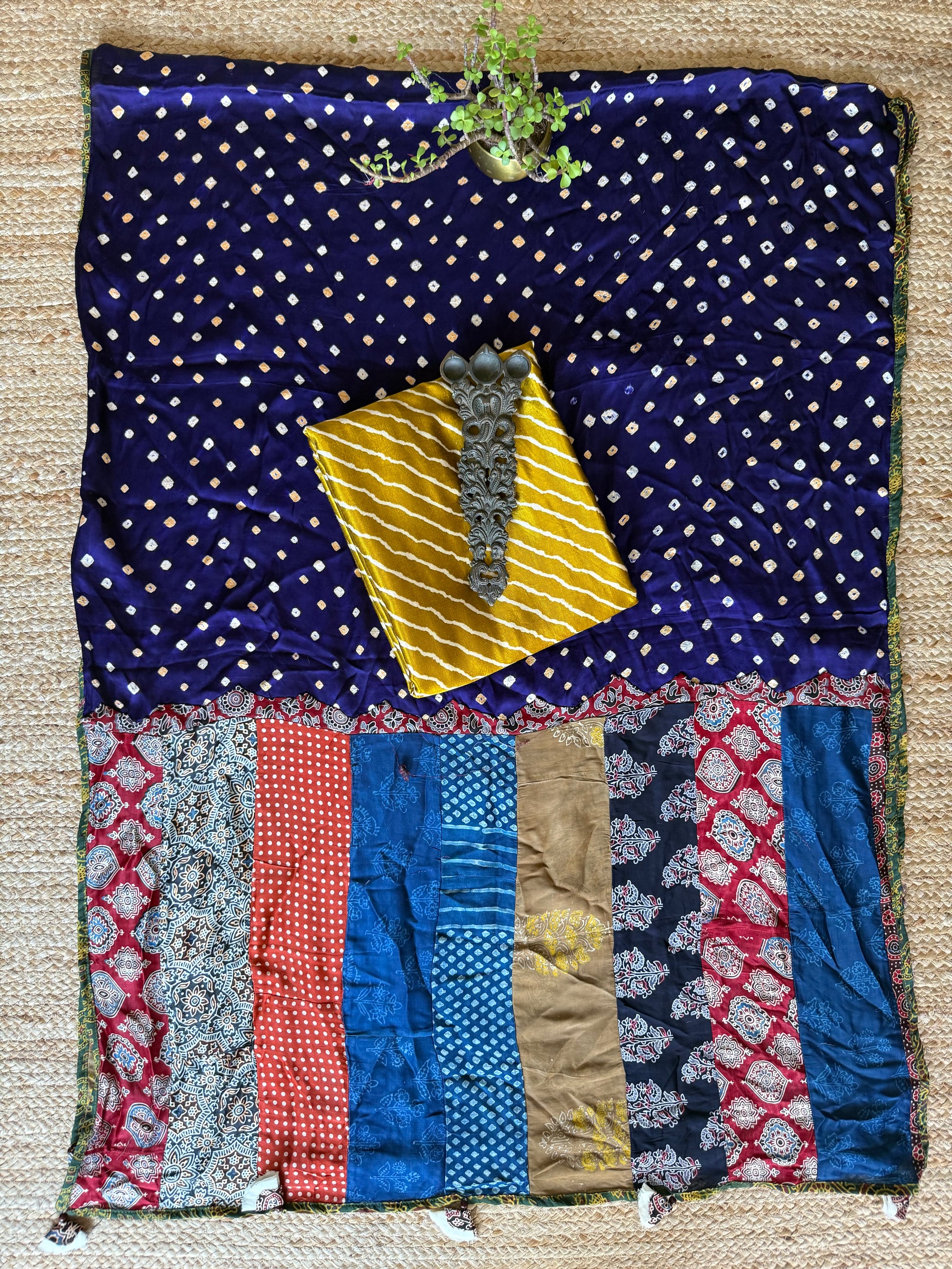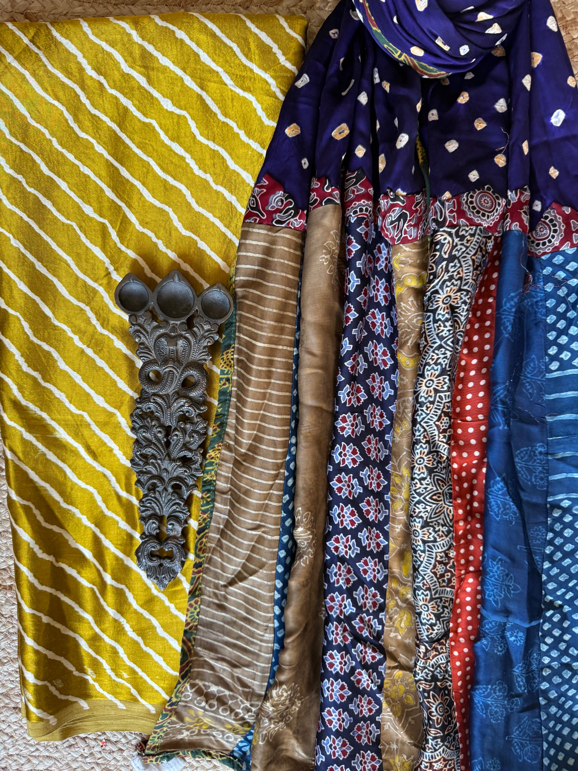 MUSTARD MASHRU SILK KURTA WITH AJRAKH PATCHWORK HANDCRAFTED BANDHANI MODAL SILK DUPATTA