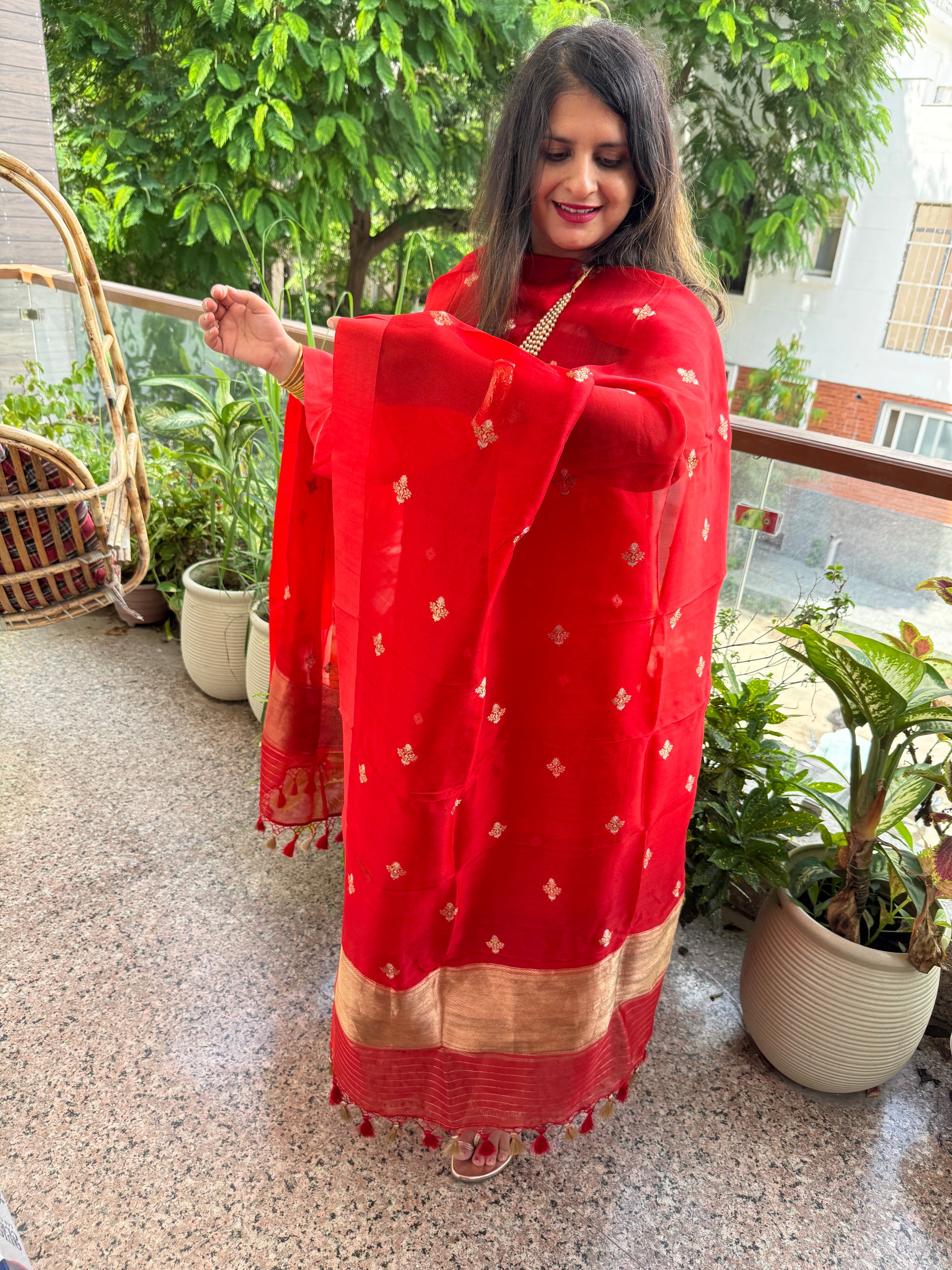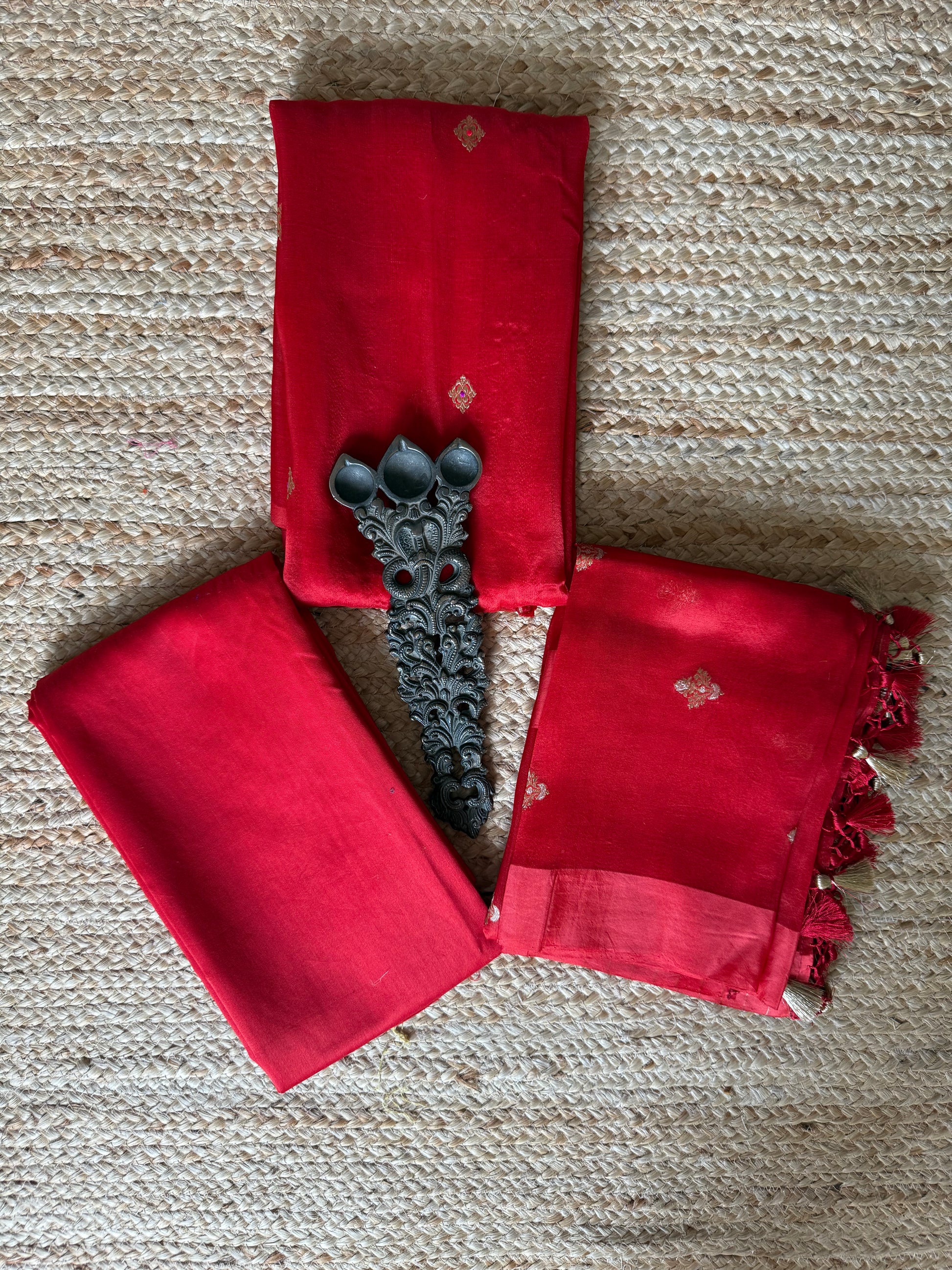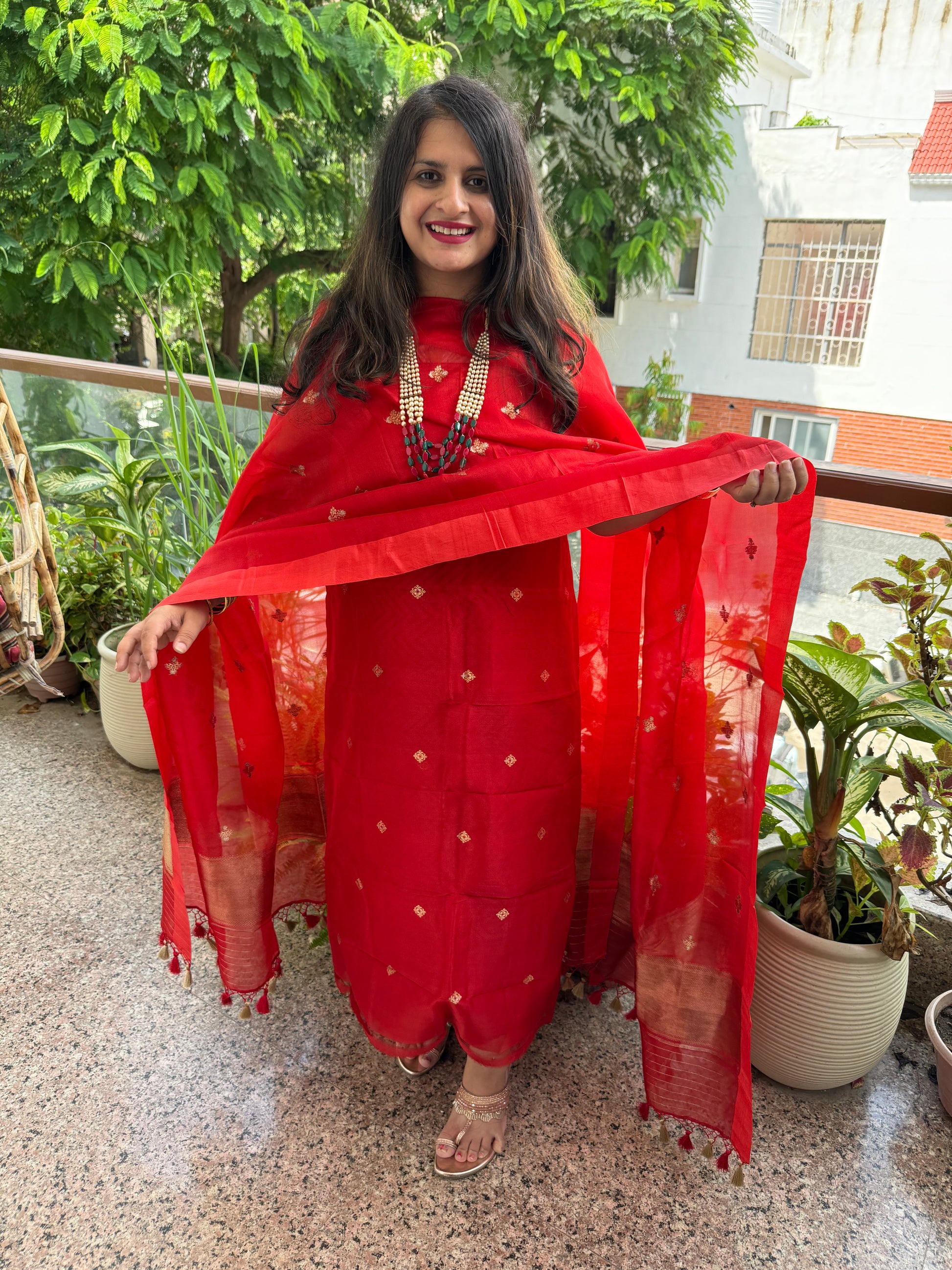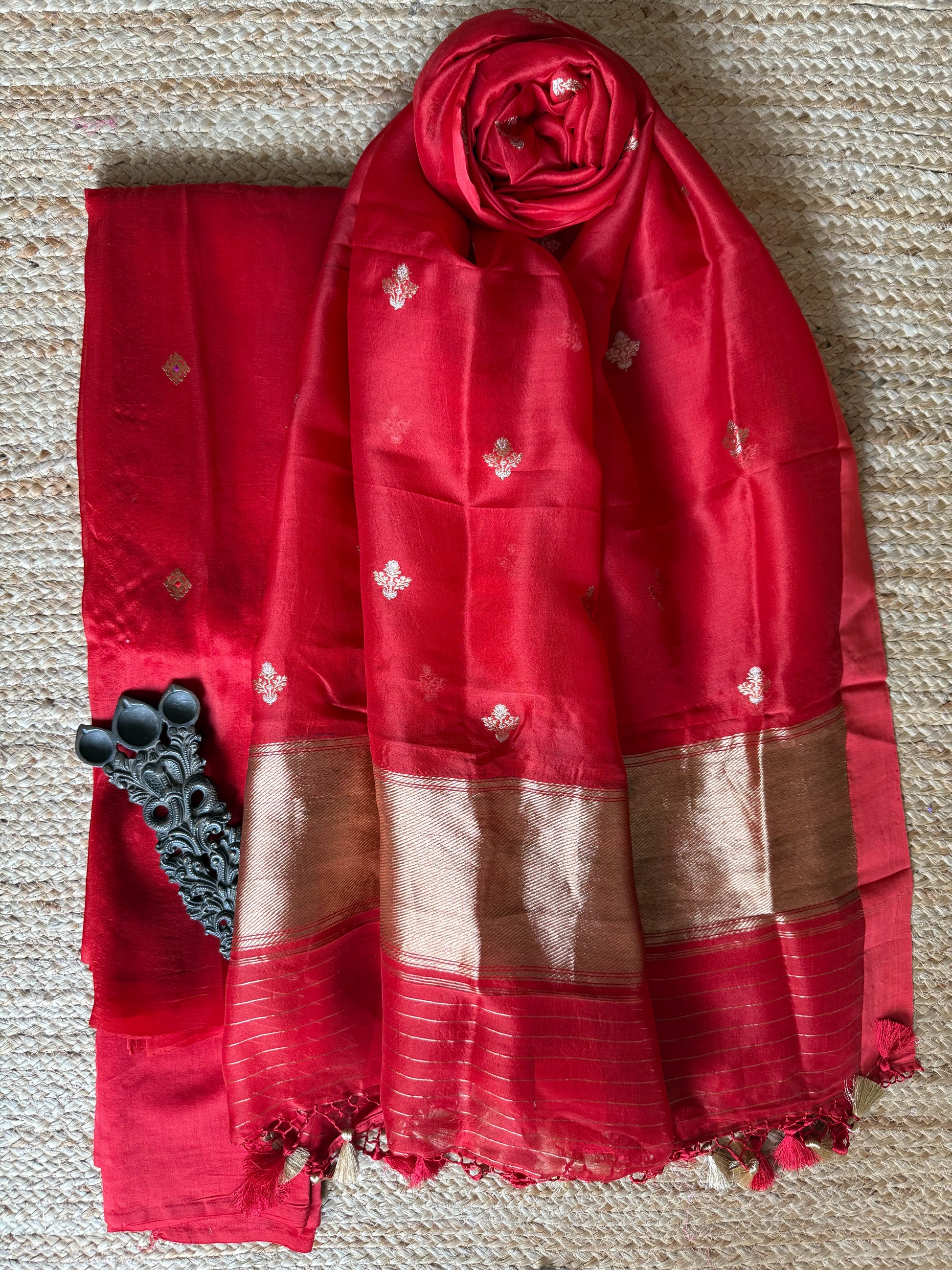 Red Kora silk certified handloom Banarsi kadwa Booti three piece suit