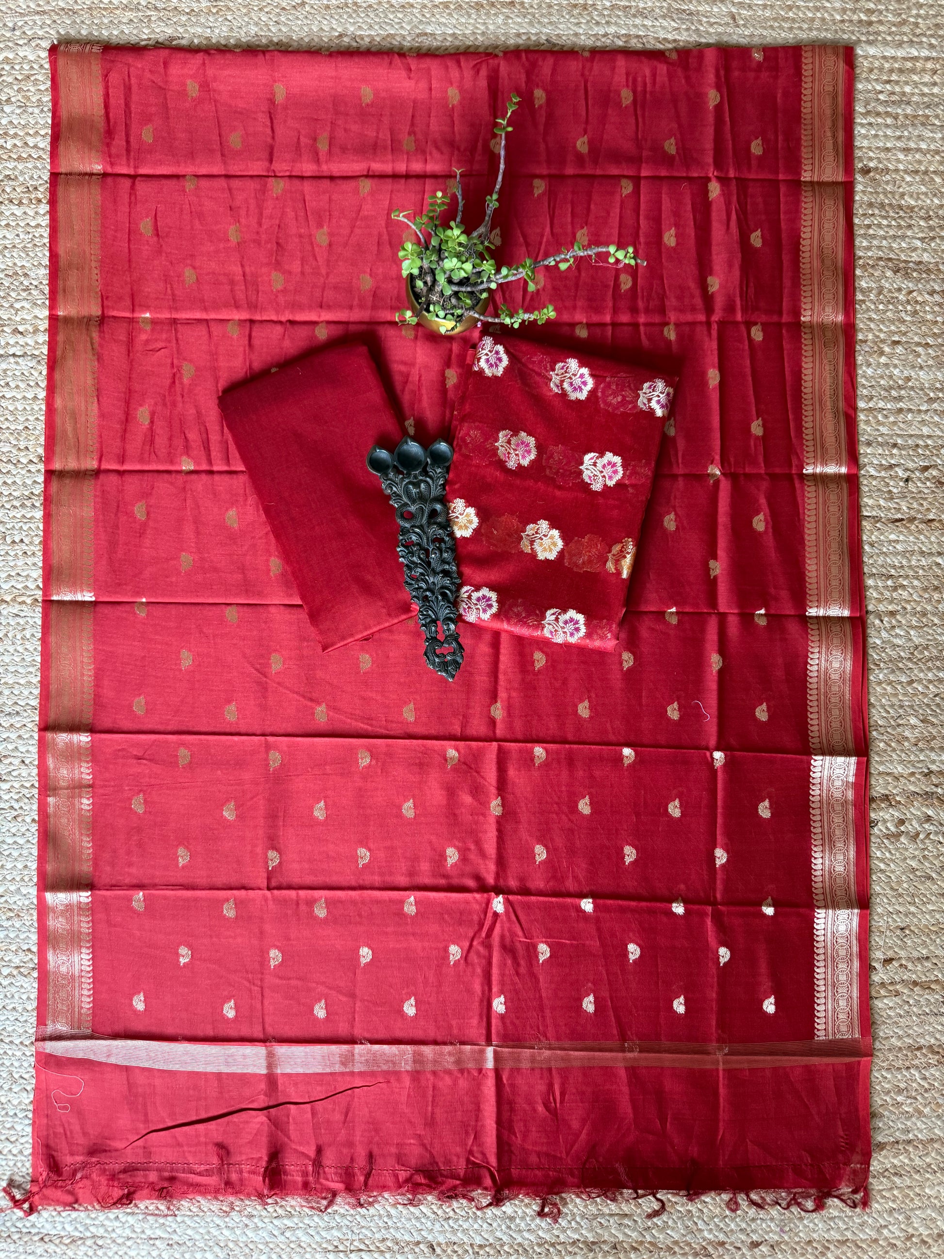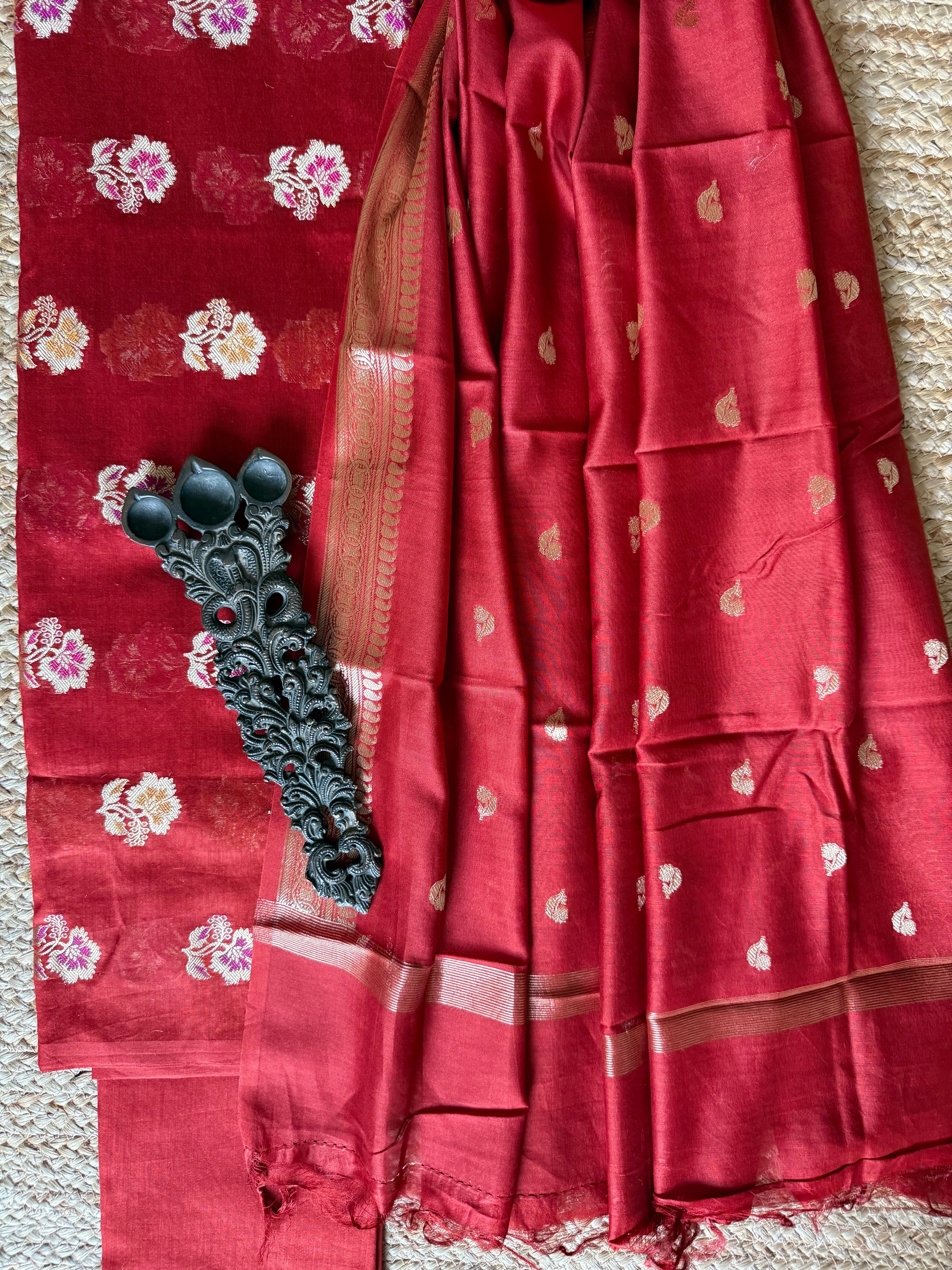 RUBY RED CHANDERI HANDLOOM 3 PIECE SUIT SETS The dupatta is CHANDERI with Banarsi border FABRIC: 2.5 MTRS METER BOTTOM:2.5 MTS DUPATTA: 2.5 MTRS * 35'' A SLIGHT DIFFERENCE IN SHADE COULD BE DUE TO THE CAMERA & LIGHTS. EMBRACE THE IMPERFECTION !! HAPPY HANDLOOM DRY CLEAN ONLY |