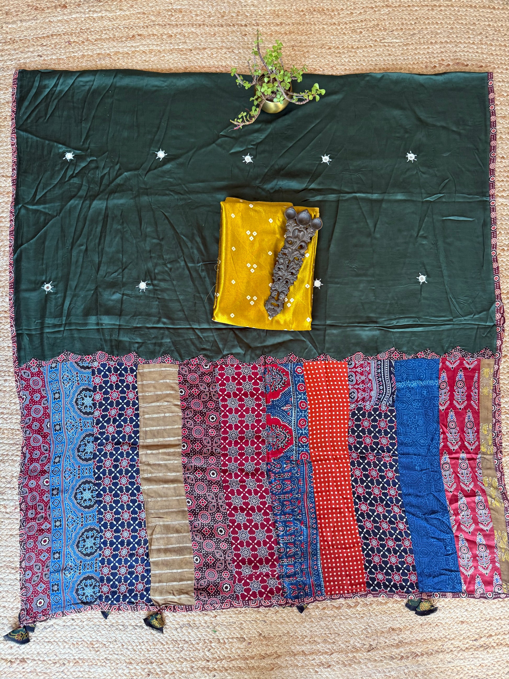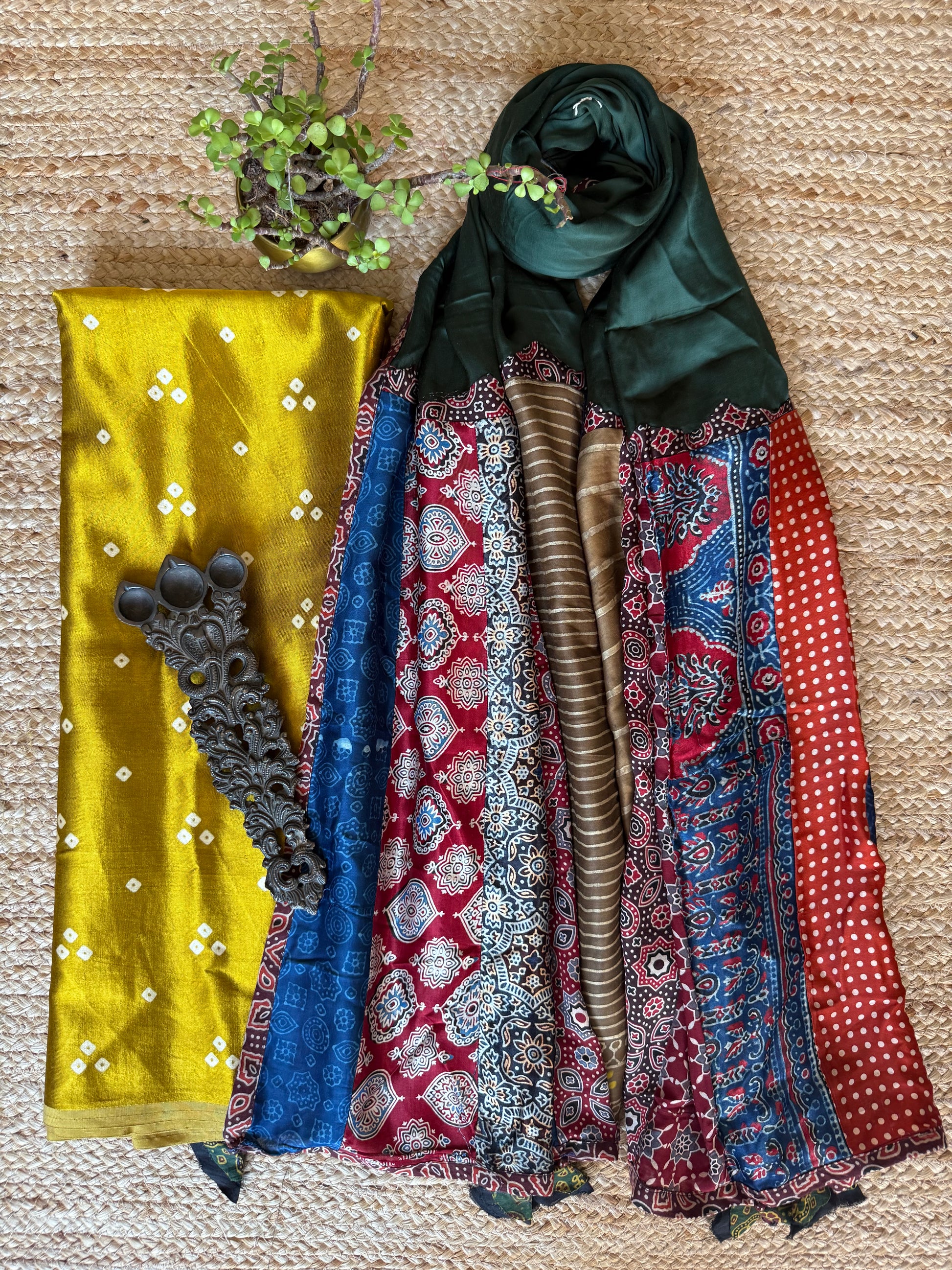 MUSTARD MASHRU SILK KURTA WITH AJRAKH PATCHWORK HANDCRAFTED BANDHANI MODAL SILK DUPATTA