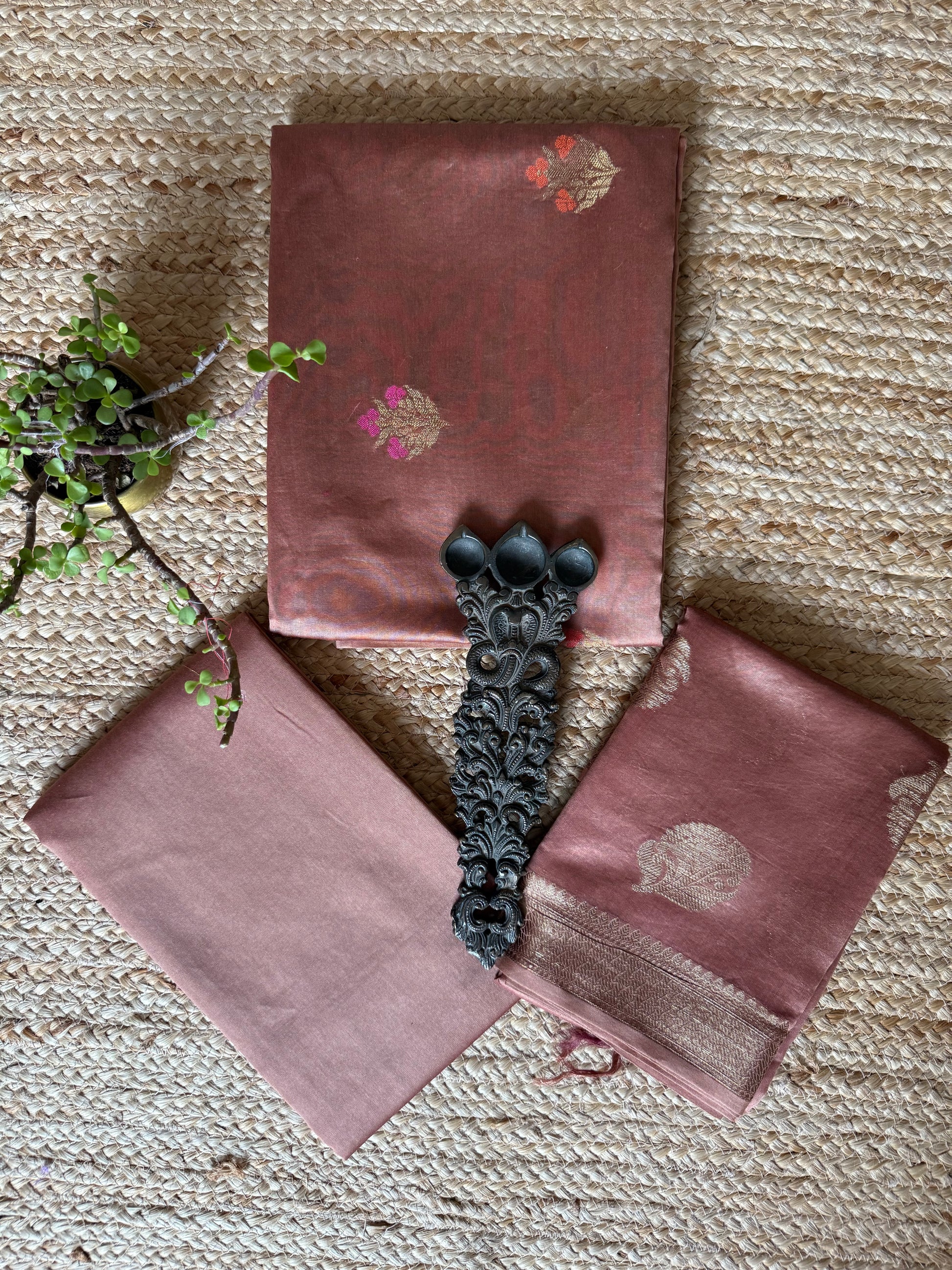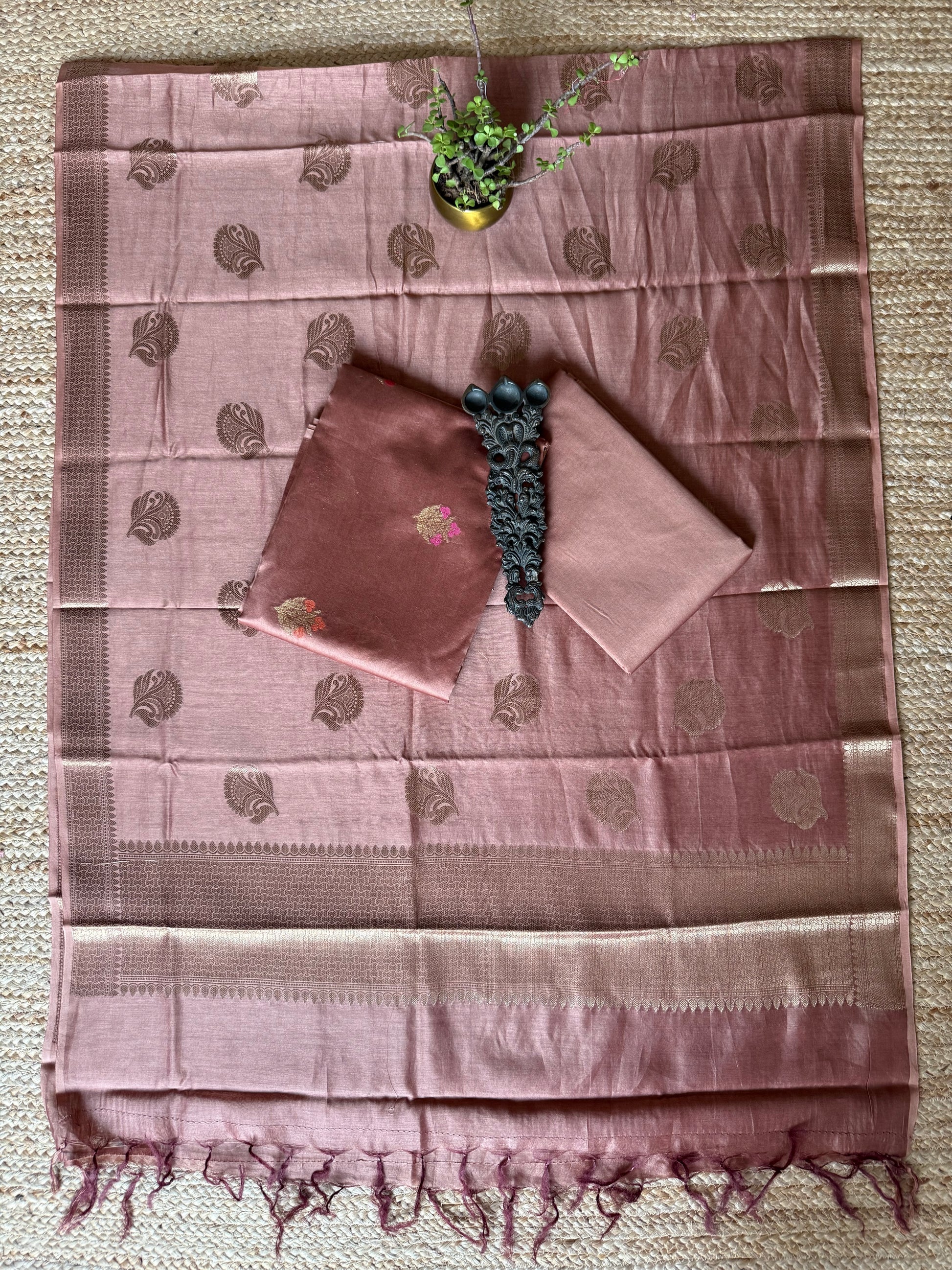 DUSTY PINK CHANDERI HANDLOOM 3 PIECE SUIT SETS The dupatta is CHANDERI with Banarsi border FABRIC: 2.5 MTRS METER BOTTOM:2.5 MTS DUPATTA: 2.5 MTRS * 35'' A SLIGHT DIFFERENCE IN SHADE COULD BE DUE TO THE CAMERA & LIGHTS. EMBRACE THE IMPERFECTION !! HAPPY HANDLOOM DRY CLEAN ONLY |