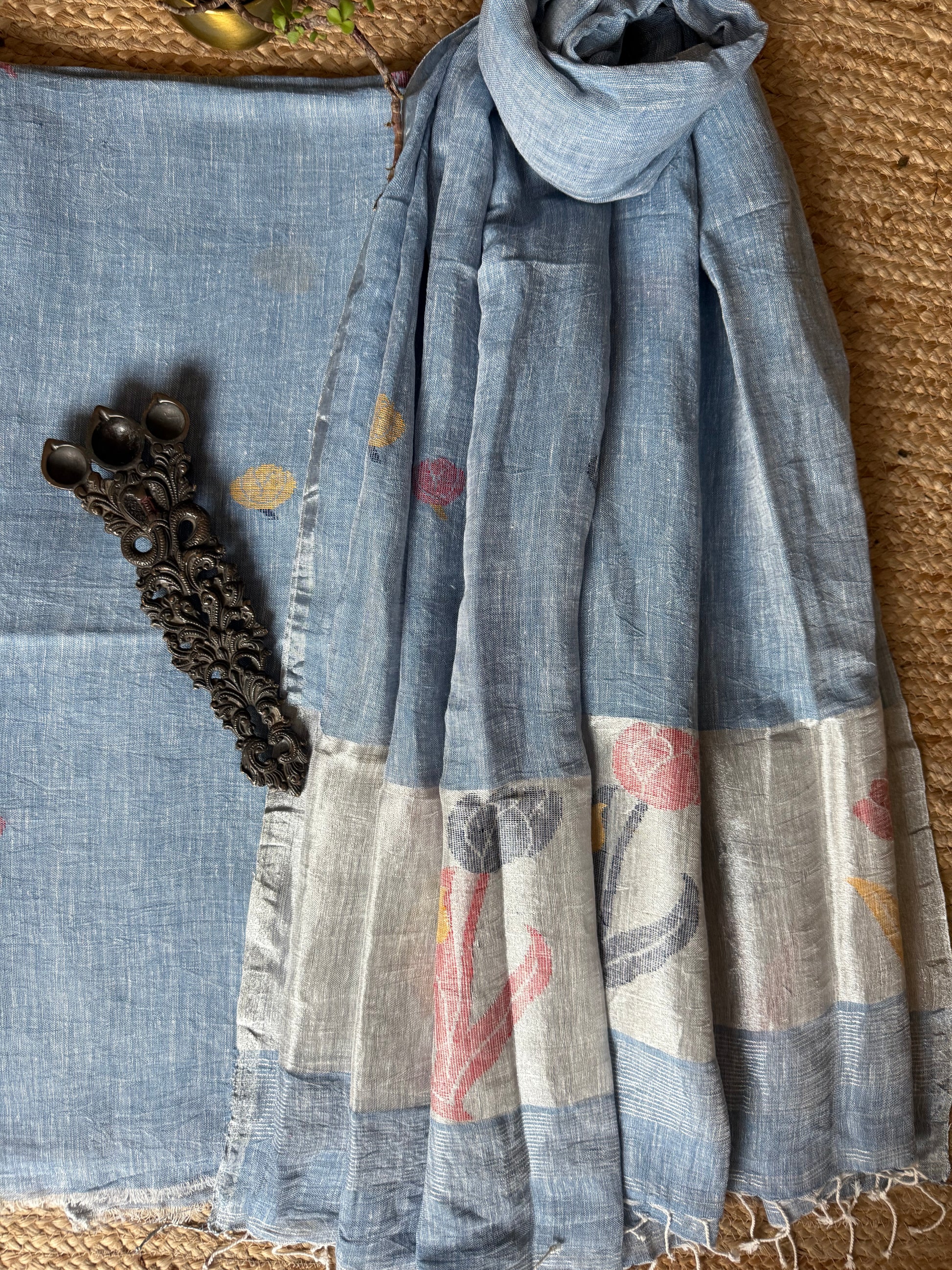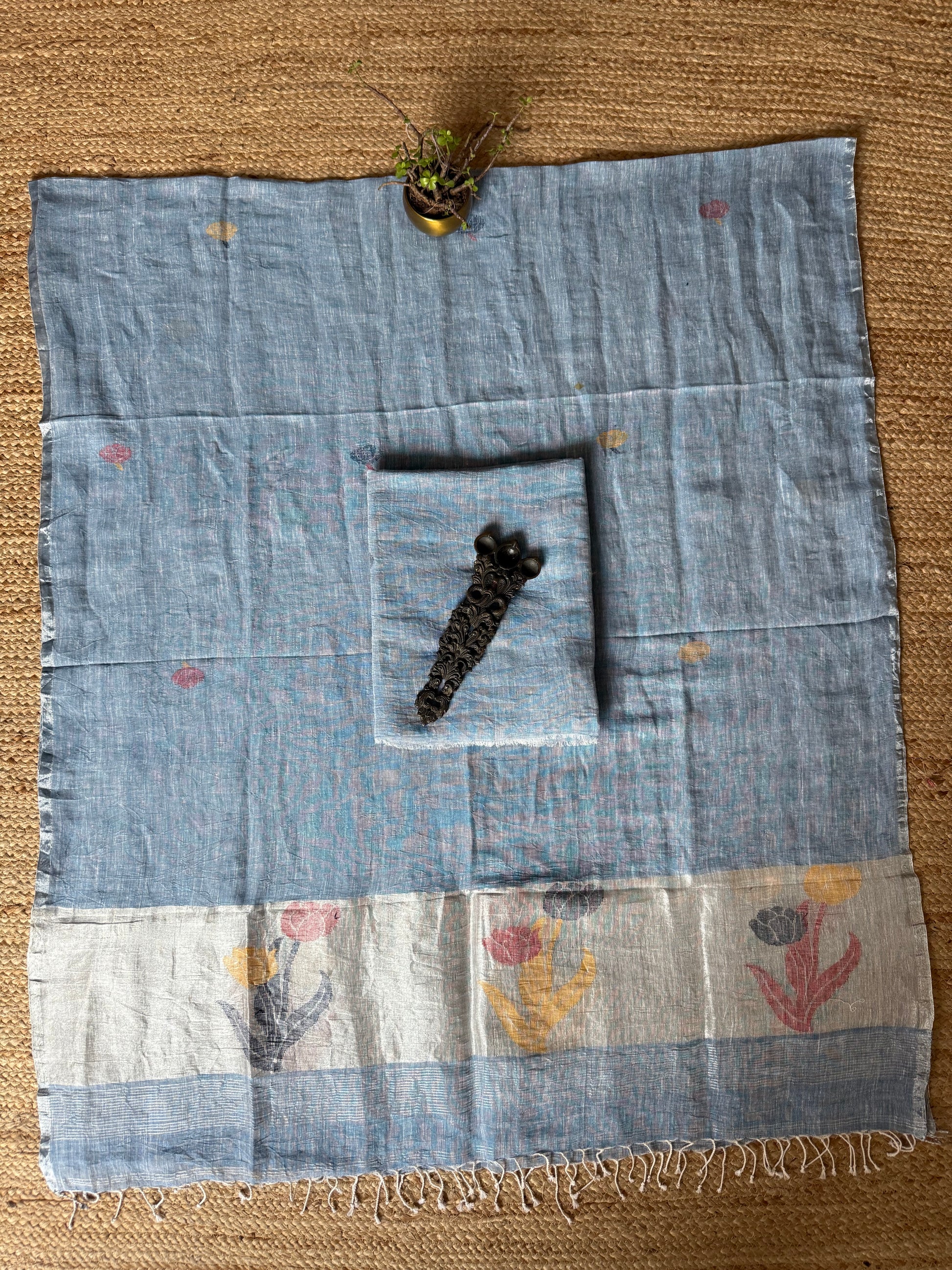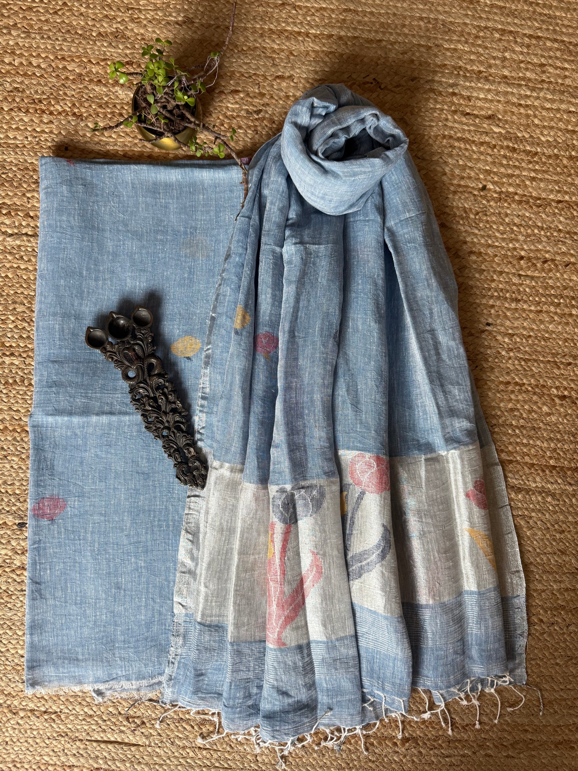 | SAPPHIRE BLUE JAMDANI WOVEN LINEN KURTA SET WITH HAND EMBROIDERY JAMDANI DUPATTA