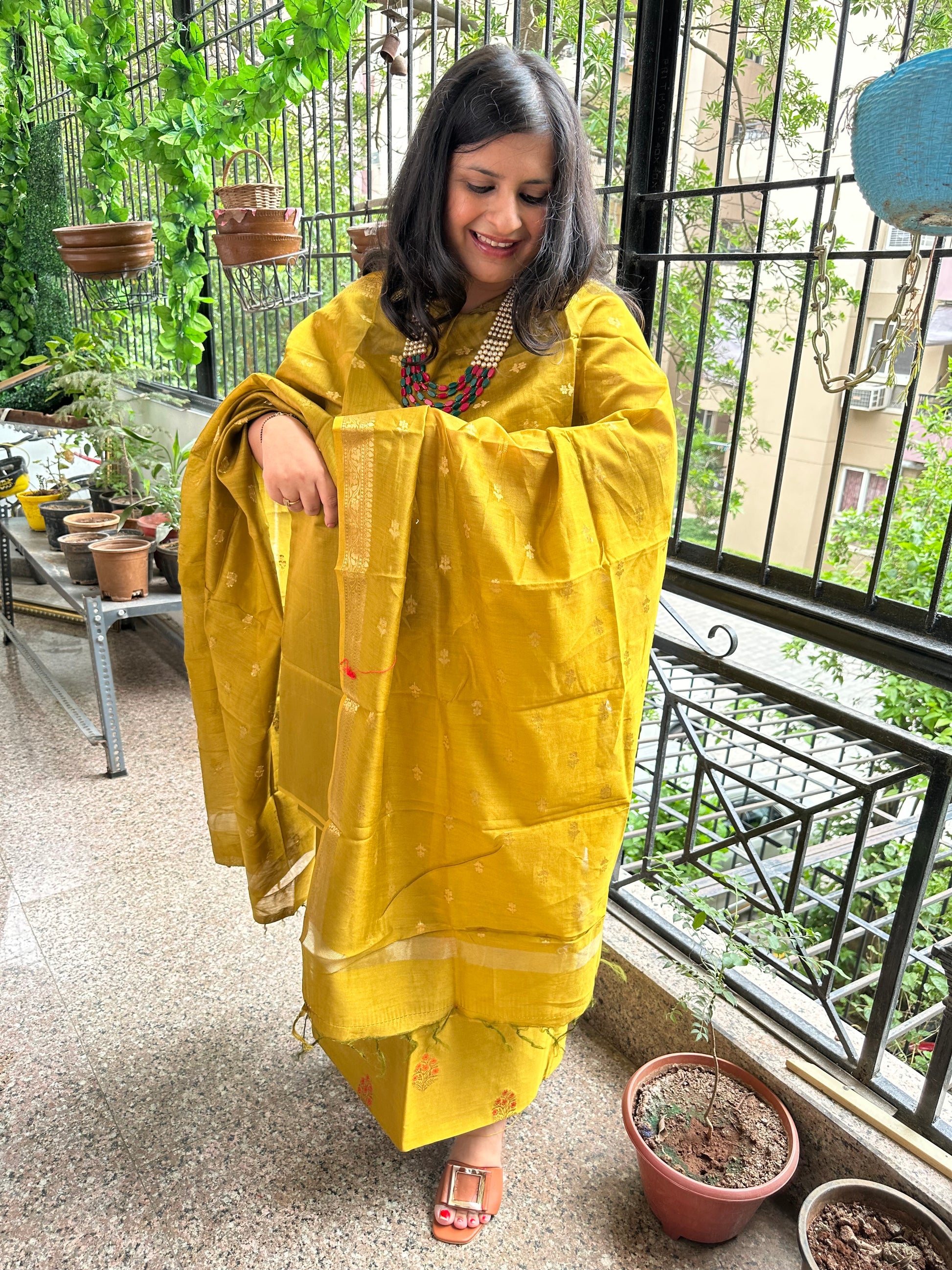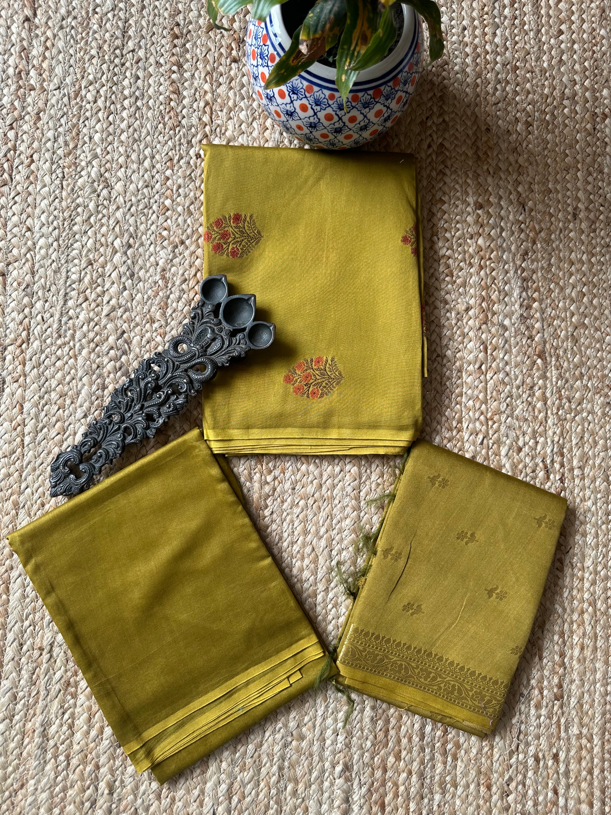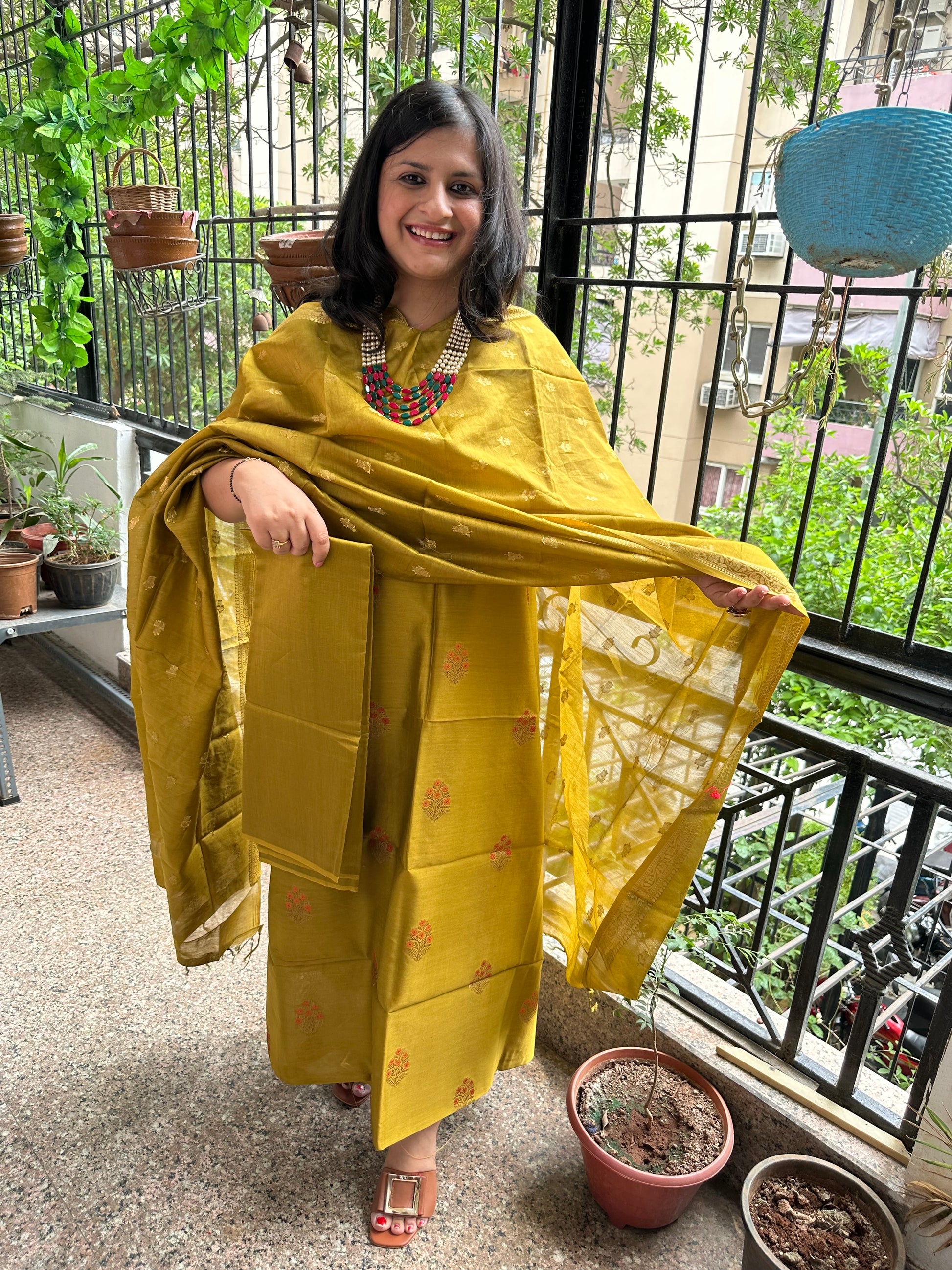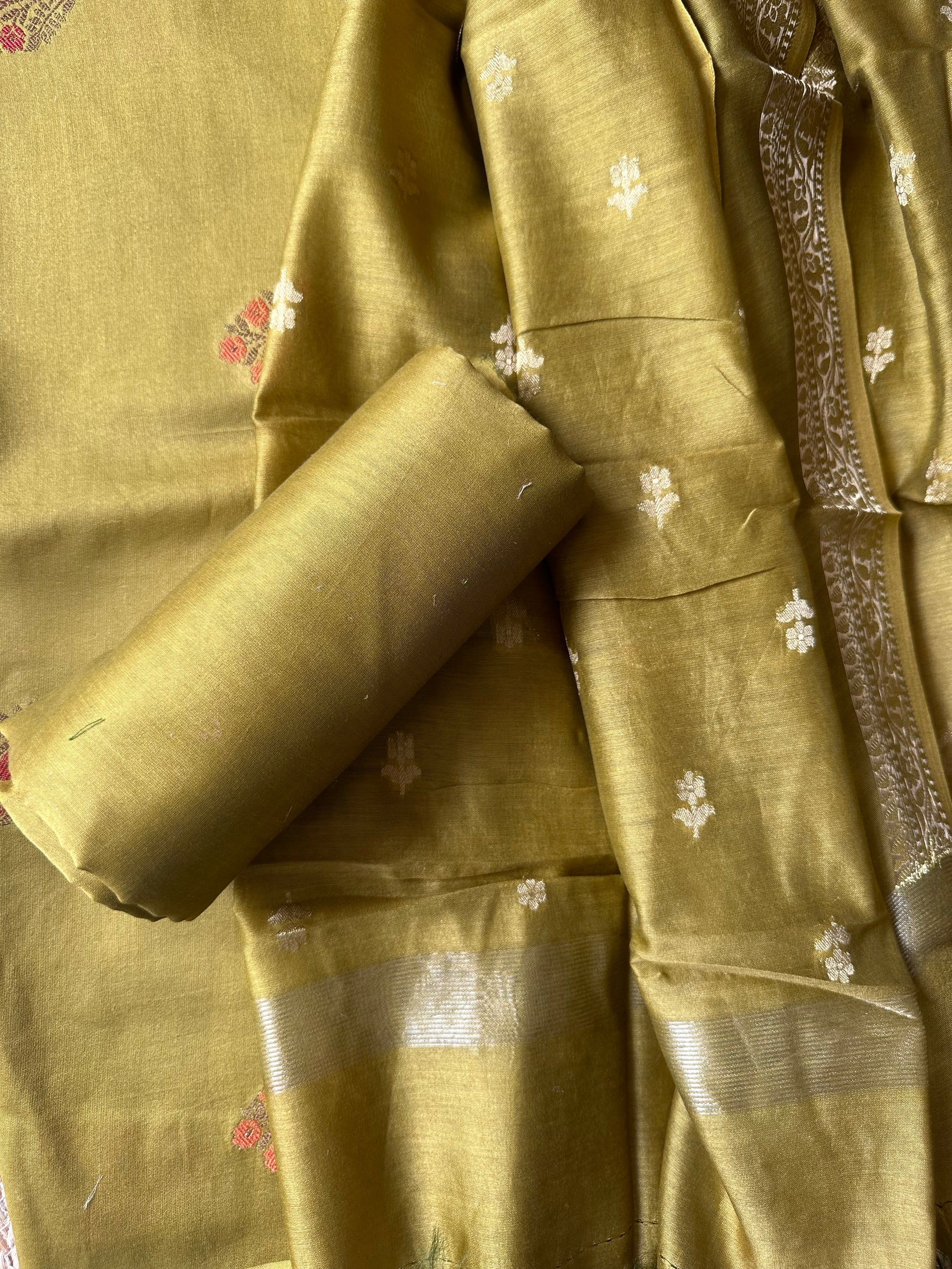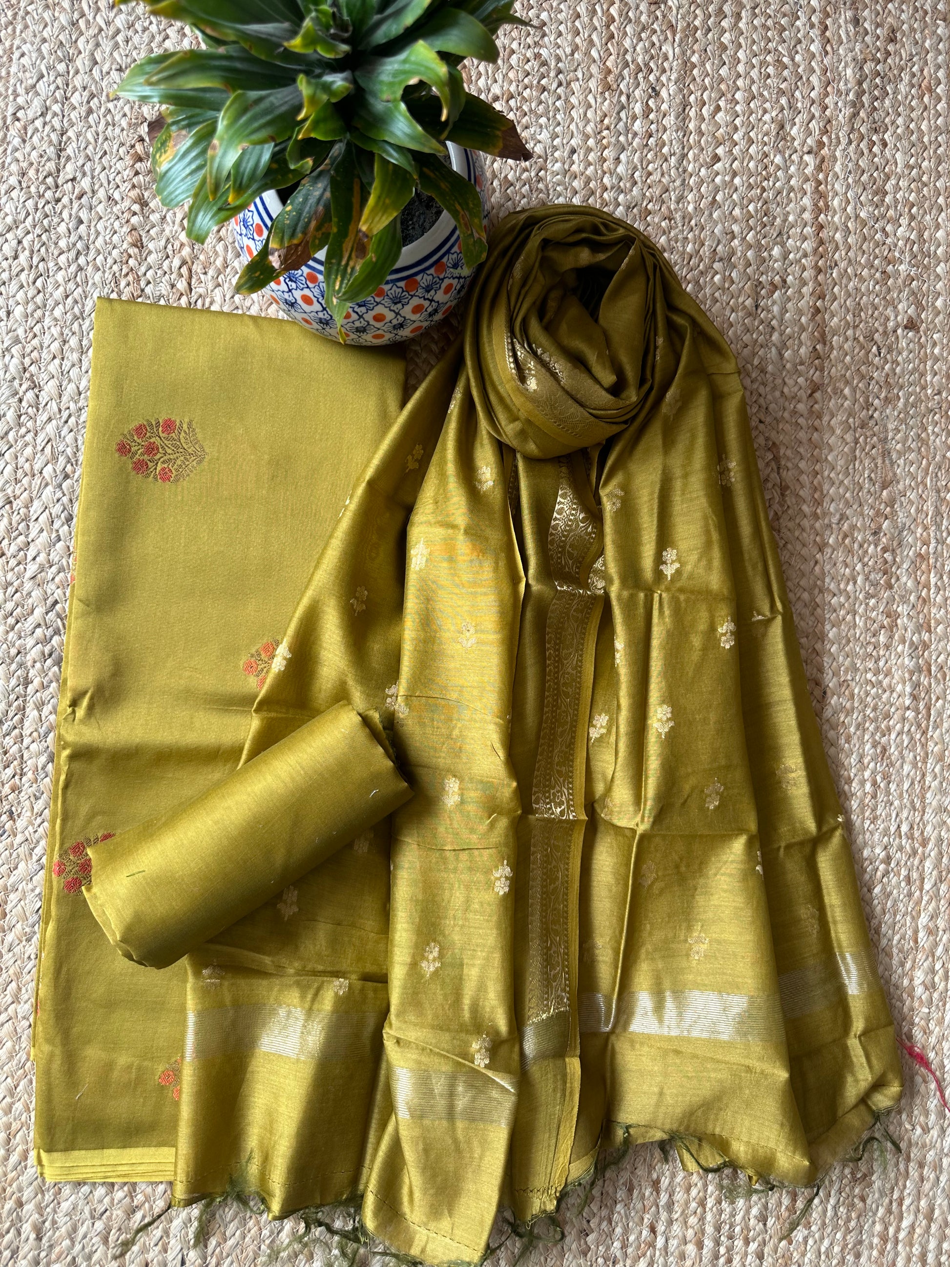 Mehendi Green Chanderi handloom Banarsi Booti three piece suit