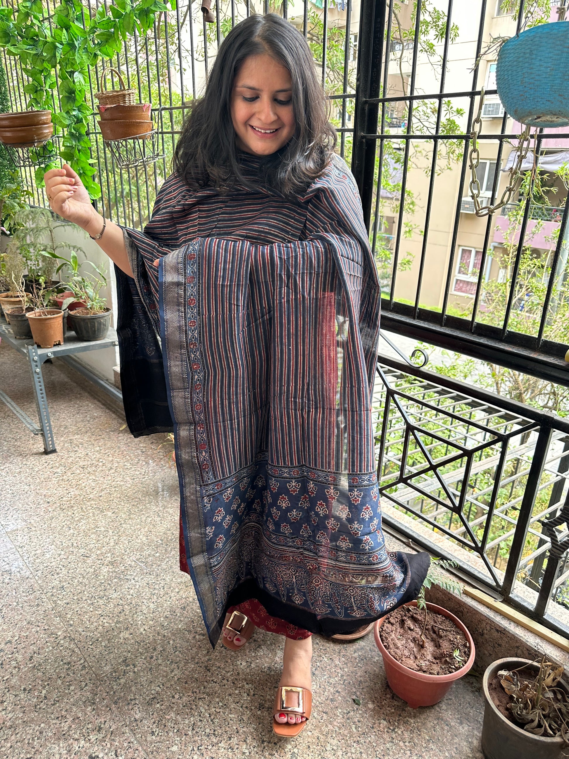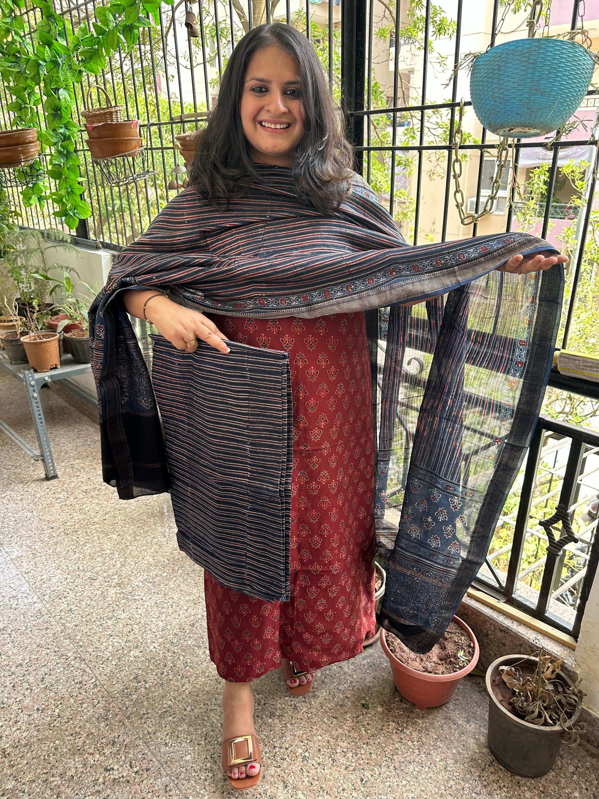 MAROON AJRAKH  HAND BLOCK MAHESHWARI AJRAKH KURTA WITH CONTRAST MAHESHWARI SILK AJRAKH HANDCRAFTED DUPATTA WITH AJRAKH BOTTOM
