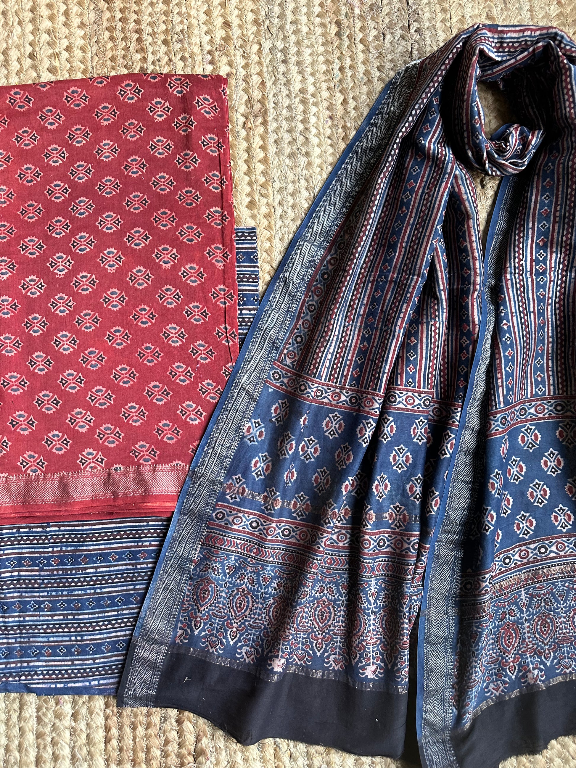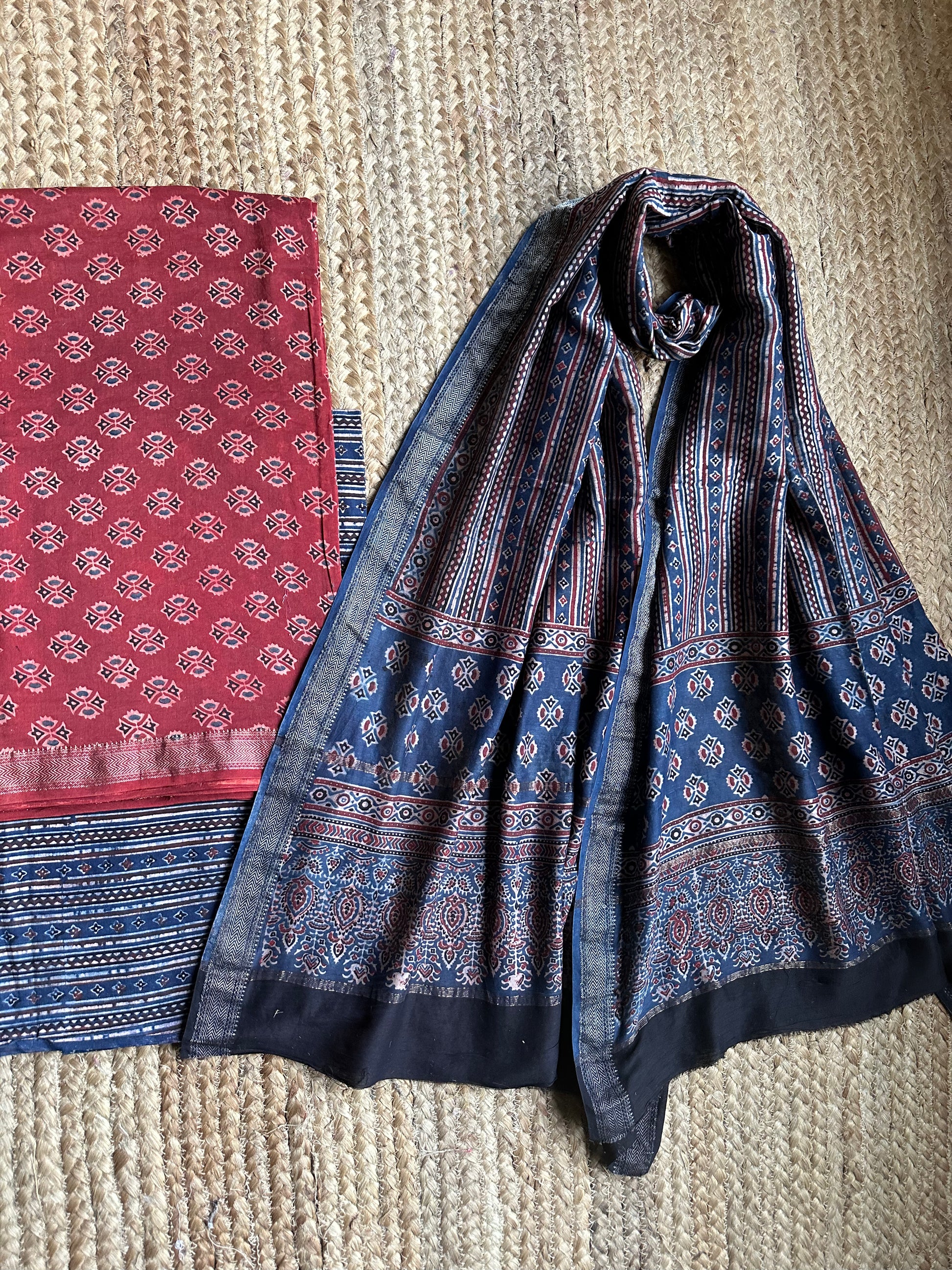 MAROON AJRAKH MAHESHWARI SILK HANDBLOCK THREE PIECE  SET SUIT