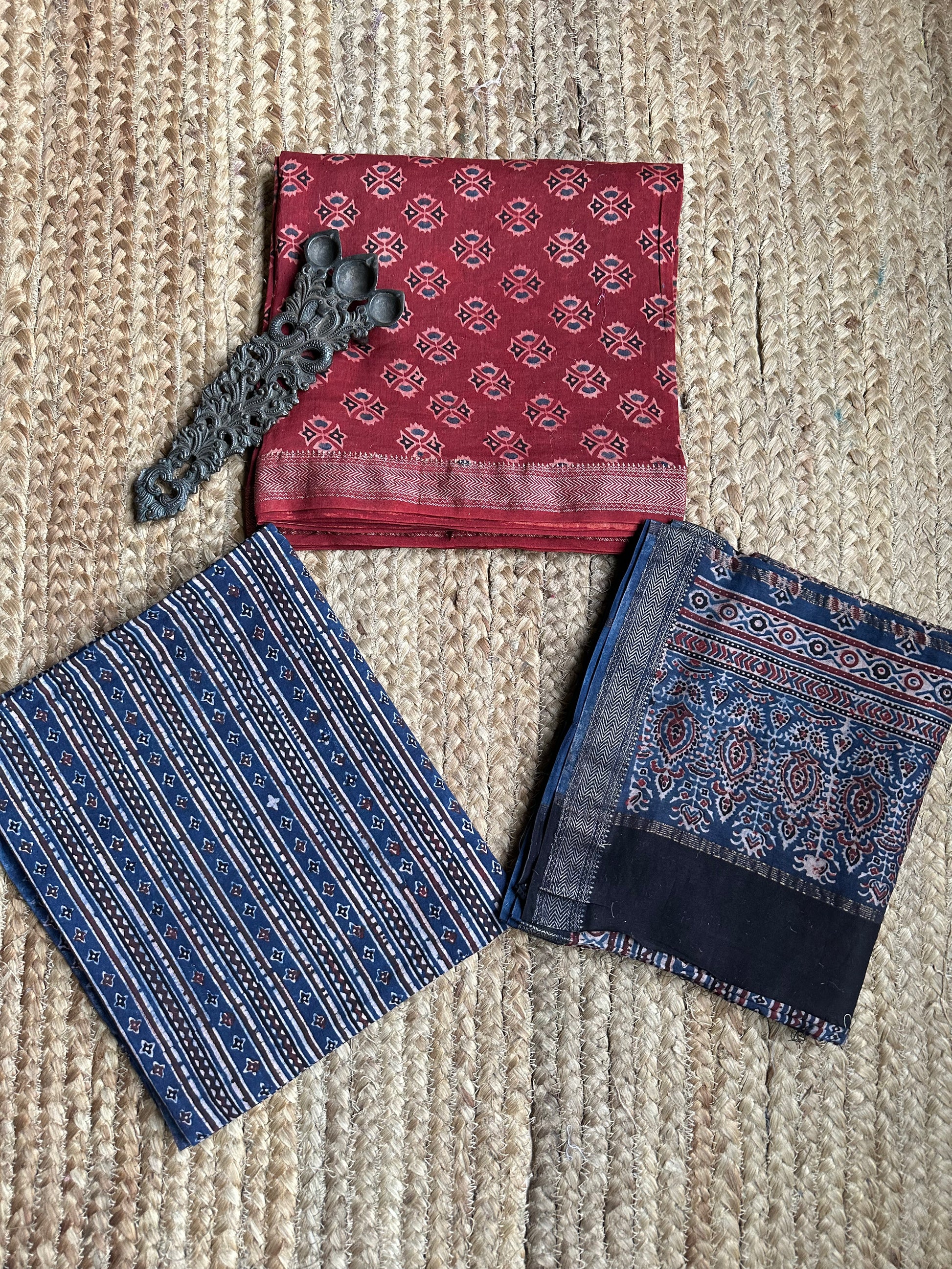 MAROON AJRAKH MAHESHWARI SILK HANDBLOCK THREE PIECE SET SUIT