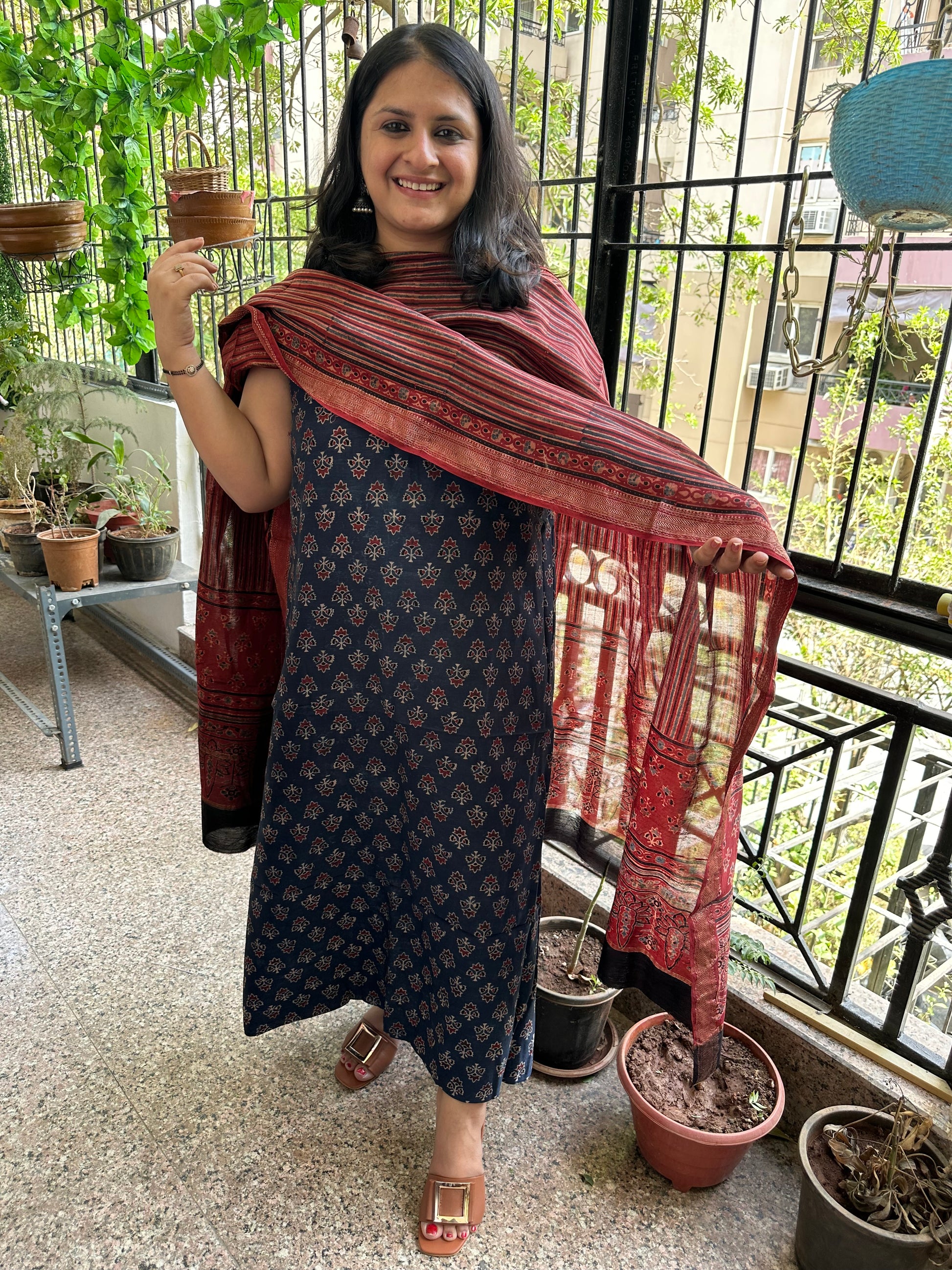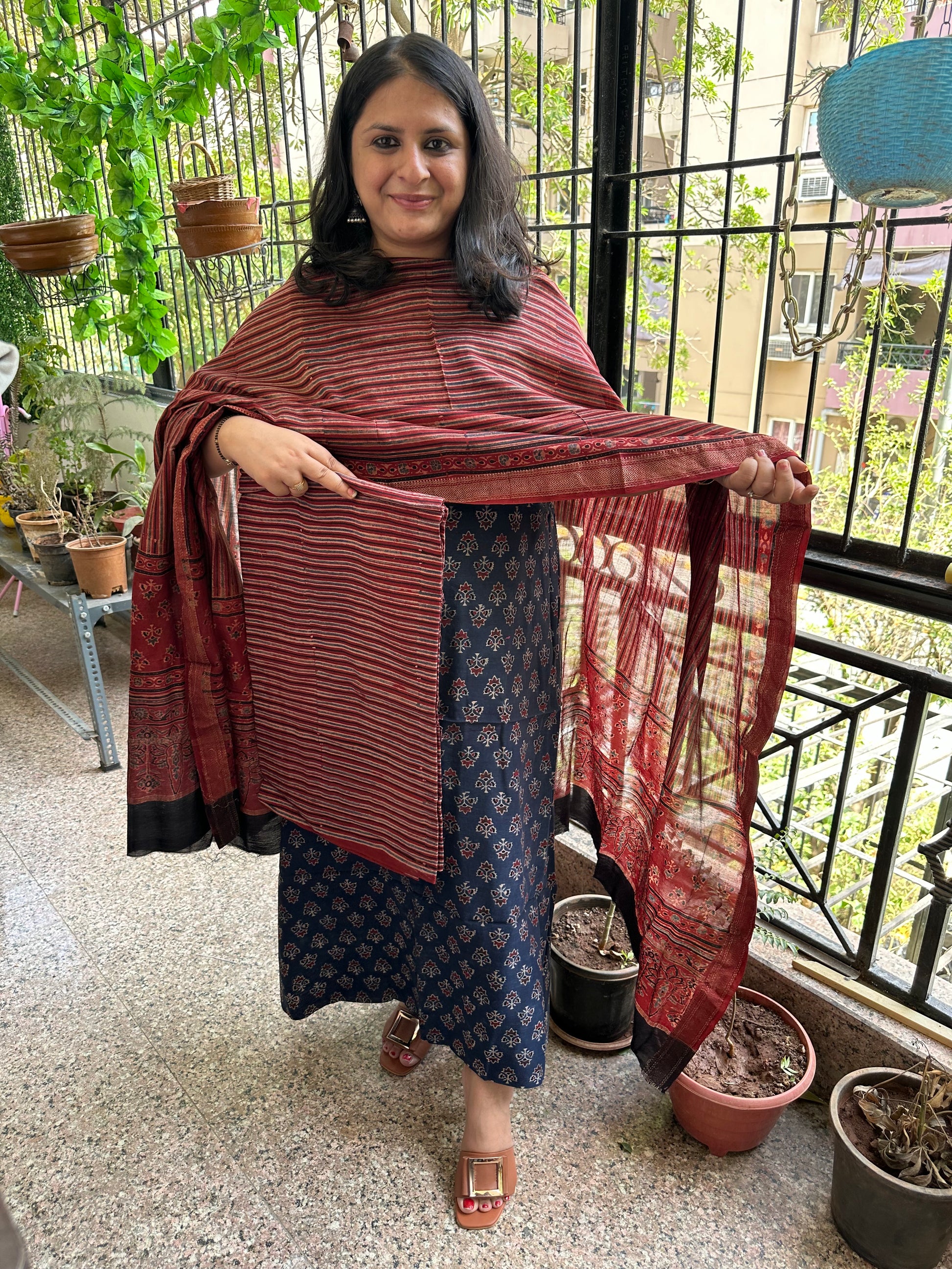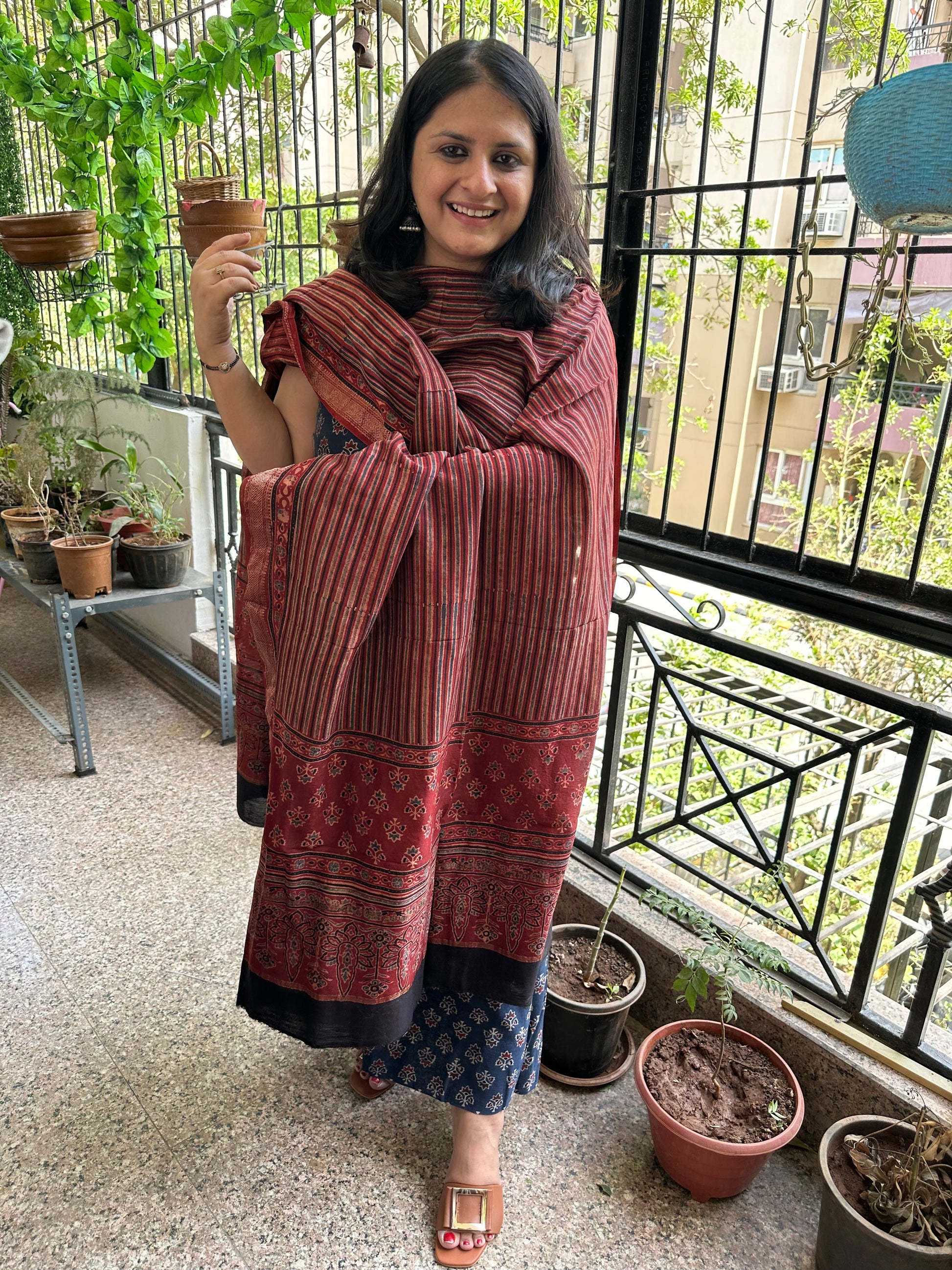 MAROON AJRAKH  HAND BLOCK MAHESHWARI AJRAKH KURTA WITH CONTRAST MAHESHWARI SILK AJRAKH HANDCRAFTED DUPATTA WITH AJRAKH BOTTOM