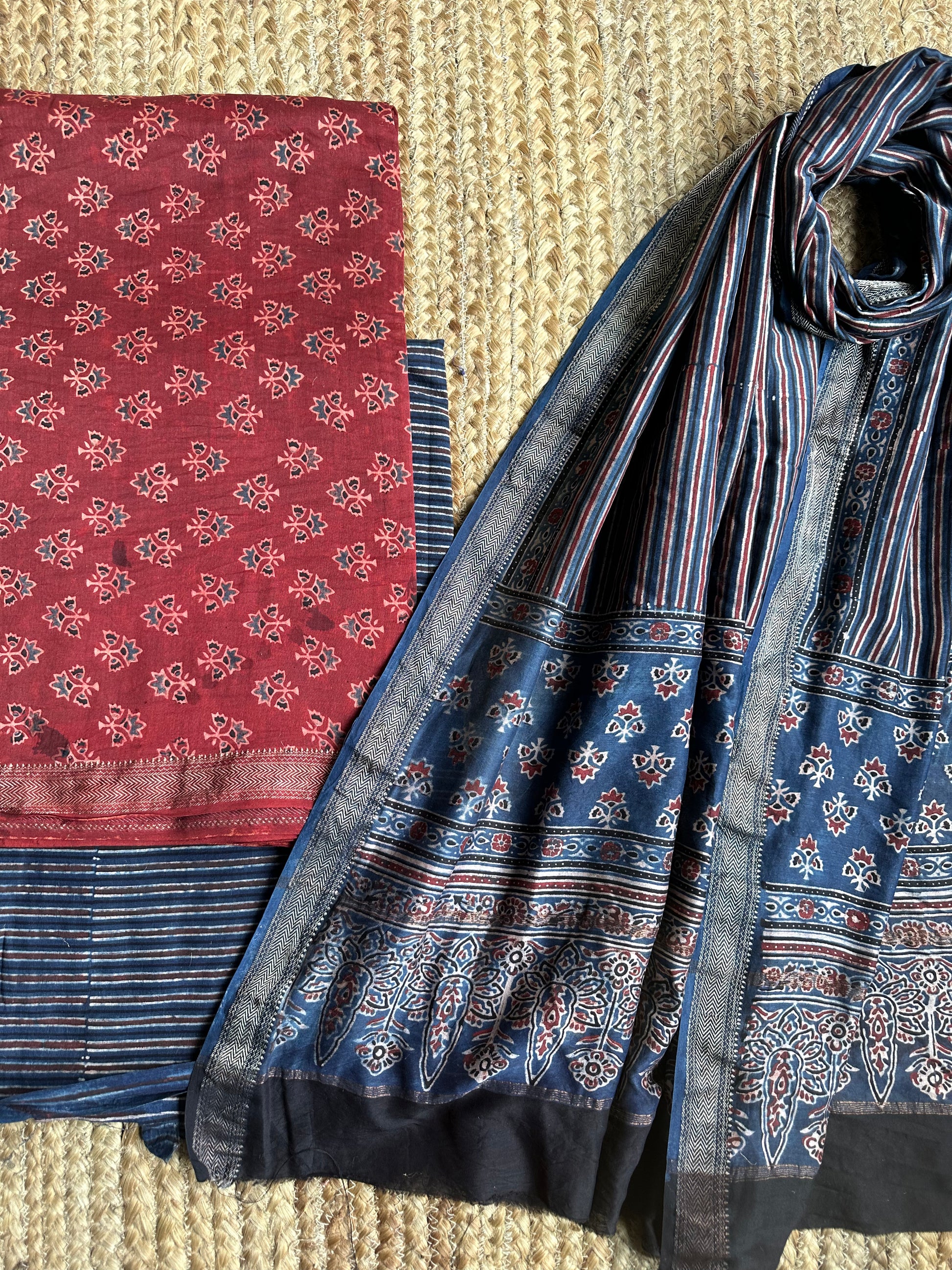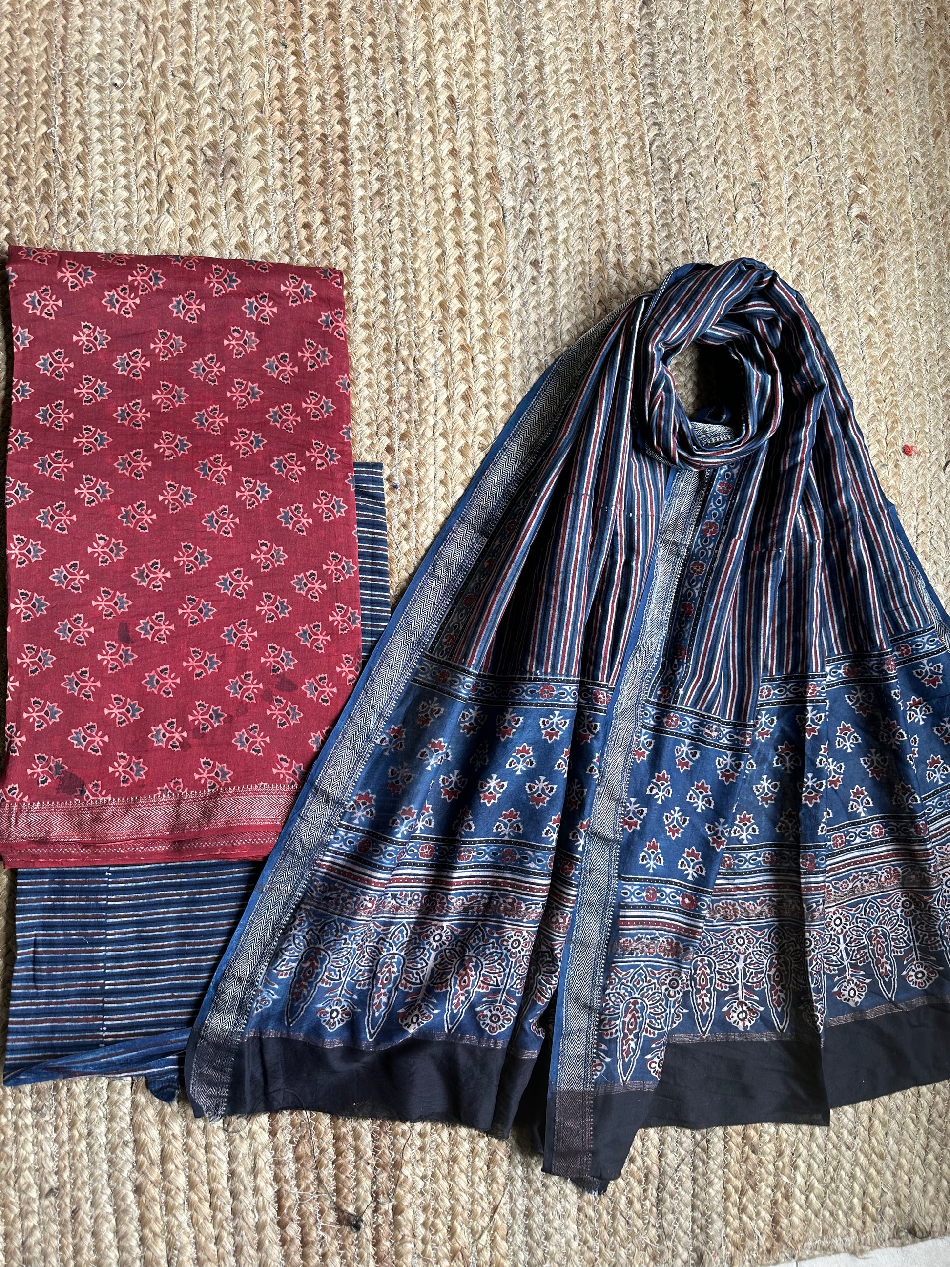 MAROON AJRAKH MAHESHWARI SILK HANDBLOCK THREE PIECE  SET SUIT