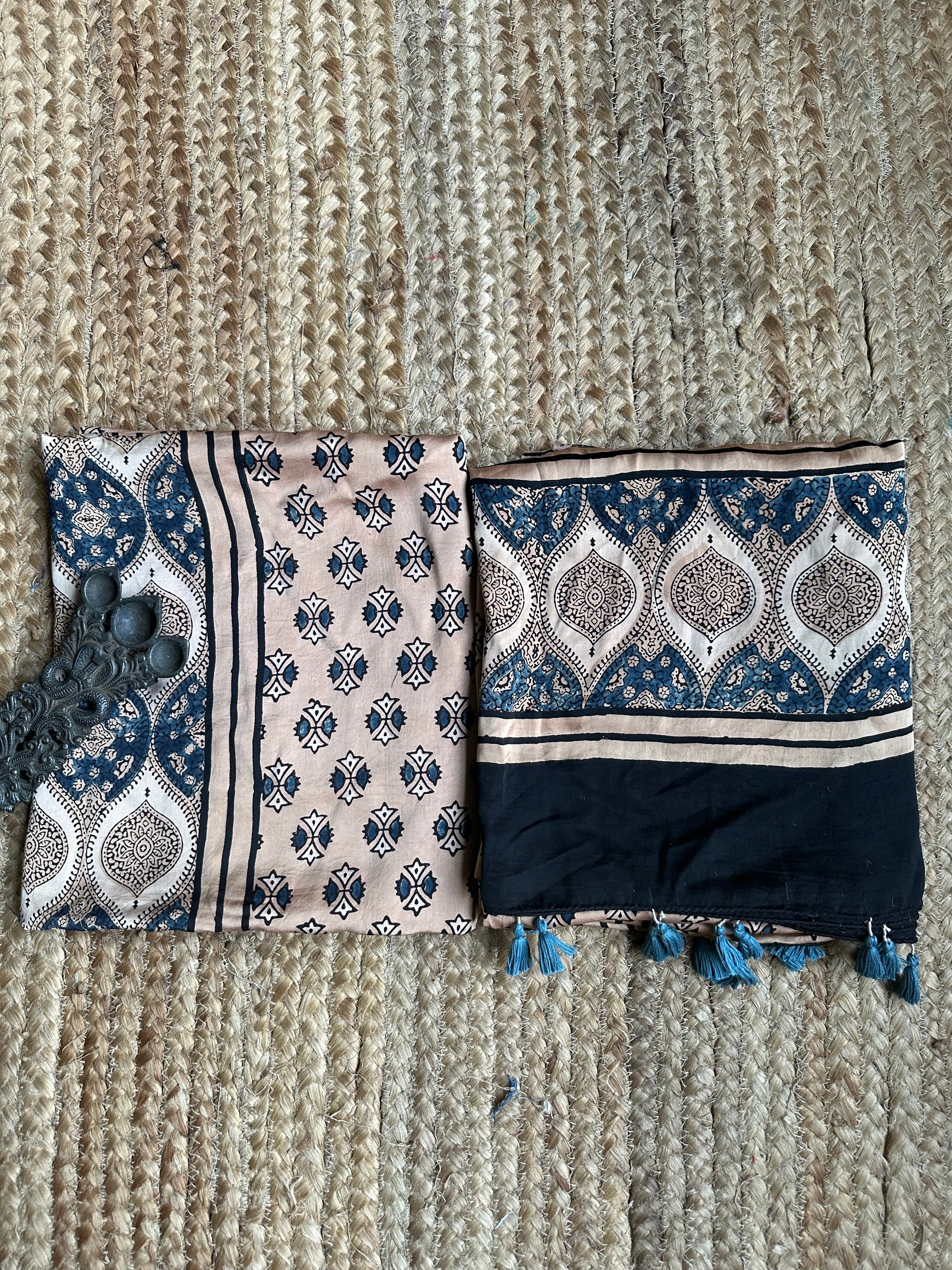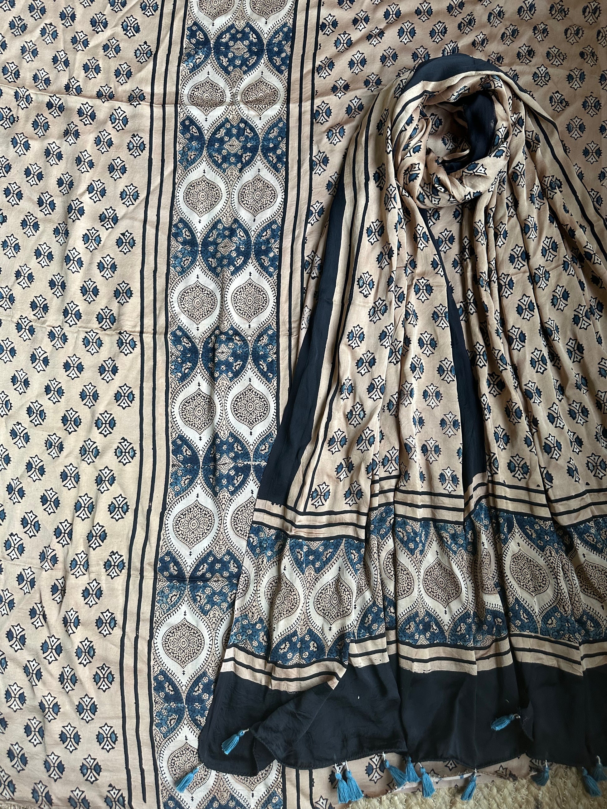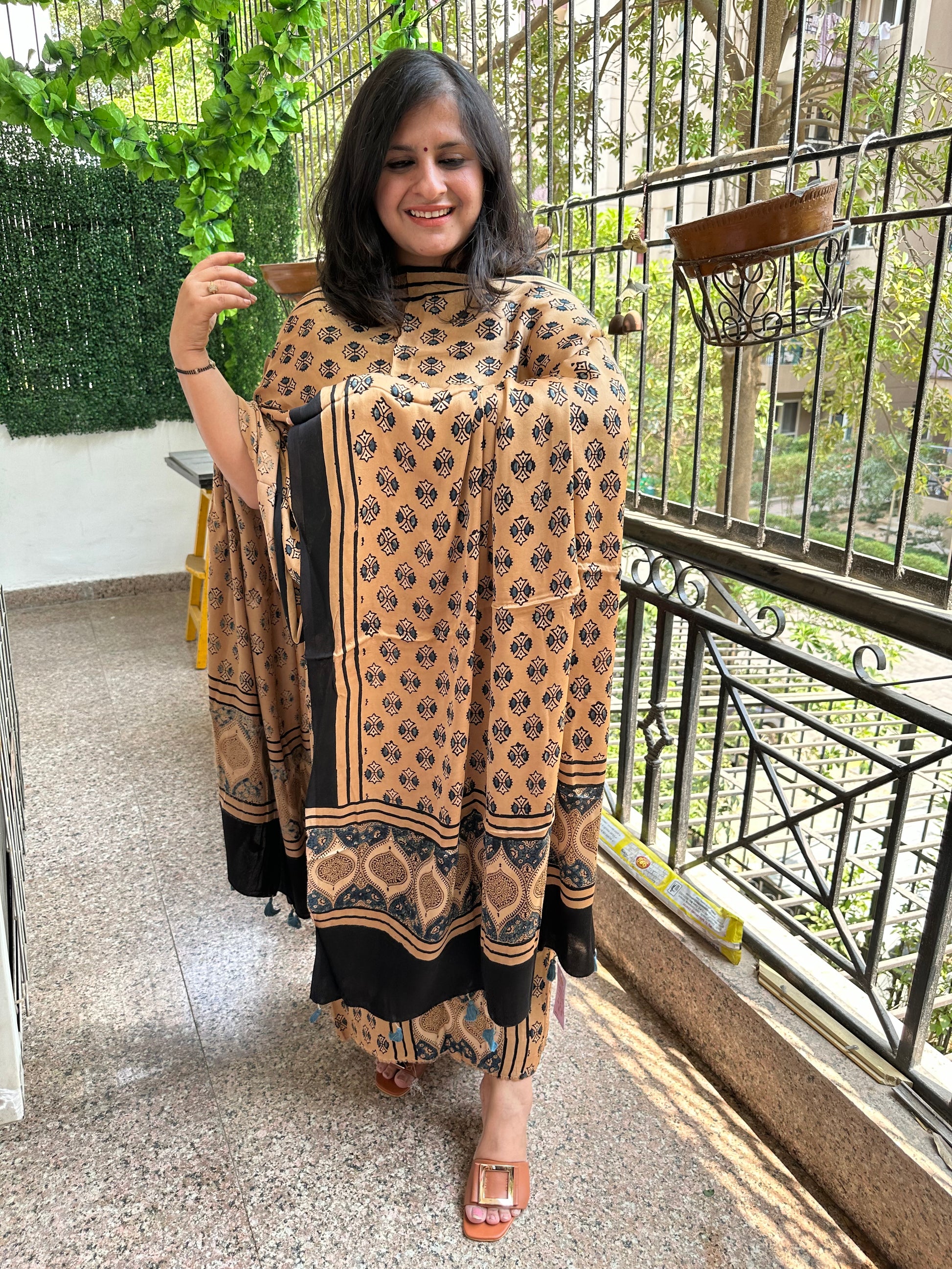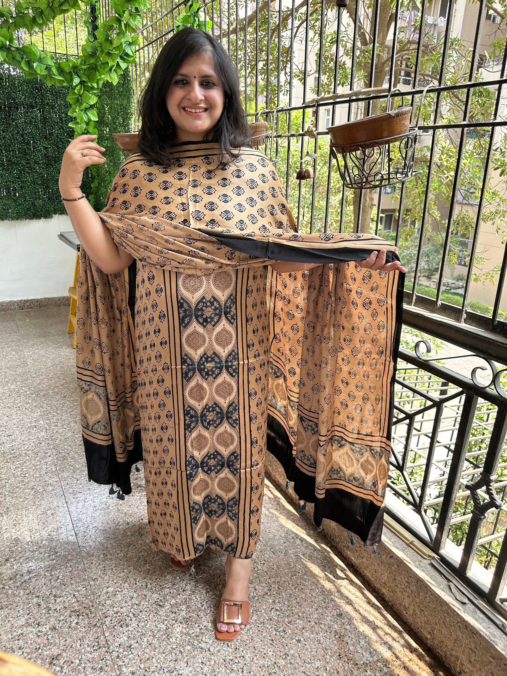 SAND EARTHY AJRAKH MODAL CONTEMPORARY SILK HANDBLOCK SUIT SET