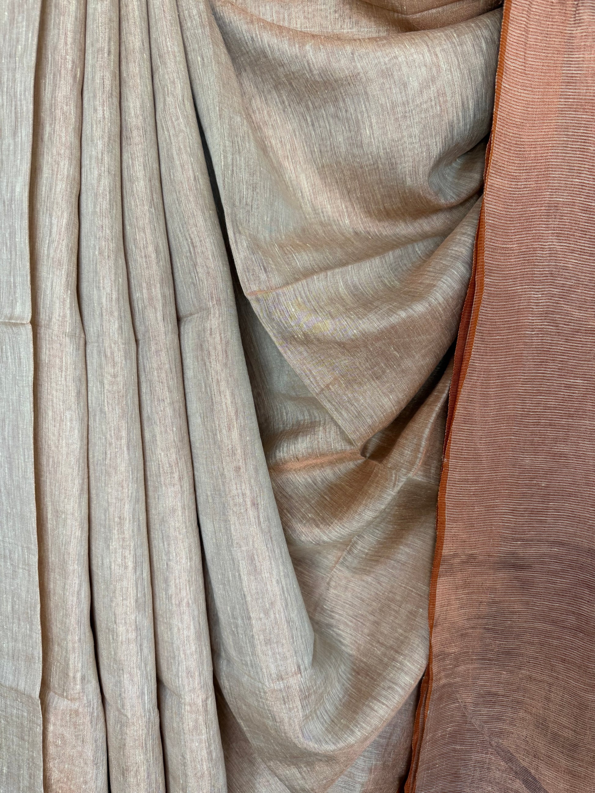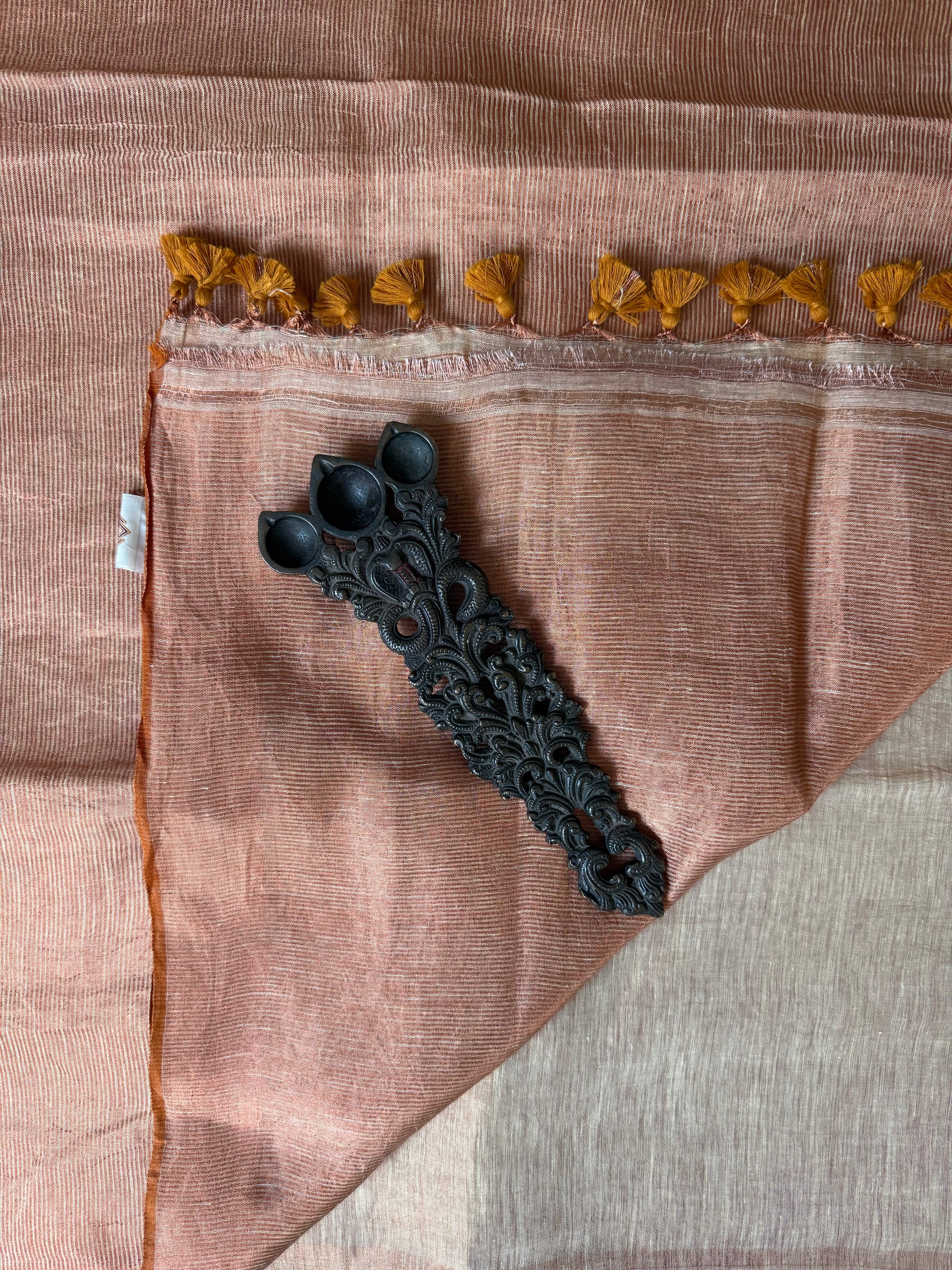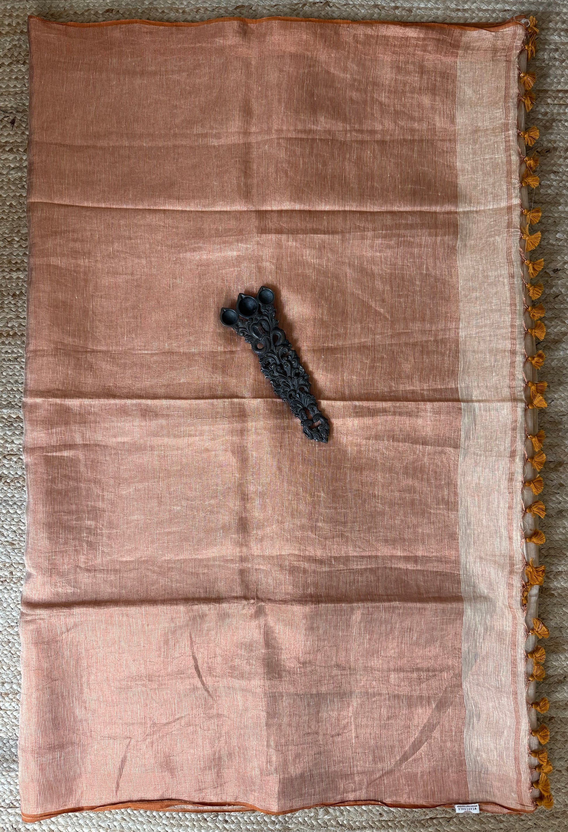 NAIVE PEACH TISSUE LINEN SARI WITH WOVEN BORDER & TASSELS SIZE: 5.56 MTRS (Excluding 86 CMS BLOUSE) X 46" THE SAREES ARE NATURAL DYED HENCE THEY ARE NOT AS BRIGHT AS SEEN IN PICTURES. A SLIGHT DIFFERENCE IN SHADE COULD BE DUE TO THE CAMERA & LIGHTS. EMBRACE THE IMPERFECTION !! HAPPY HANDLOOM DRY CLEAN ONLY