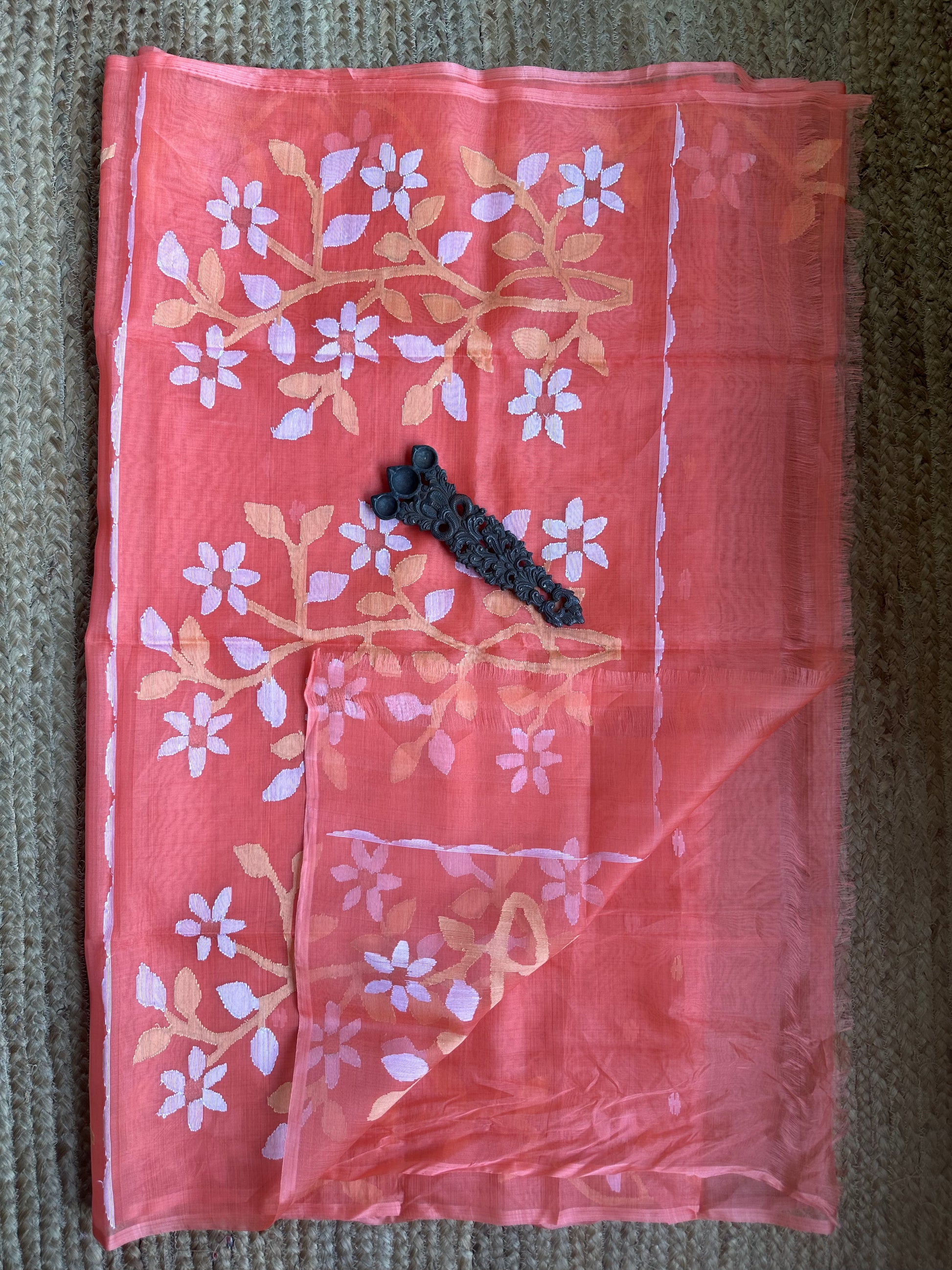 | Peach jamdani handwoven pure muslin silk sari have its own running blouse Sari Length 6.5 meter slight difference in shade could be due to camera & lights. embrace the imperfection !! happy handloom dry clean only |