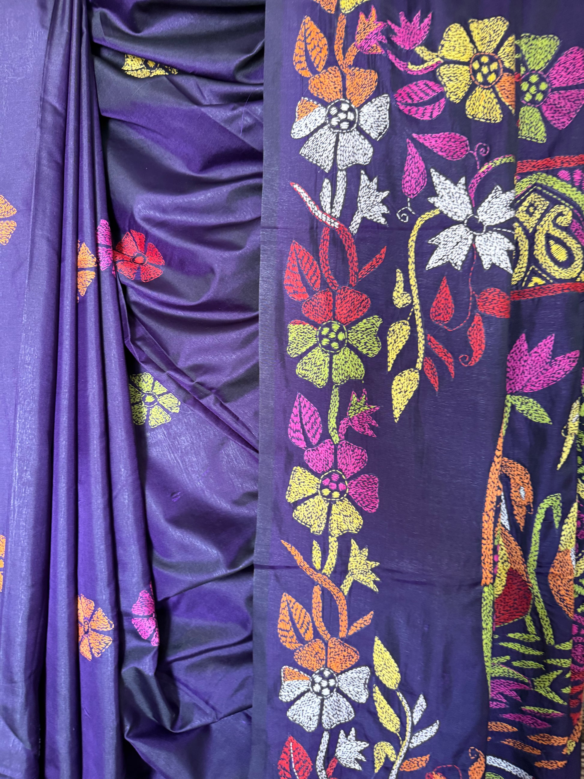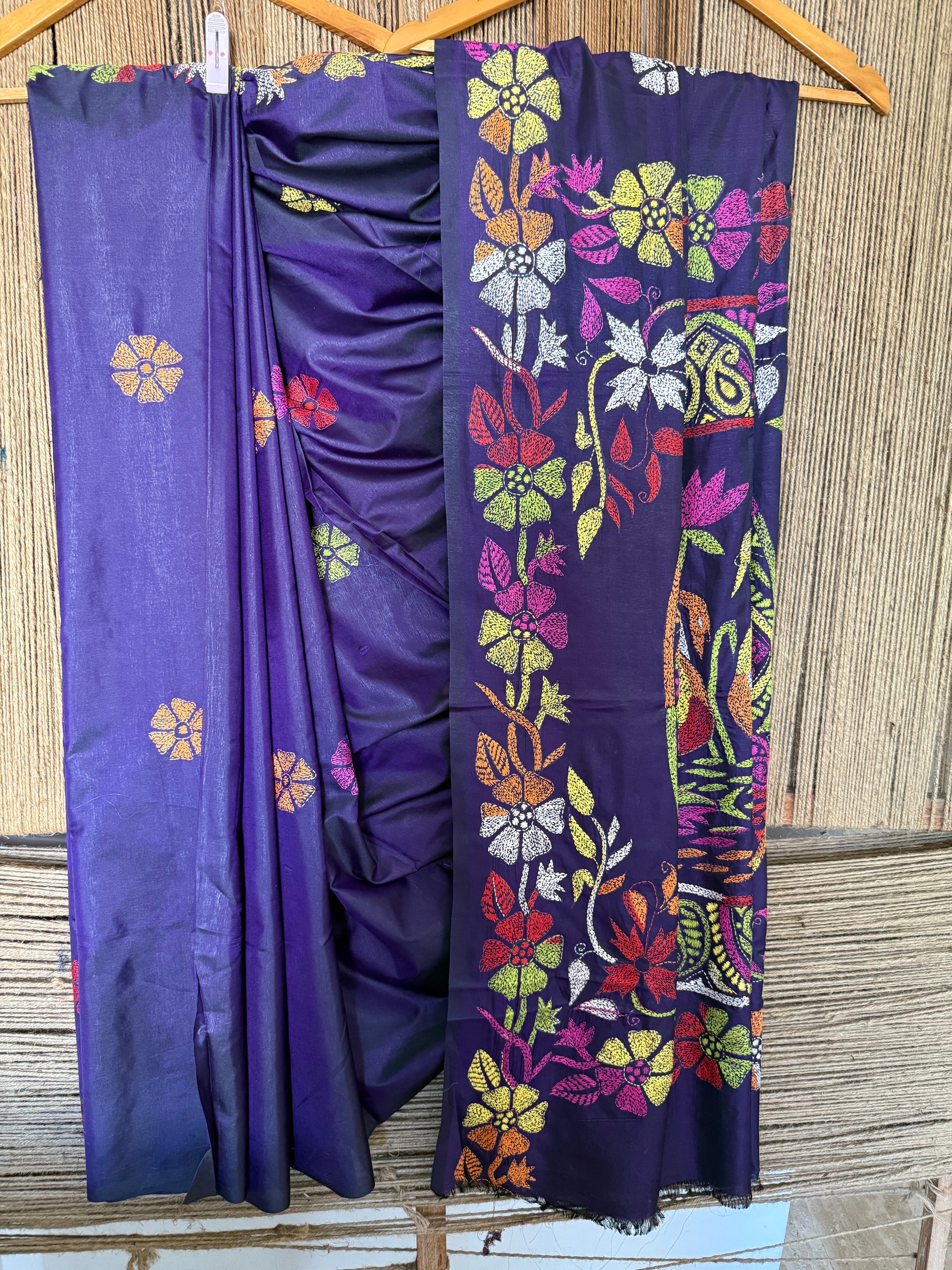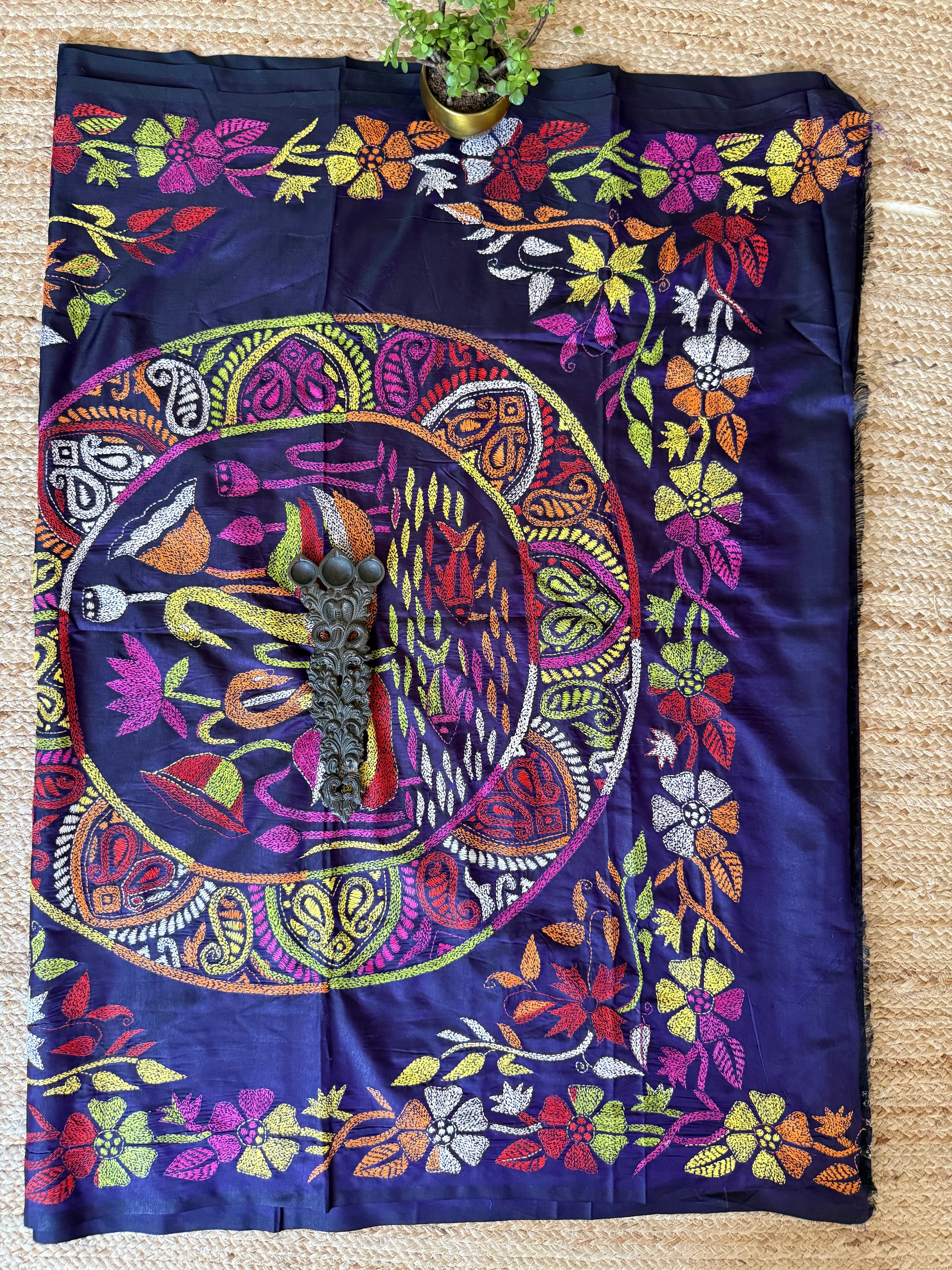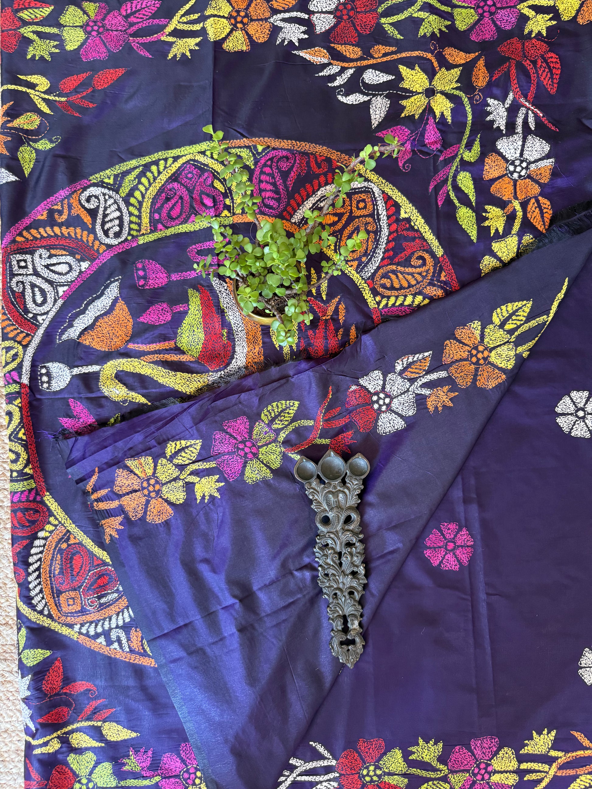 BEAUTIFUL COLOURFUL HAND KANTHA WORK ON BANGALORE BLENDED SILK DENIM BLUE COLOUR SARI WITH BLOUSE