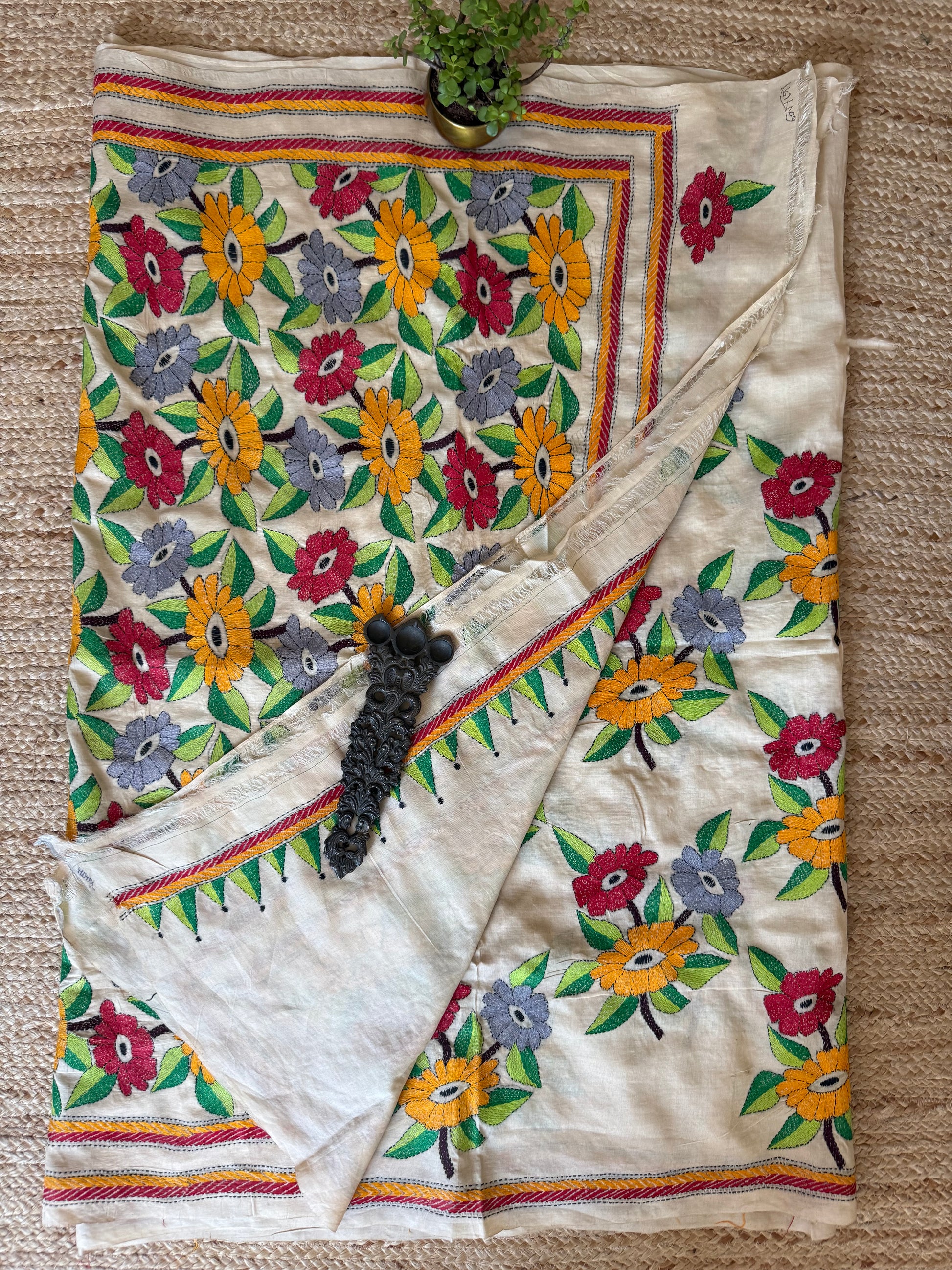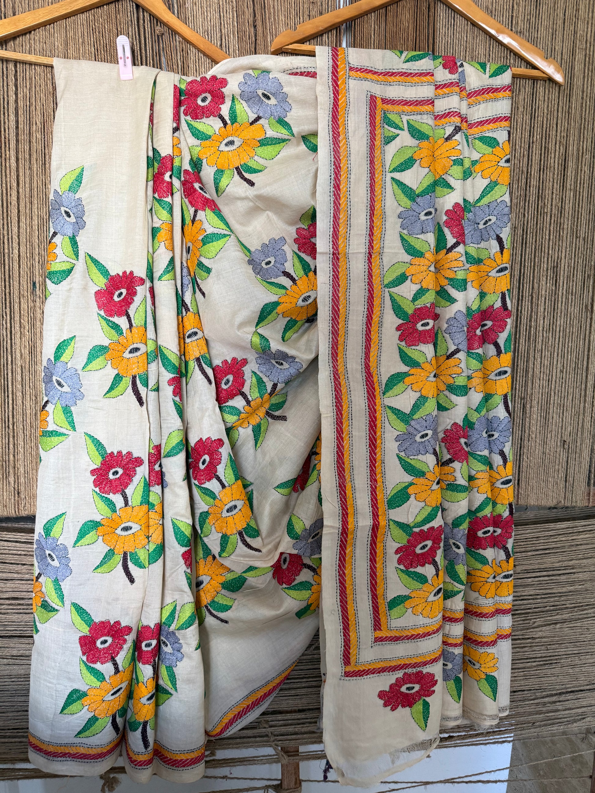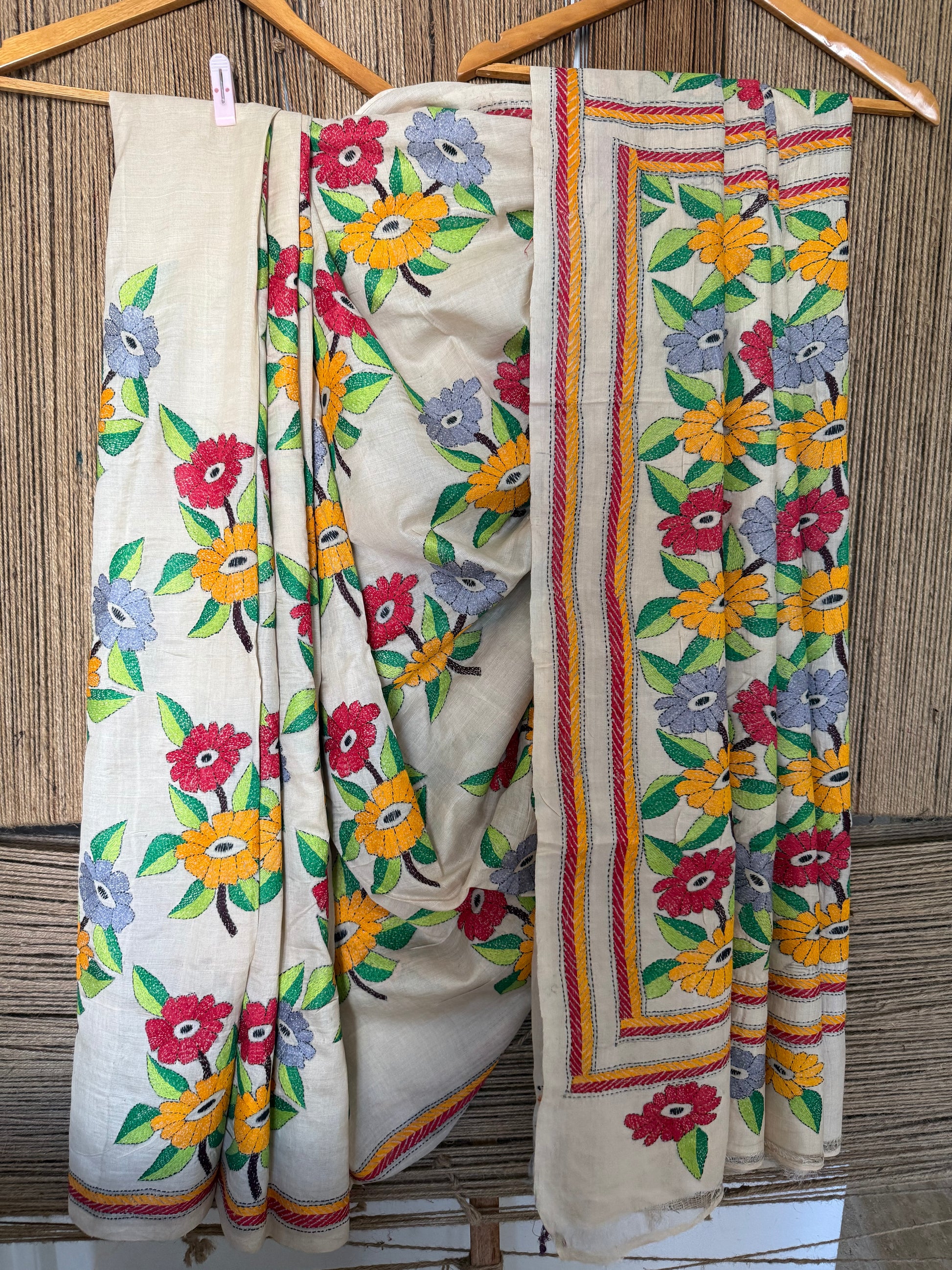 DUTCH WHITE BEAUTIFUL HAND MADE KANTA HANDWORK ON TUSSAR SARI THE KANTHA FLOWERS BEAUTIFUL ALL OVER THE SARI WITH BLOUSE