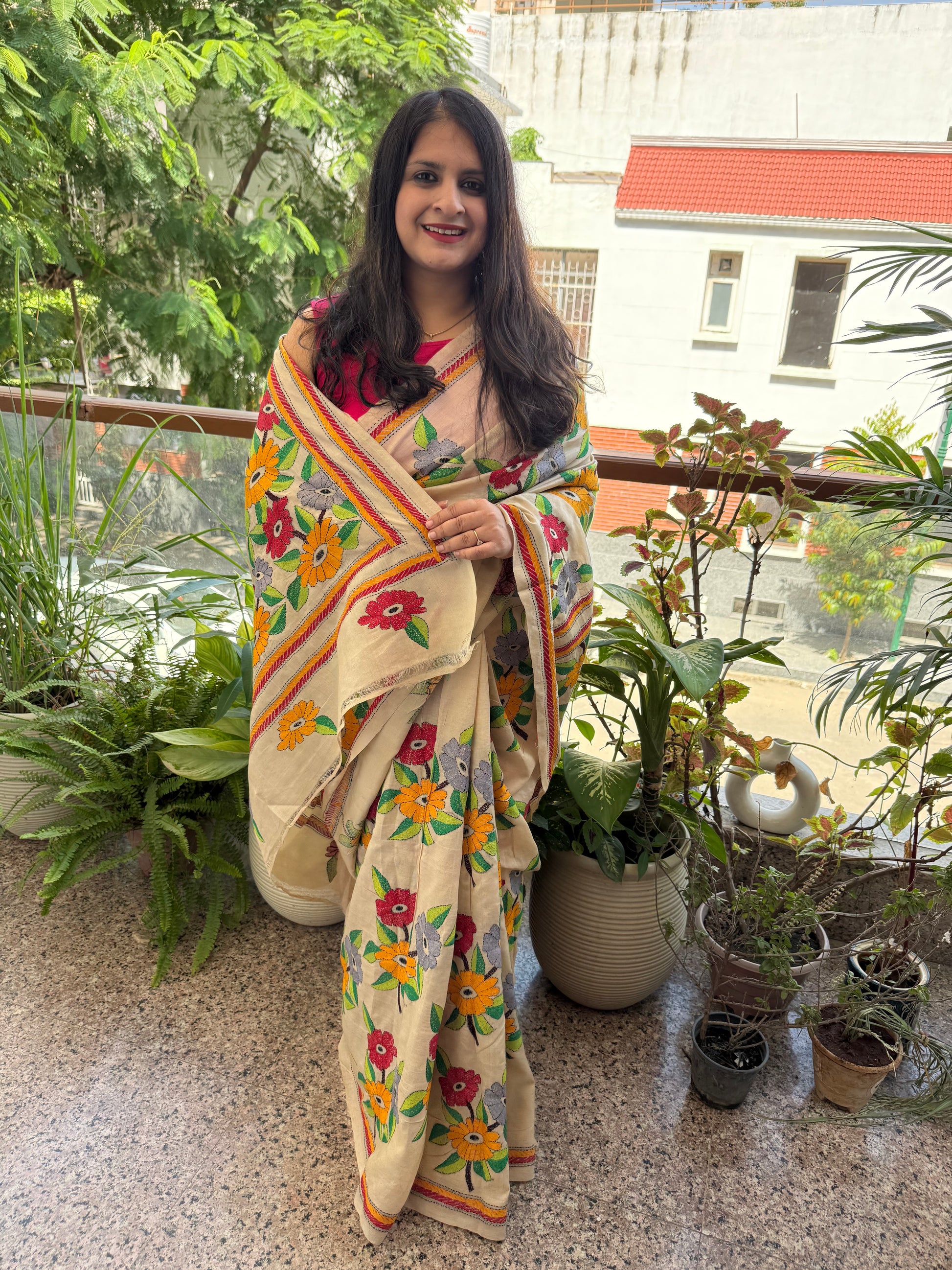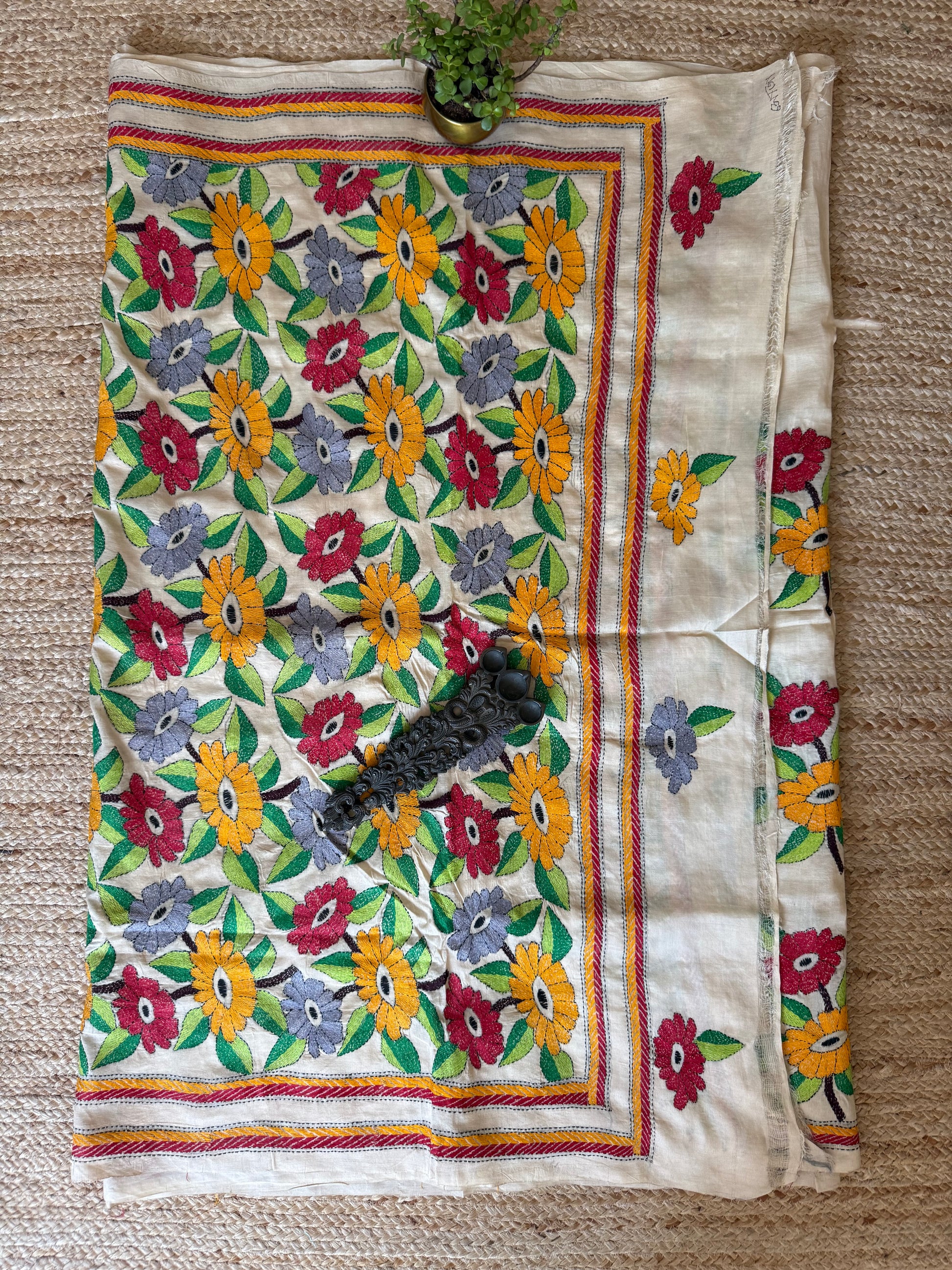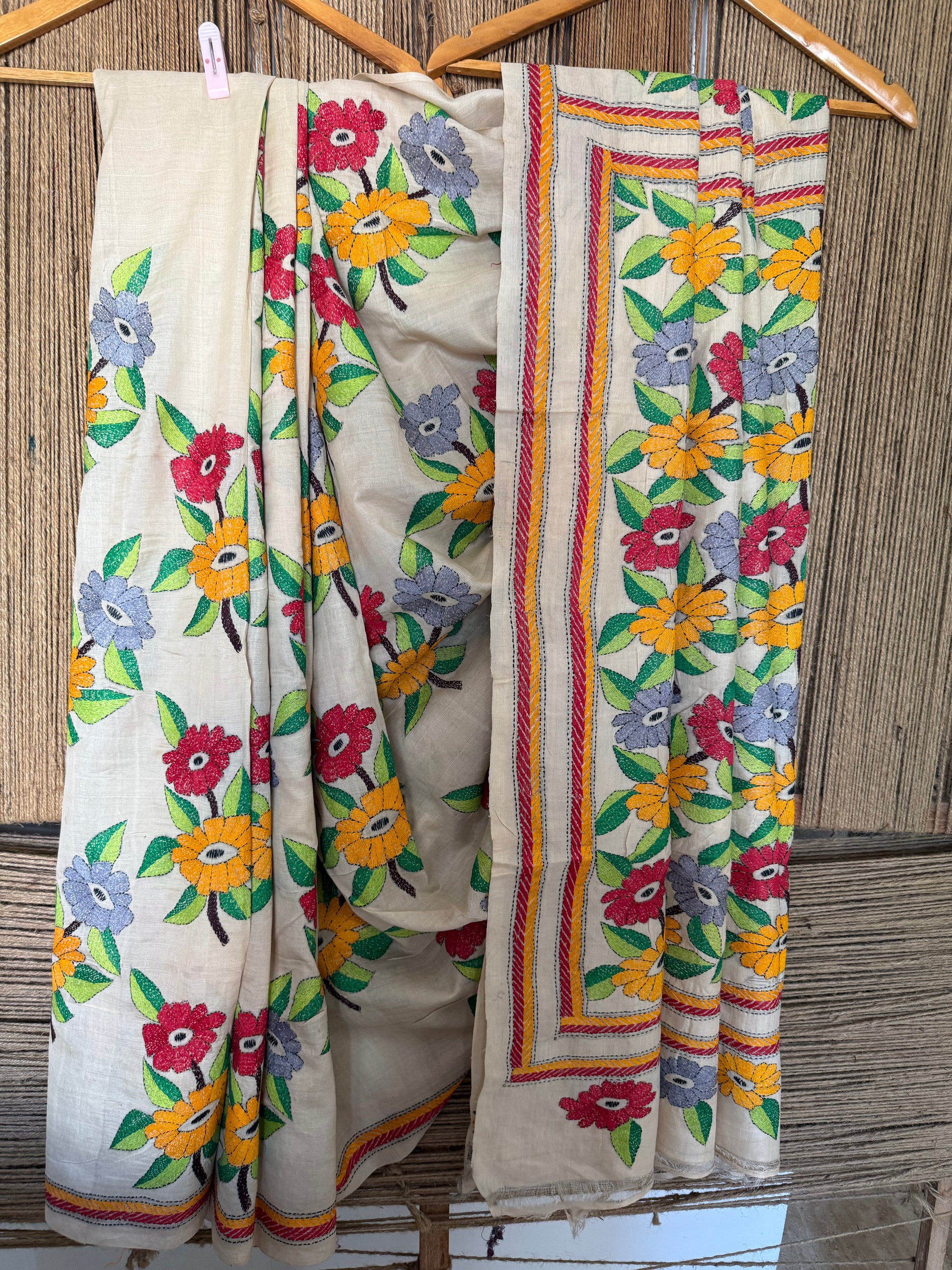 DUTCH WHITE BEAUTIFUL HAND MADE KANTA HANDWORK ON TUSSAR SARI THE KANTHA FLOWERS BEAUTIFUL ALL OVER THE SARI WITH BLOUSE