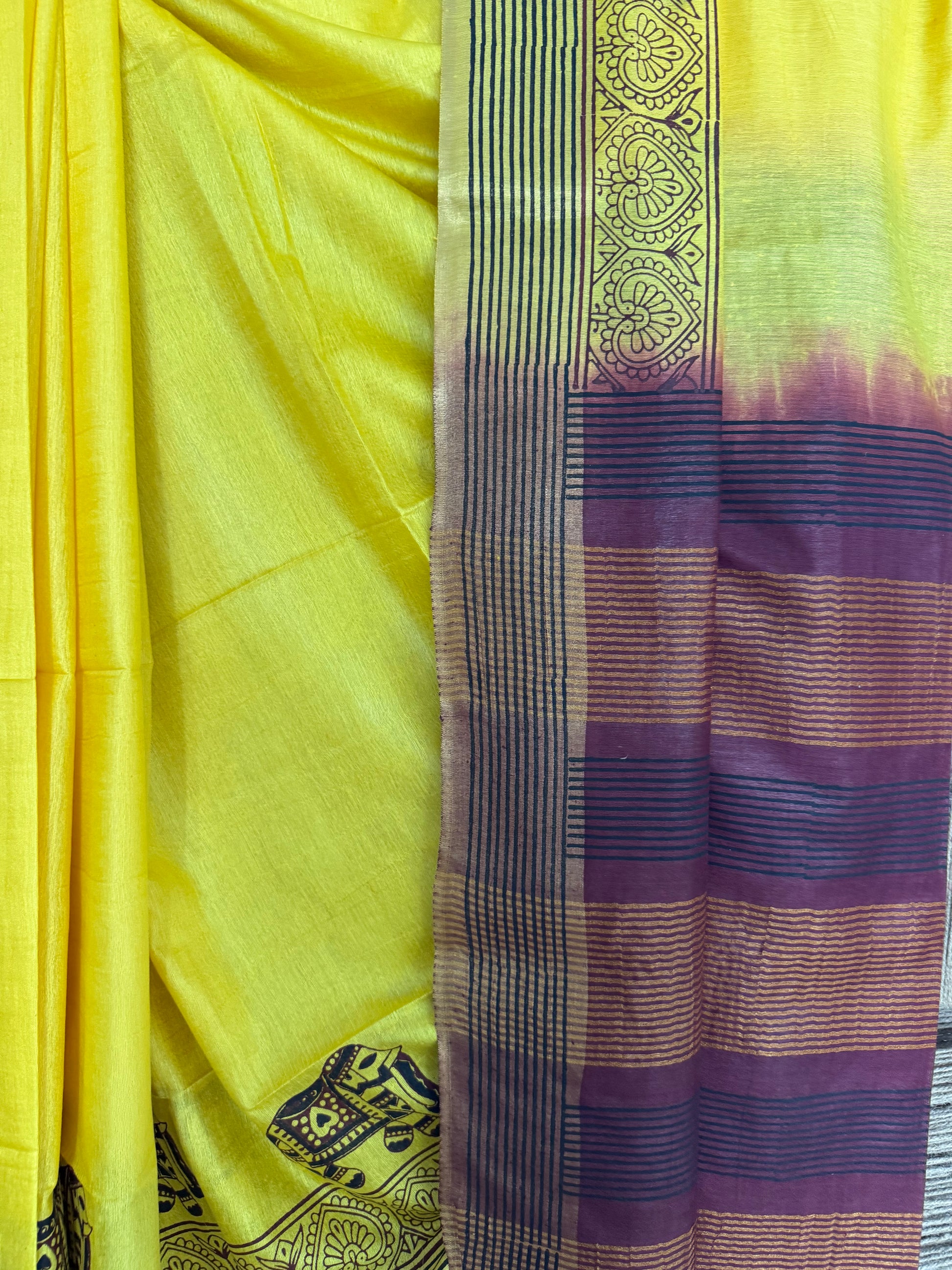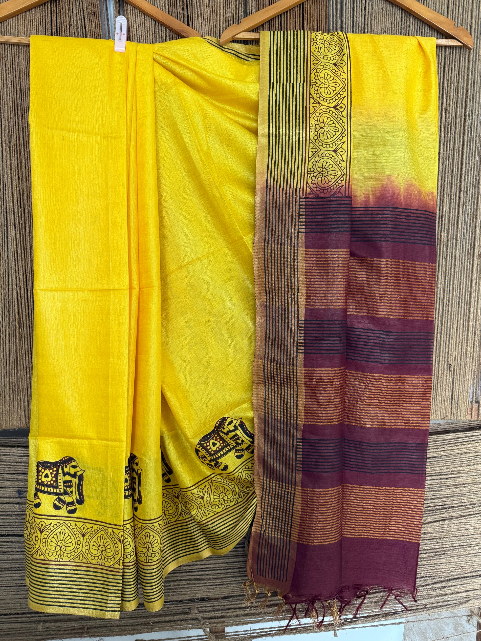 BEAUTIFUL YELLOW HANDBLOCK PRINTED SARI IN SEMI TUSSAR WITH BLOUSE