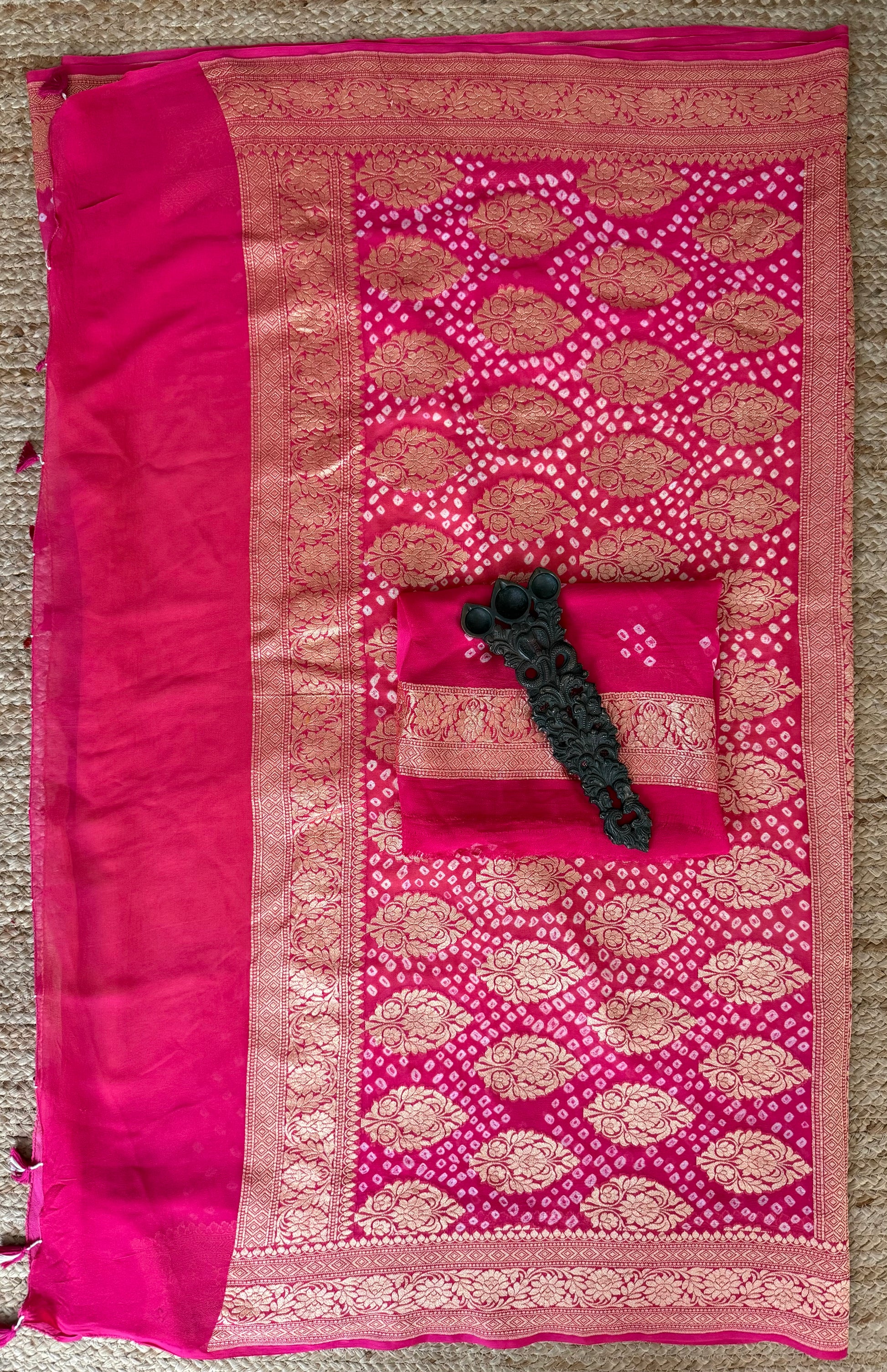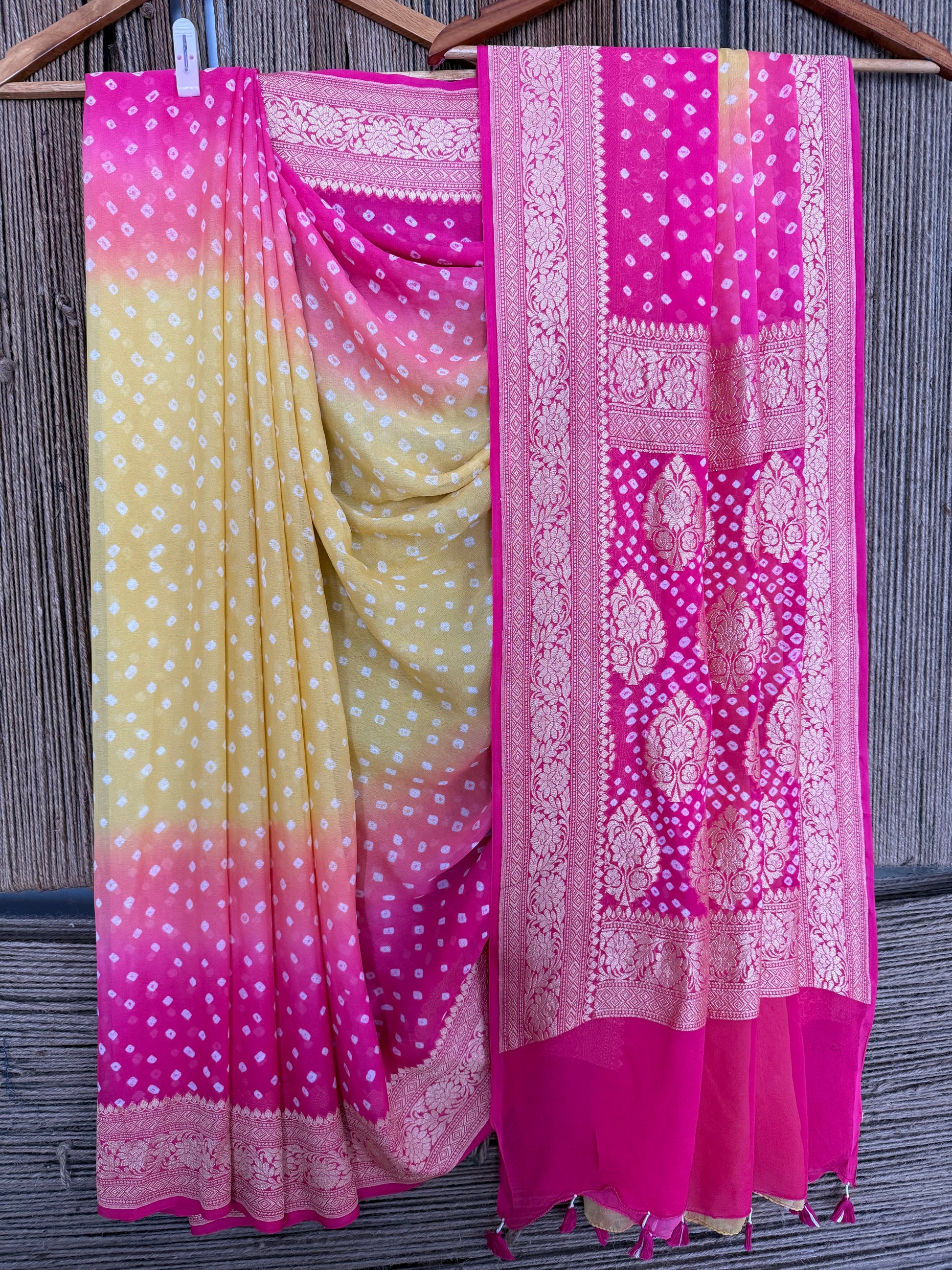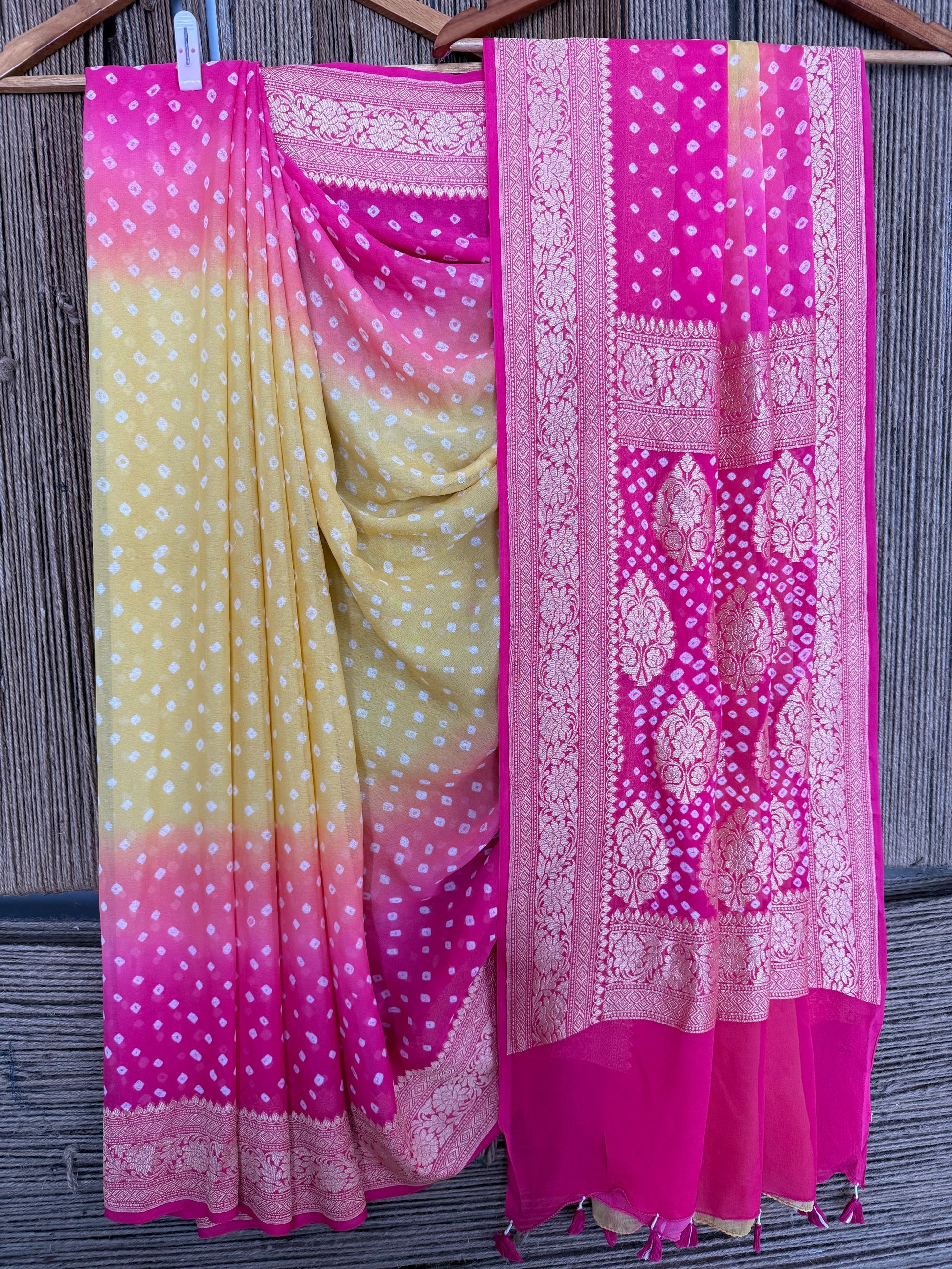 PINK YELLOW OMBRÉ SHADE HANDWOVEN NEEM ZARI HANDWOVEN BAREEK BANDHANI SAREE WITH KHADDI GEORGETTE