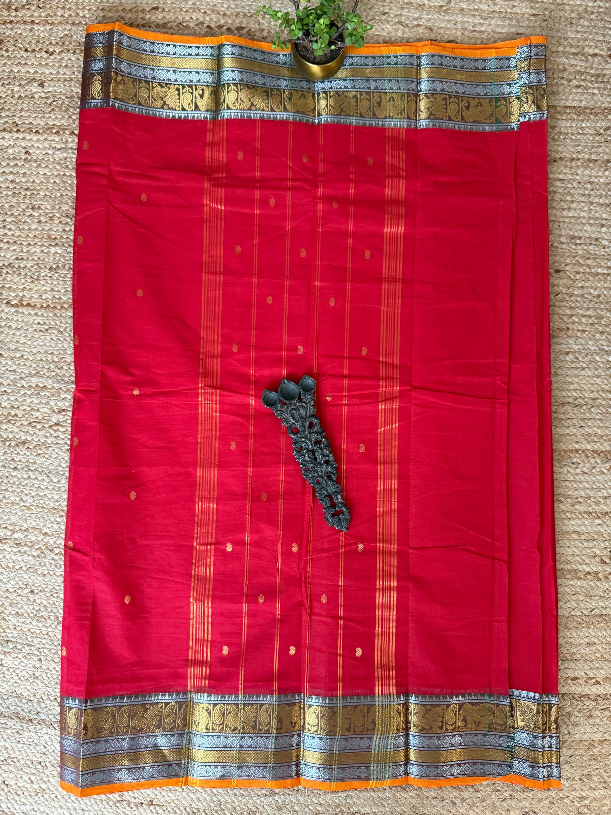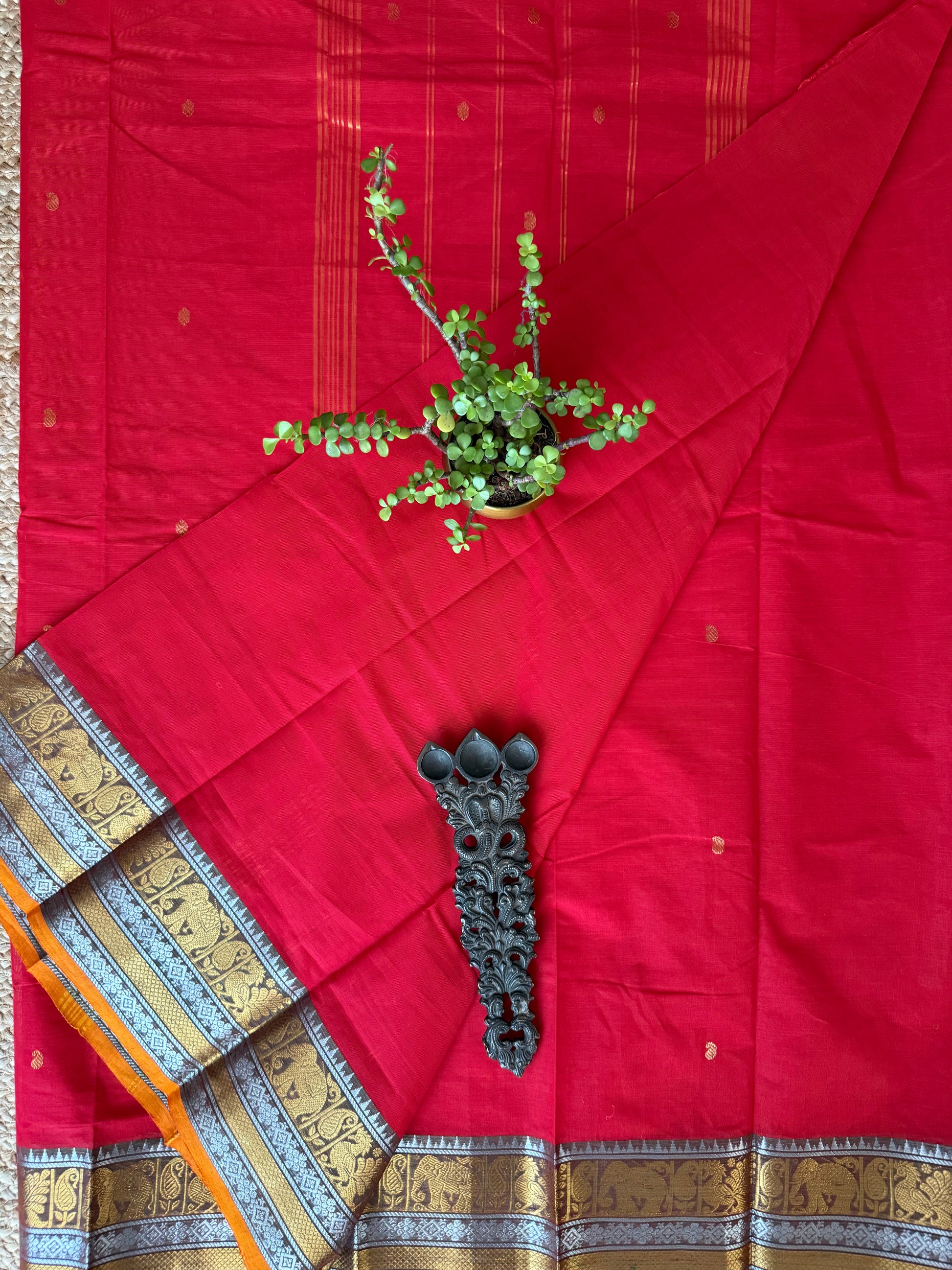 RED  TRADITIONAL KANCHI COTTON RED PAISLEY BUTTAS WITH LOVELY GOLD & SILVER ZARI ELEPHANT,PEACOCK & PAISLEY DESIGN WITH RUNNING BLOUSE