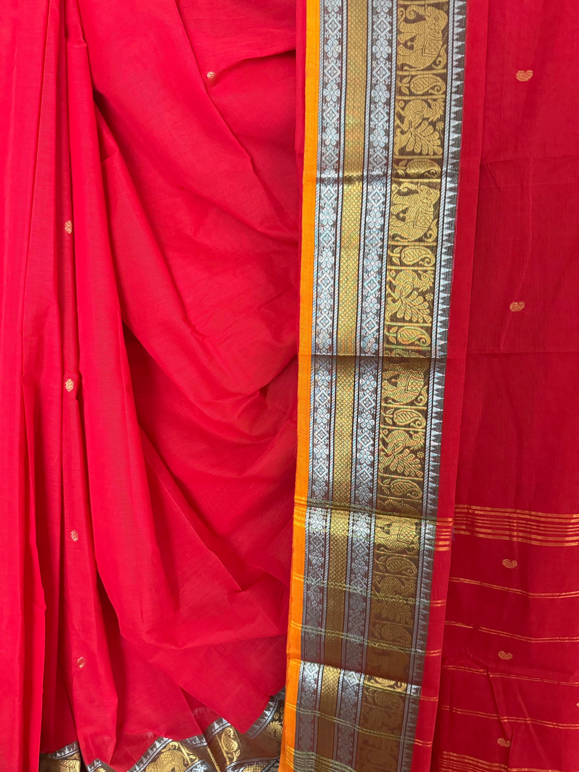 RED TRADITIONAL KANCHI COTTON SARI WITH ELEPHANT,PEACOCK & PAISLEY DESIGN WITH RUNNING BLOUSE