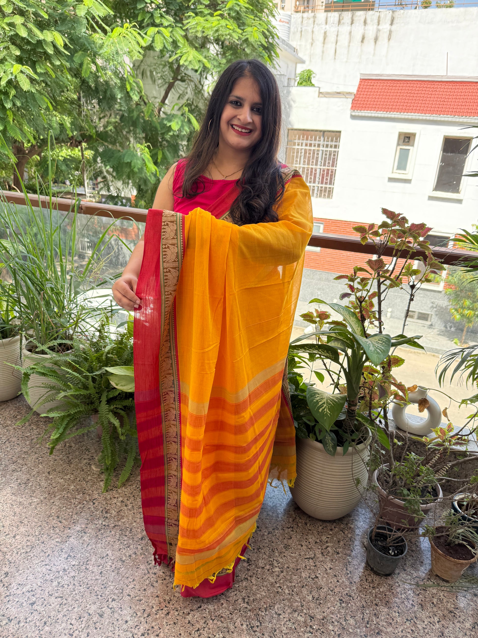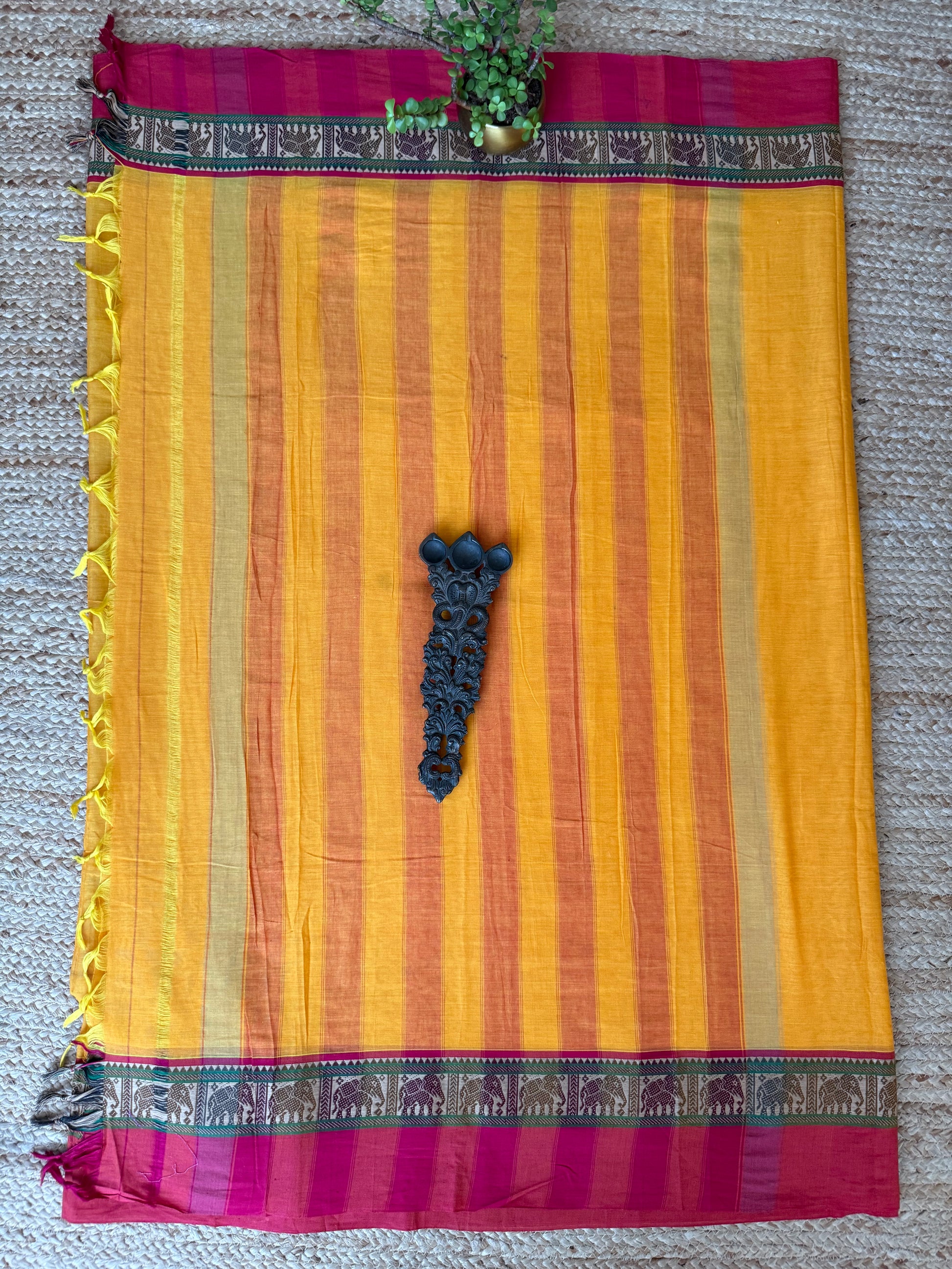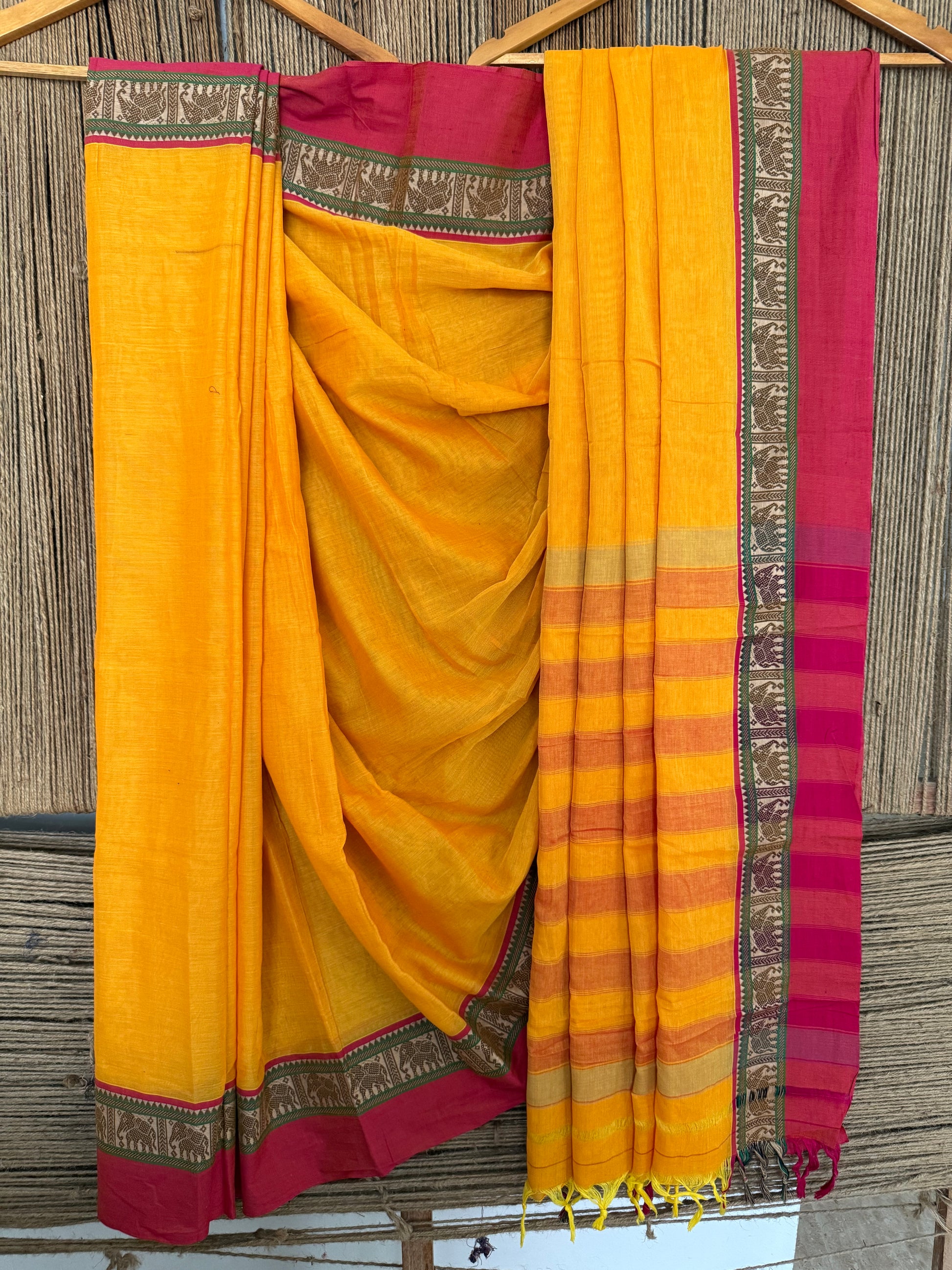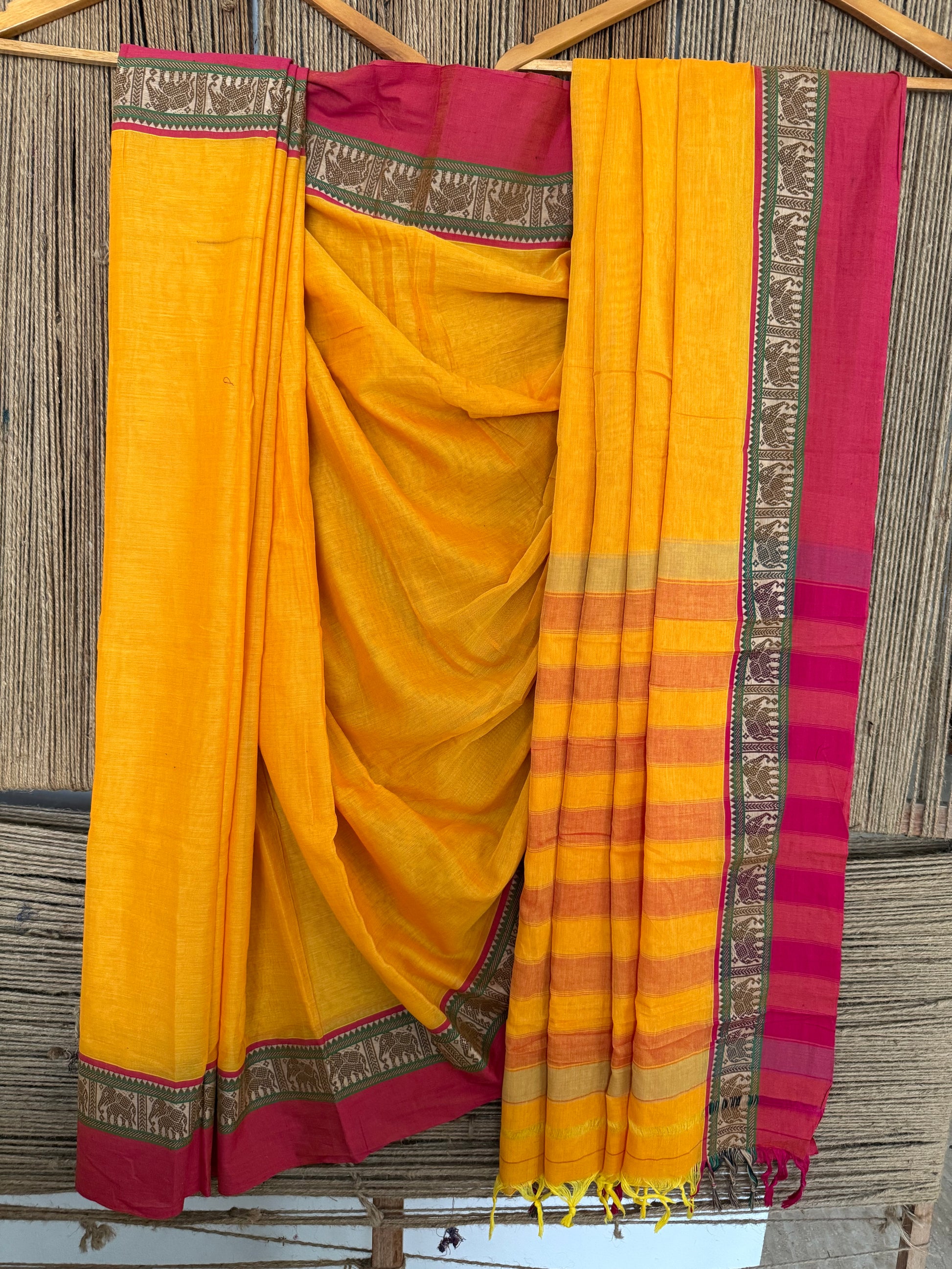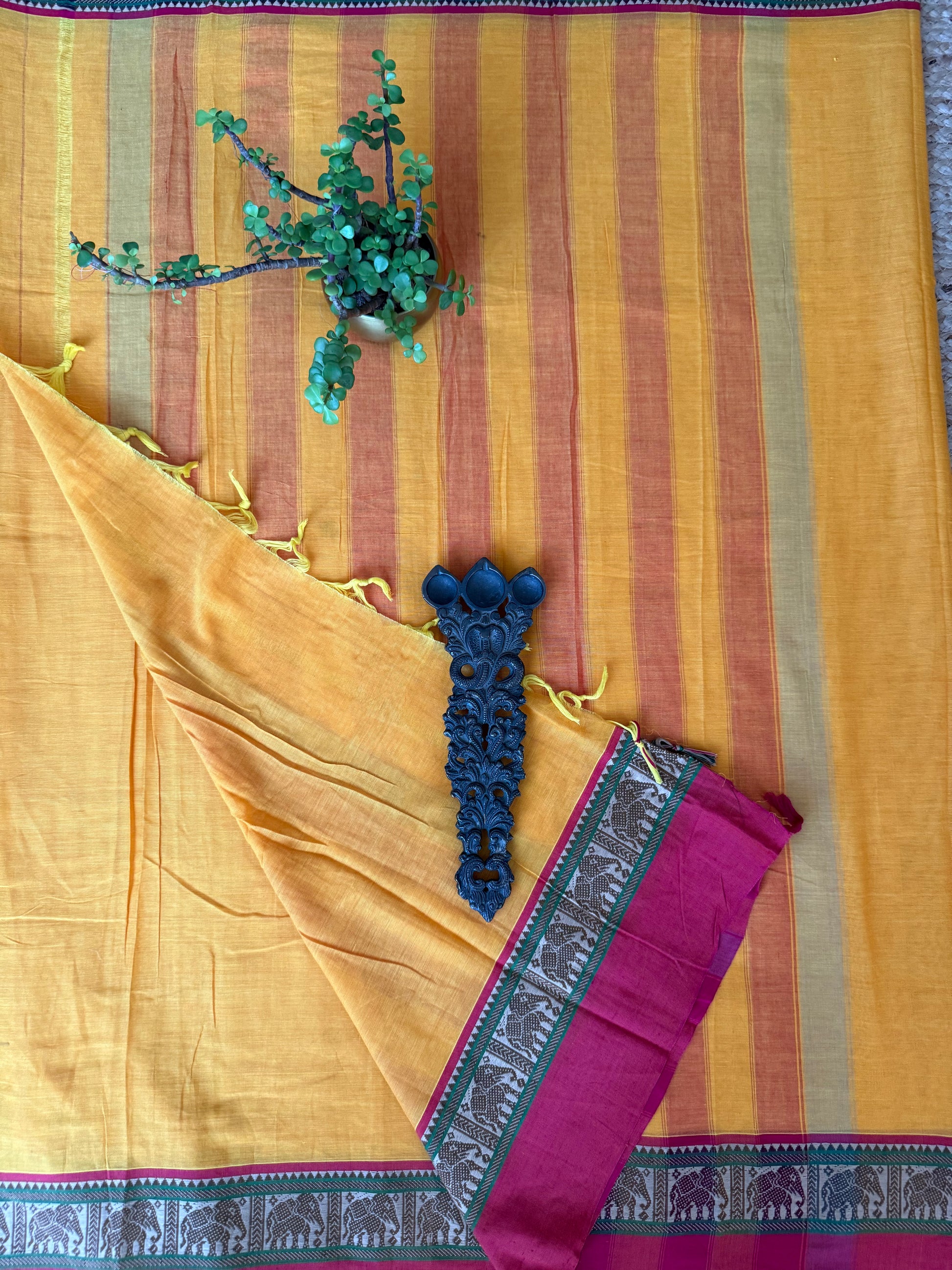 MANGO YELLOW TRADITIONAL NARAYANPET COTTON SAREE WITH ELEPHANT BORDER SARI