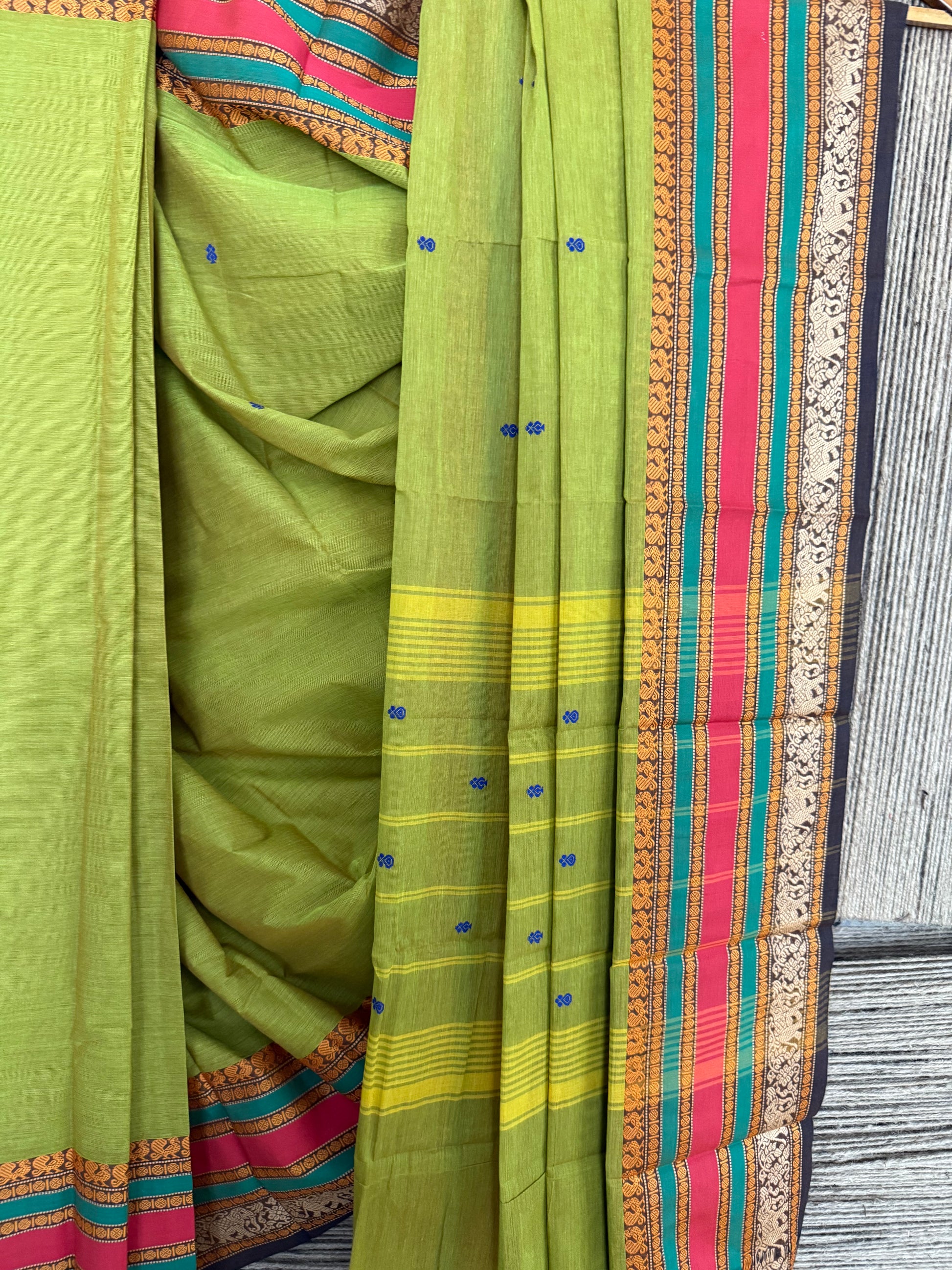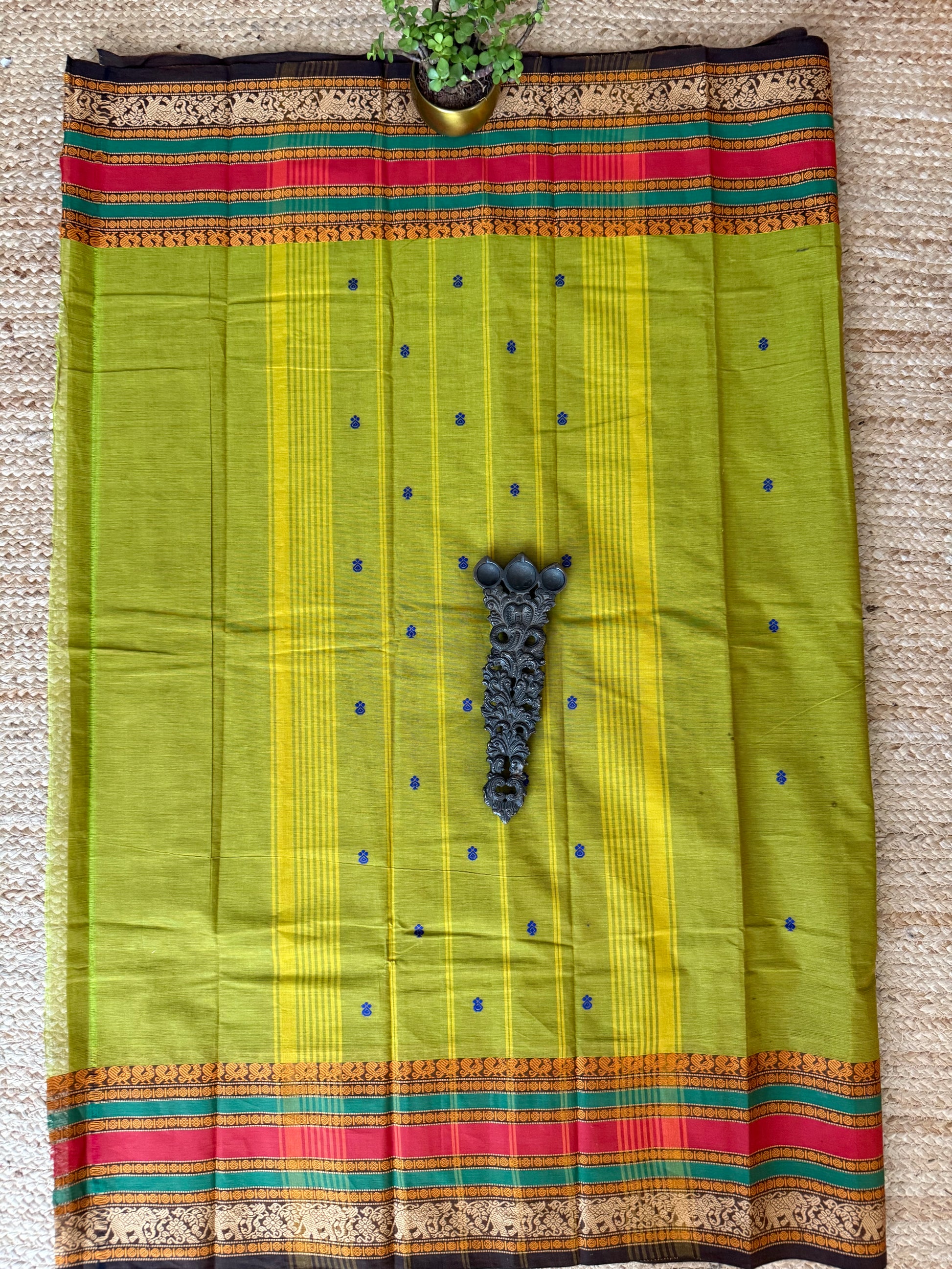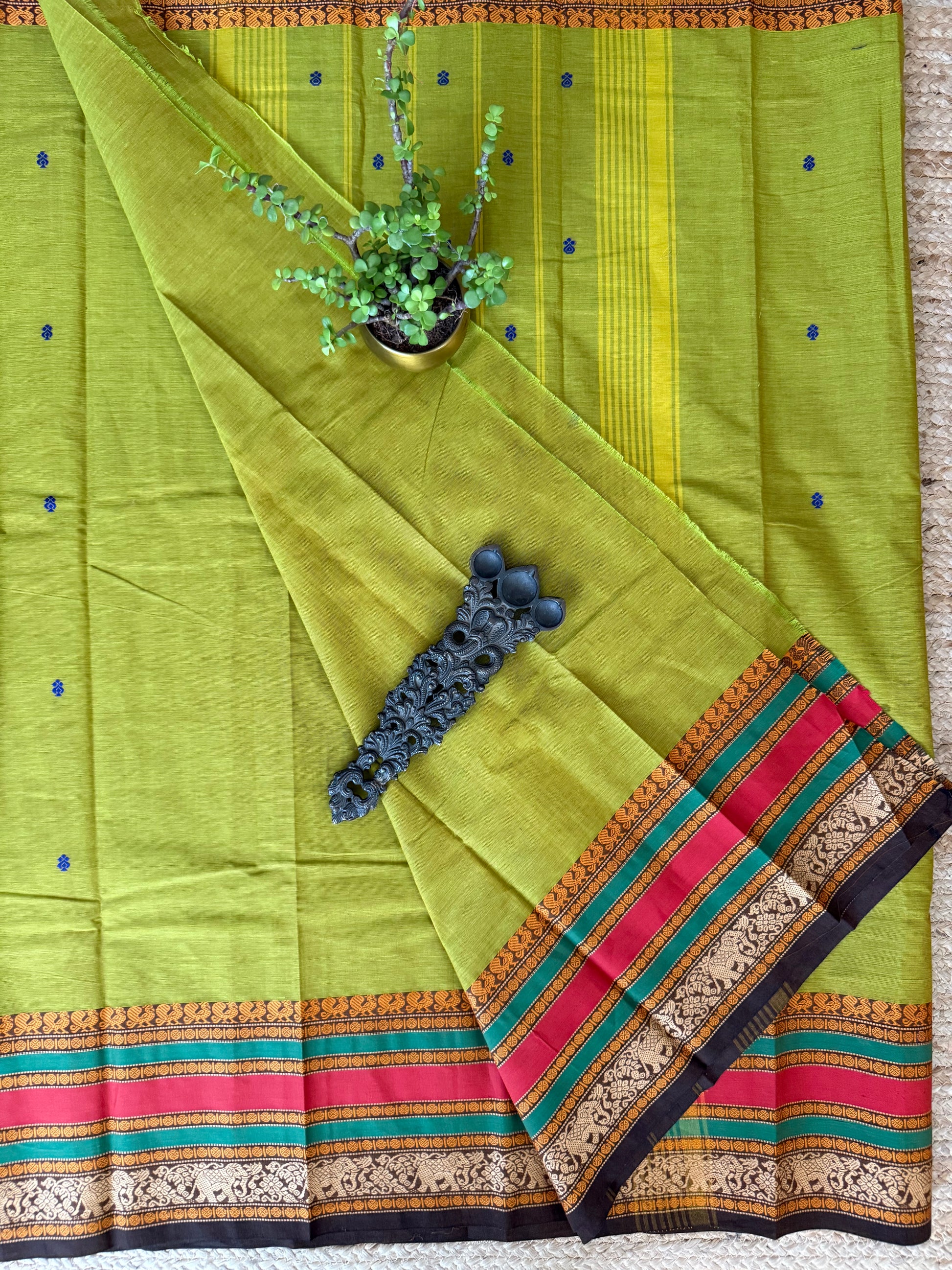 OLIVE GREEN TRADITIONAL KANCHI COTTON RED PAISLEY BUTTAS WITH LOVELY GOLD & SILVER ZARI ELEPHANT,PEACOCK & PAISLEY DESIGN WITH RUNNING BLOUSE