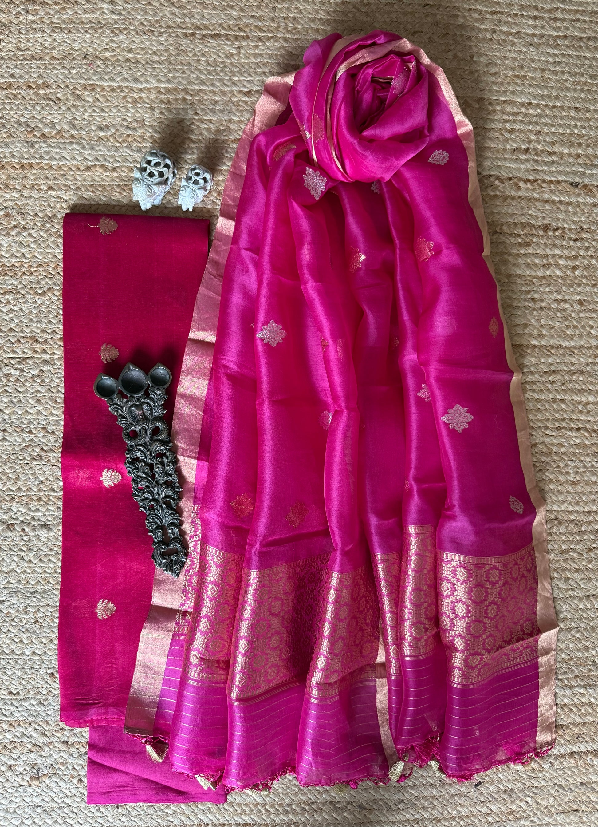 Fuchsia Pink Kora silk certified handloom Banarsi Booti three piece suit
