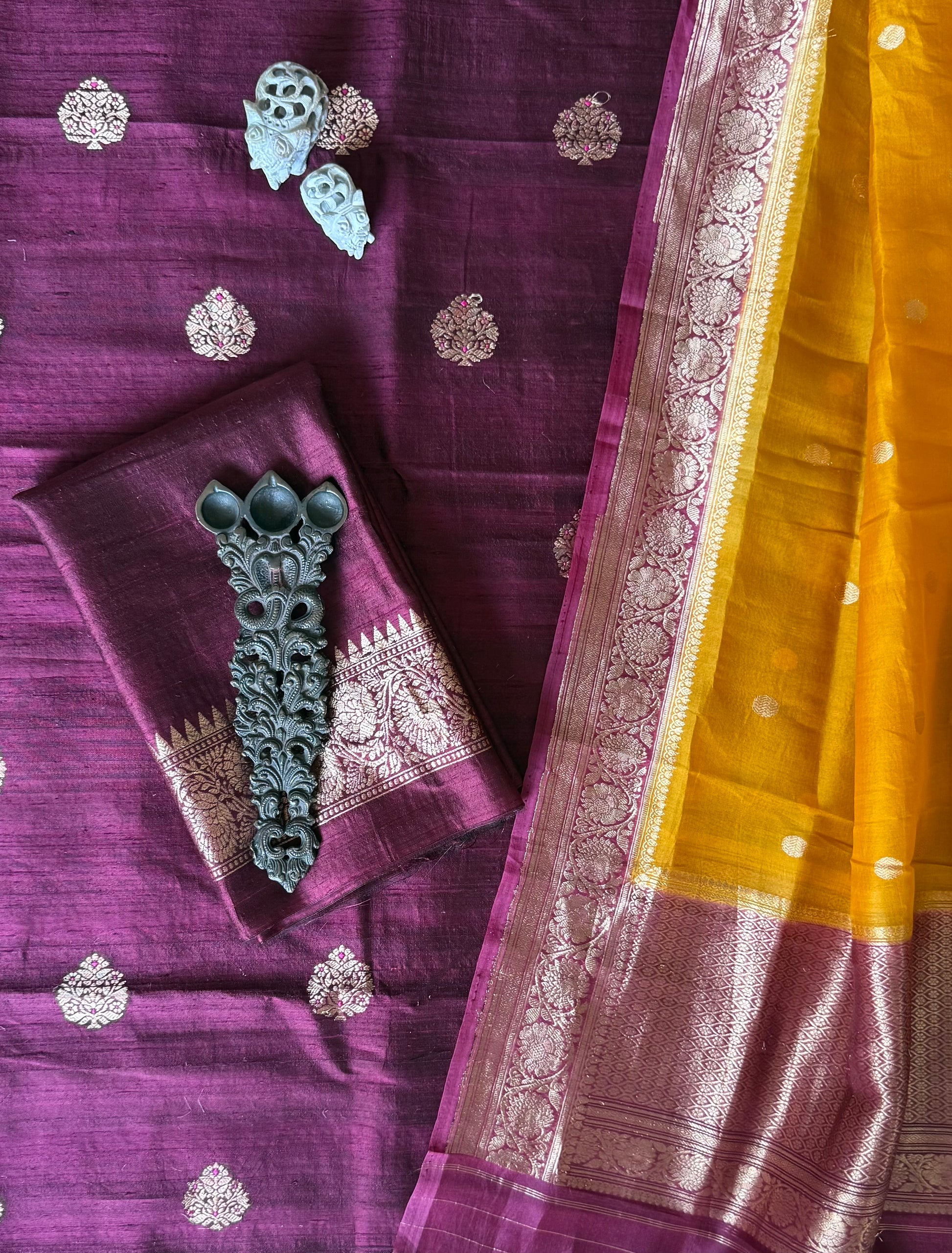 MAROON RAW SILK CERTIFIED HANDLOOM BANARSI MEENAKARI KADWA BOOTI WITH WOVEN ZARI THREE PIECE SUIT