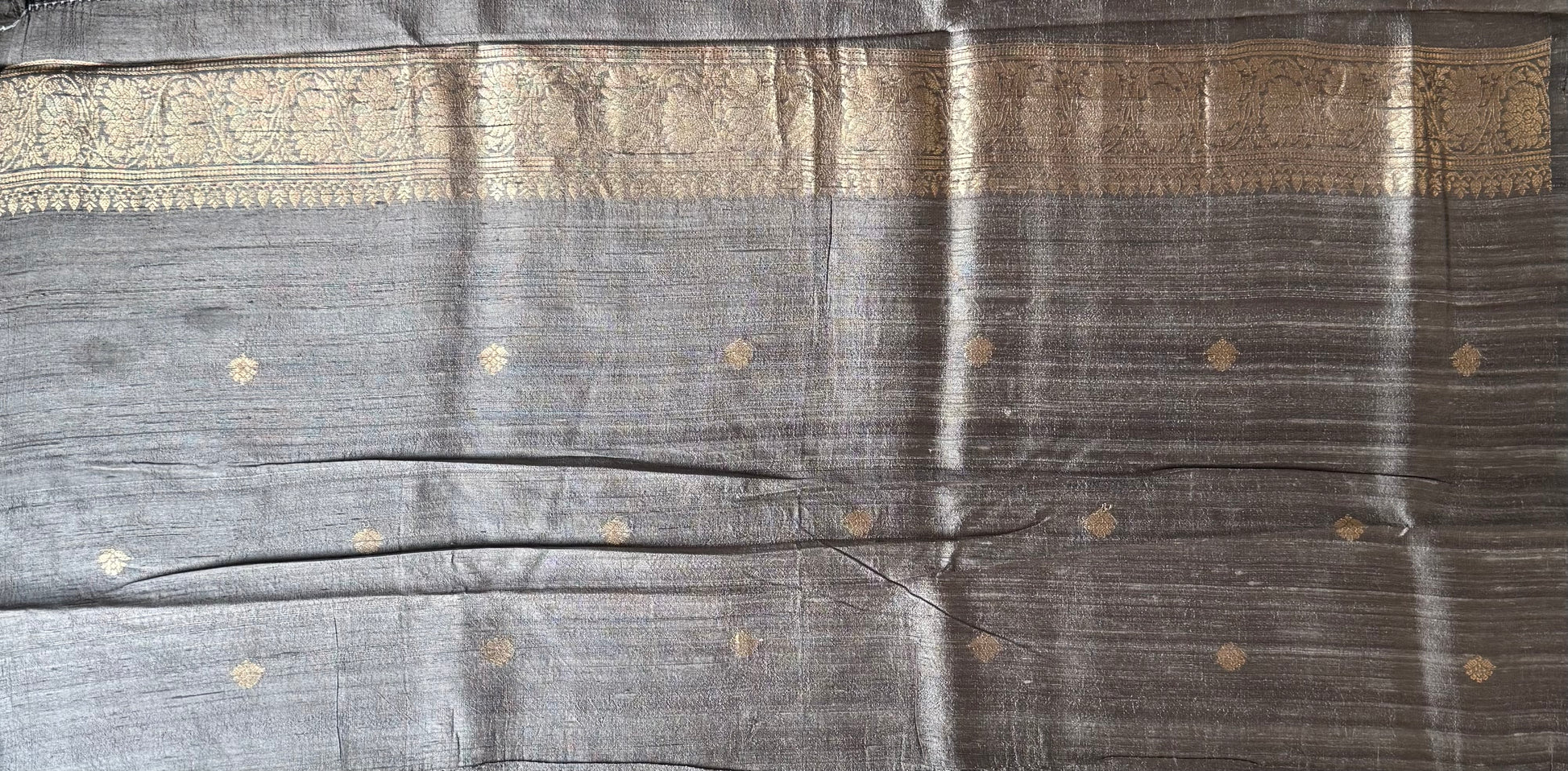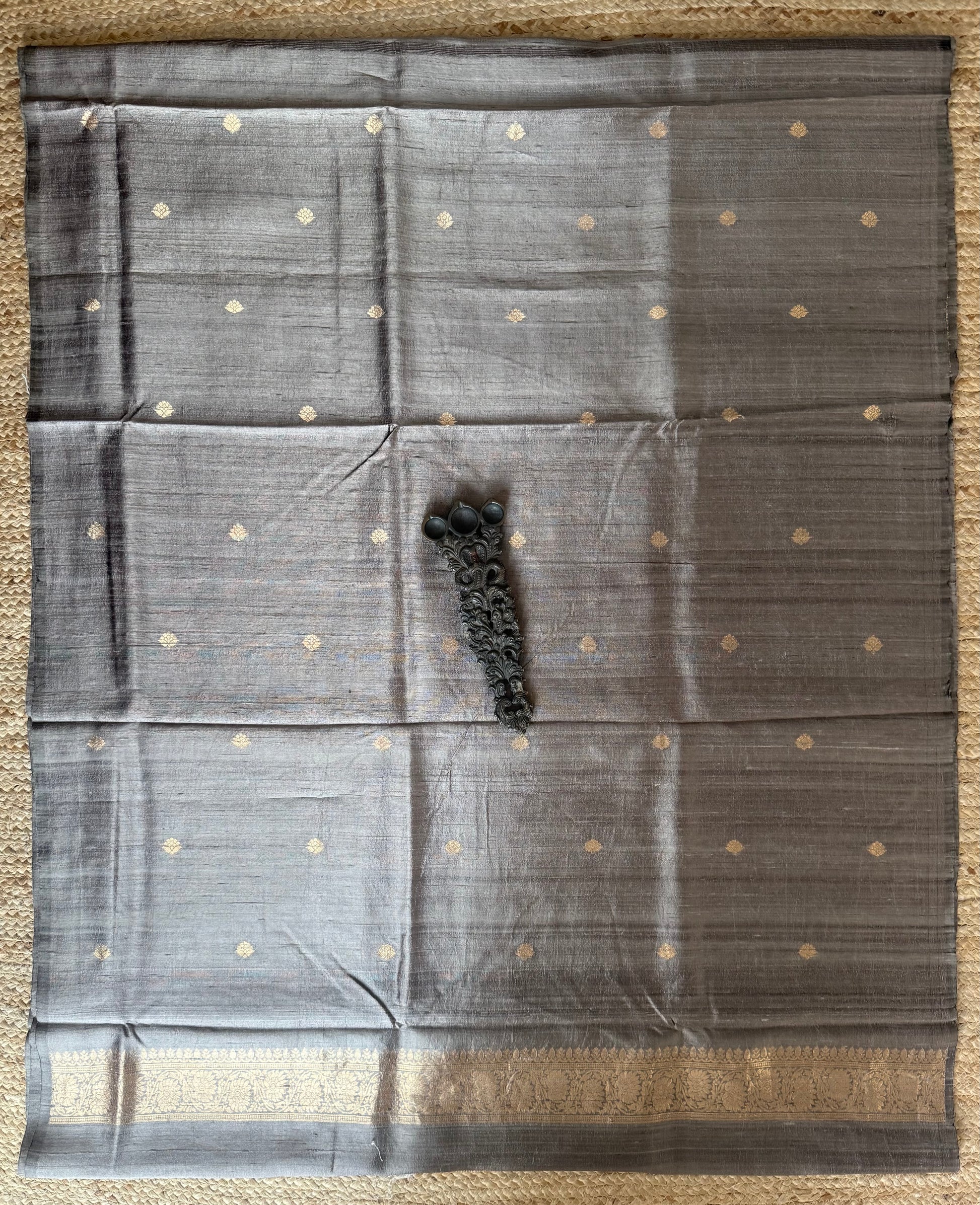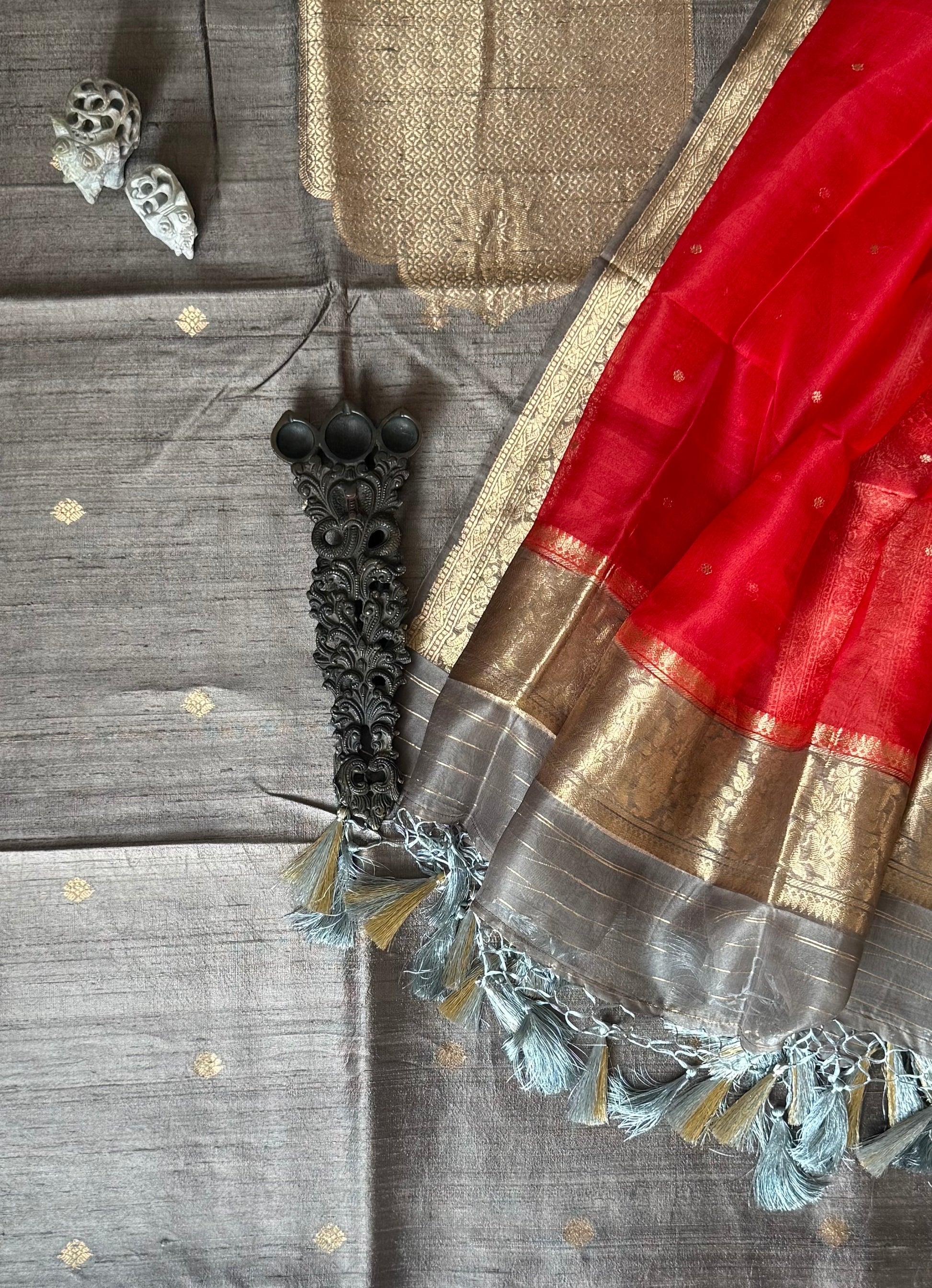 STONE GRAY RAW SILK CERTIFIED HANDLOOM BANARSI KADWA BUTTI WITH WOVEN ZARI THREE PIECE SUIT