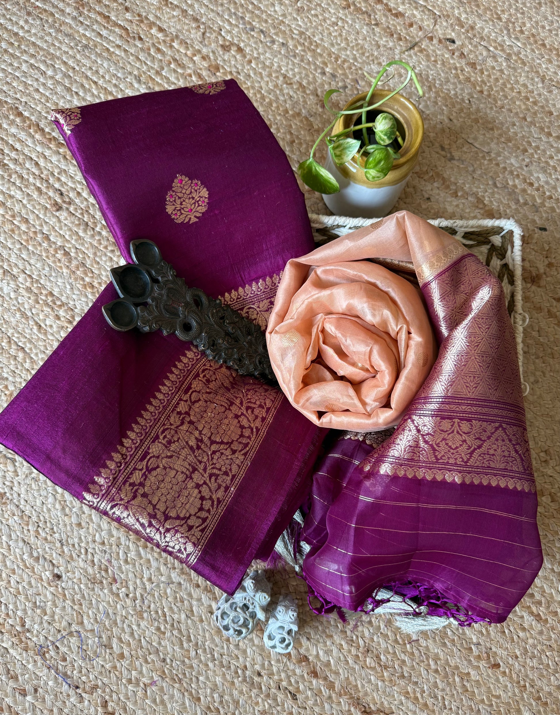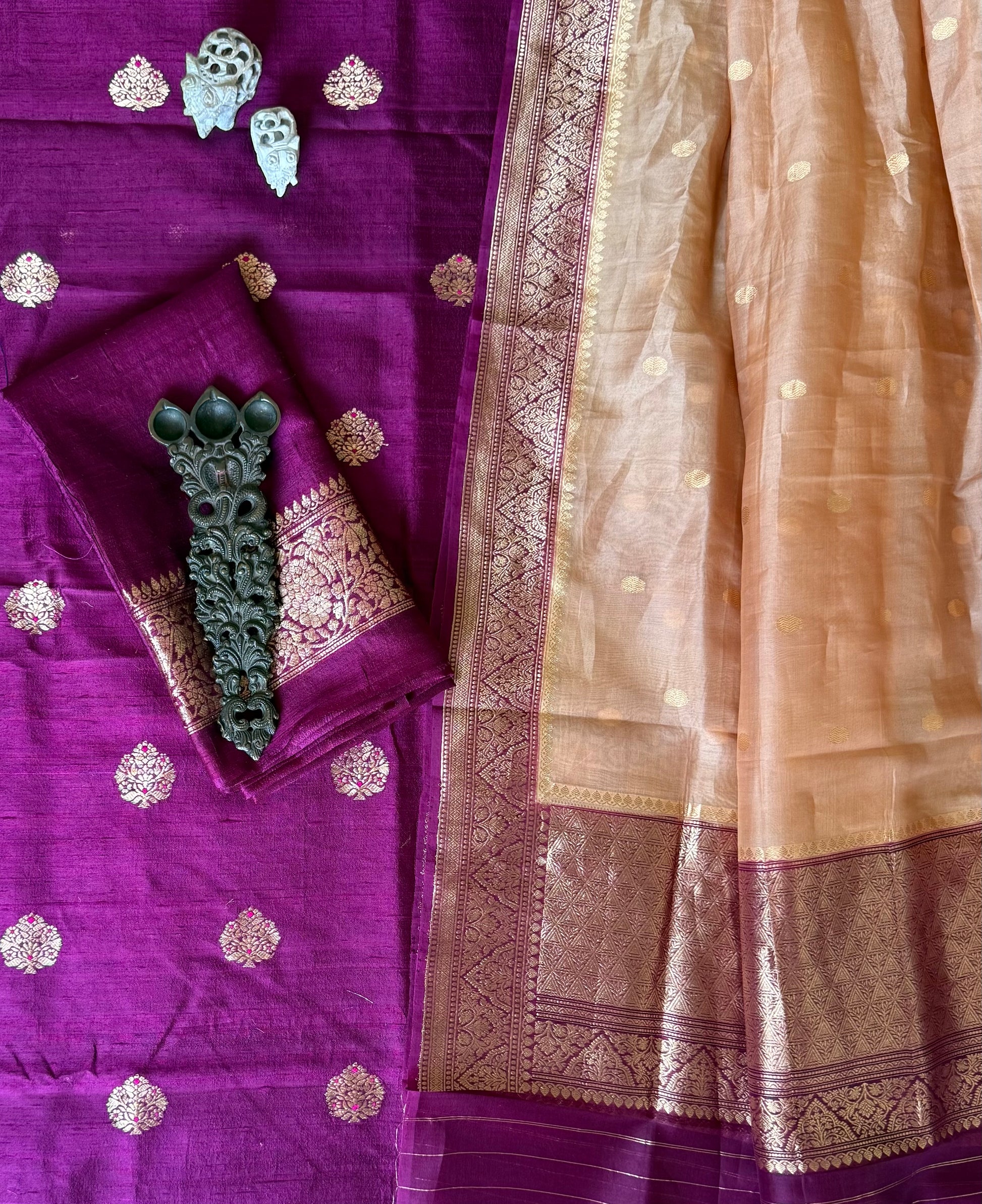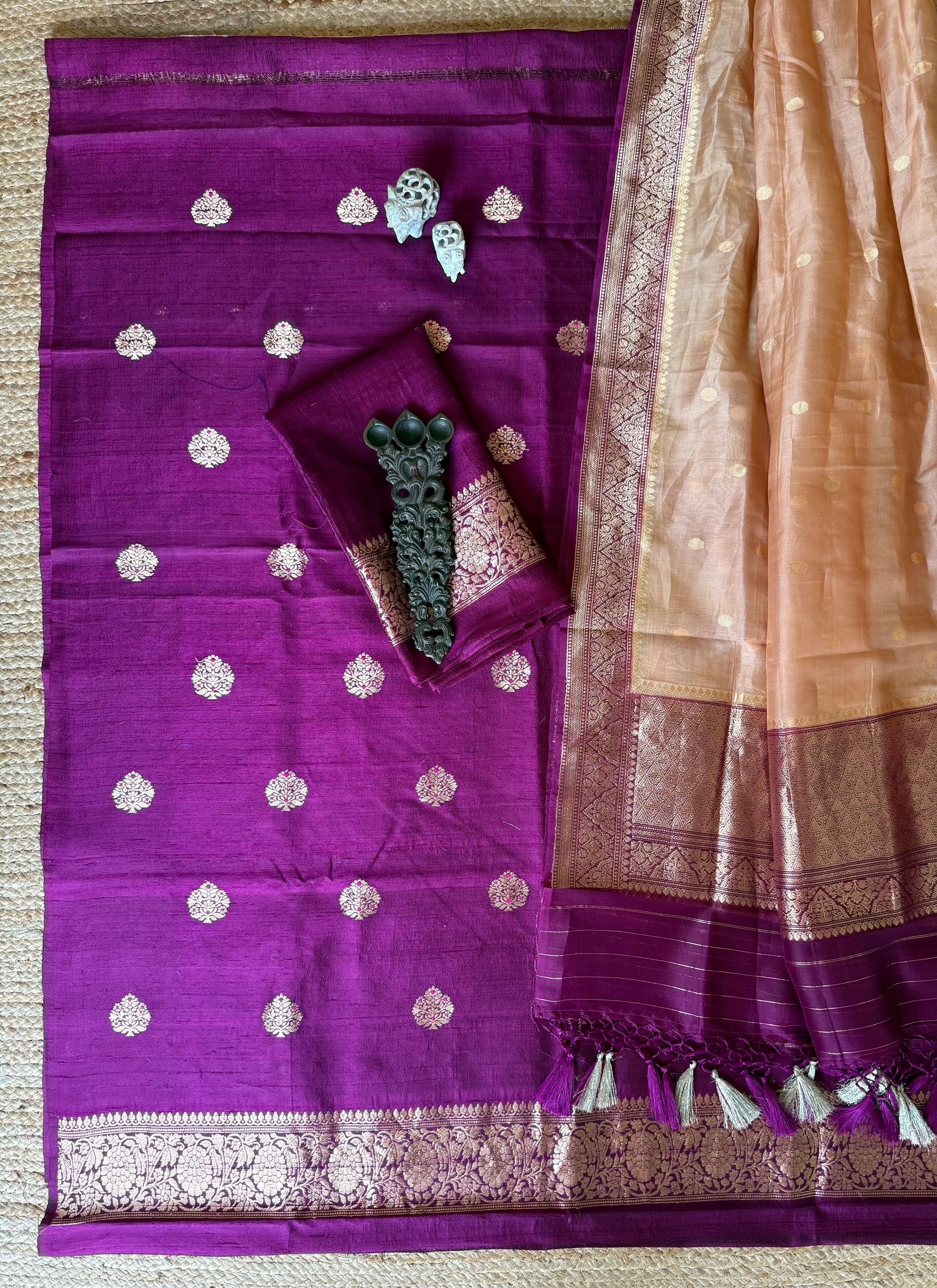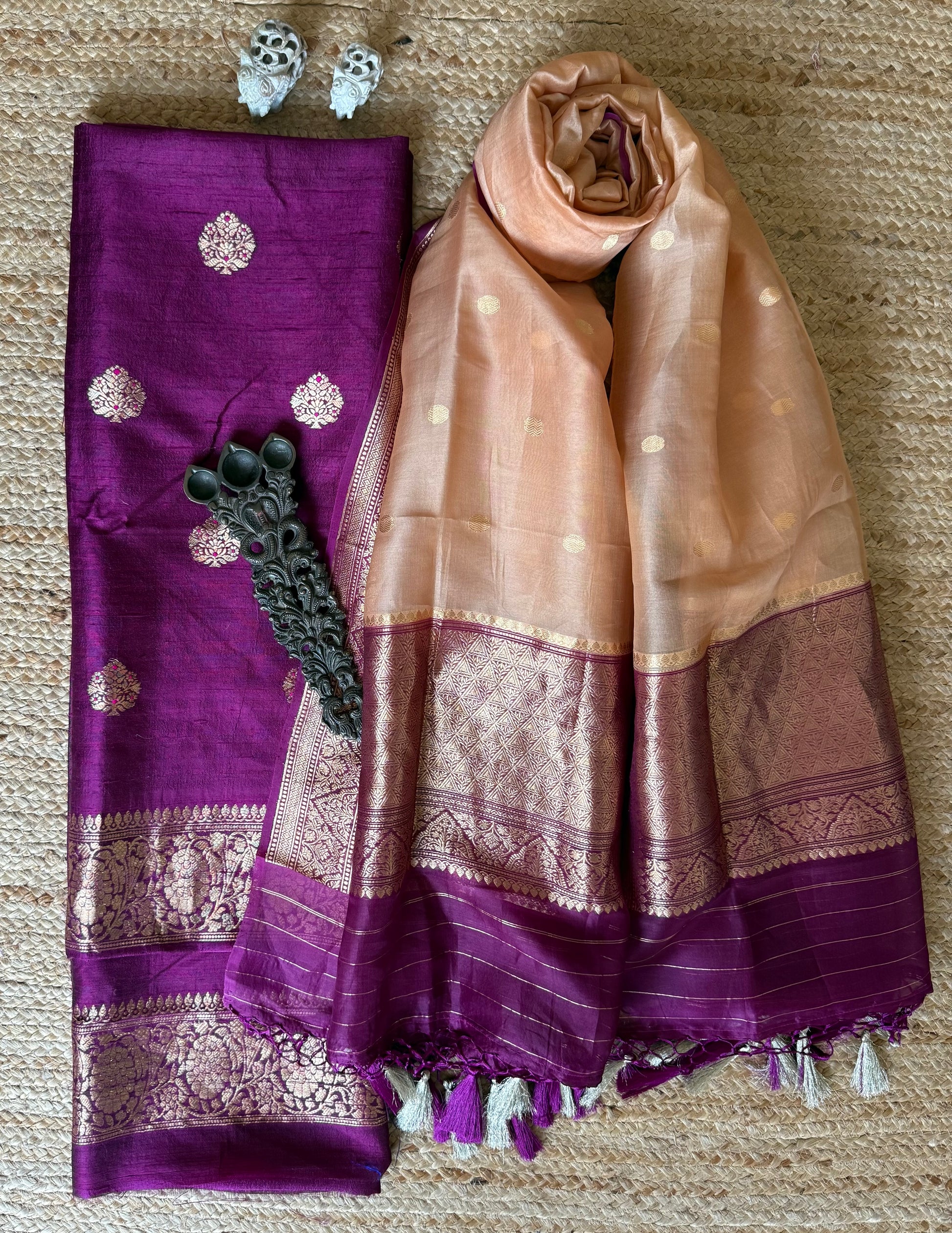 PURPLE RAW SILK CERTIFIED HANDLOOM BANARSI MEENAKARI KADWA BOOTI WITH WOVEN ZARI THREE PIECE SUIT