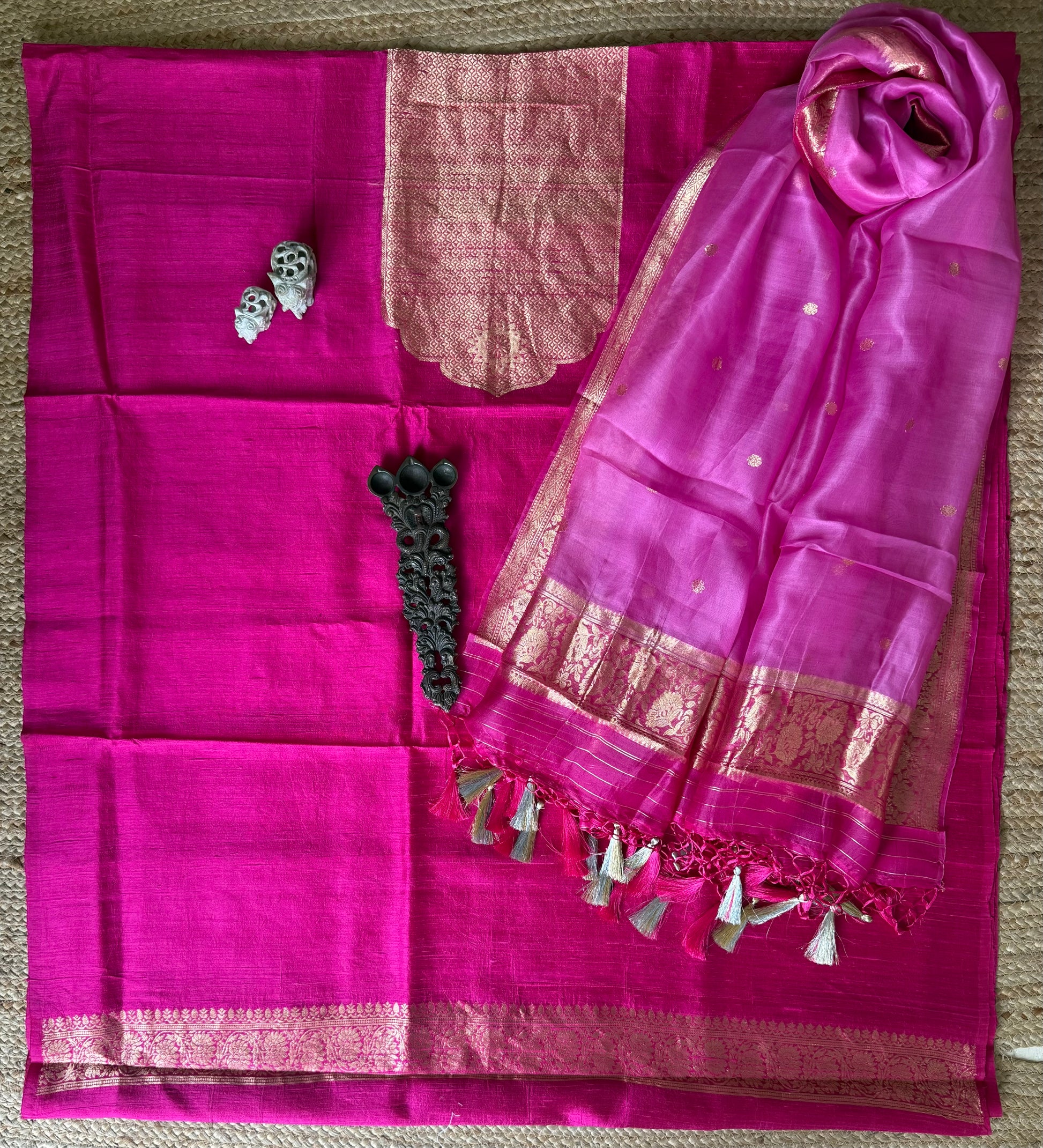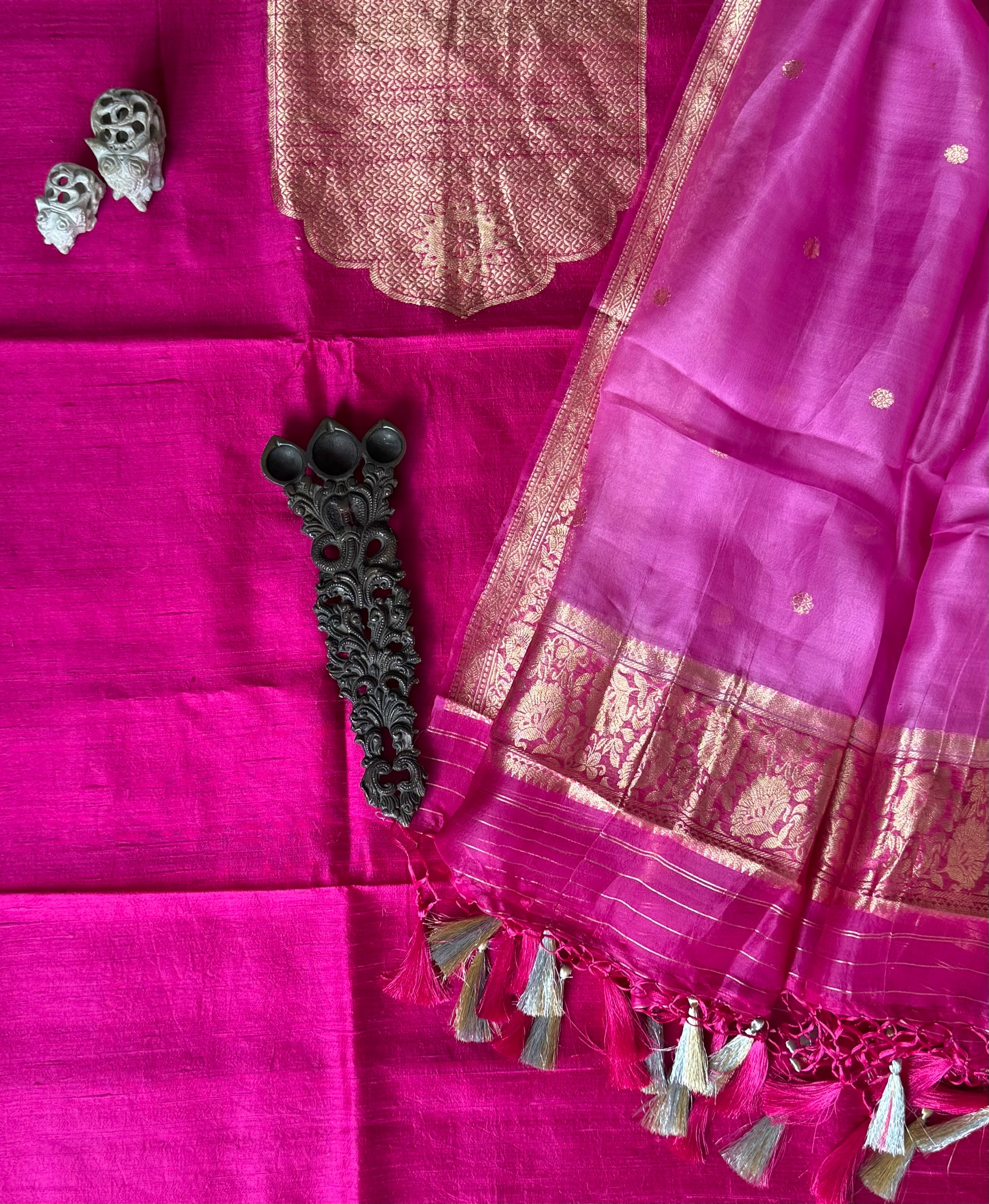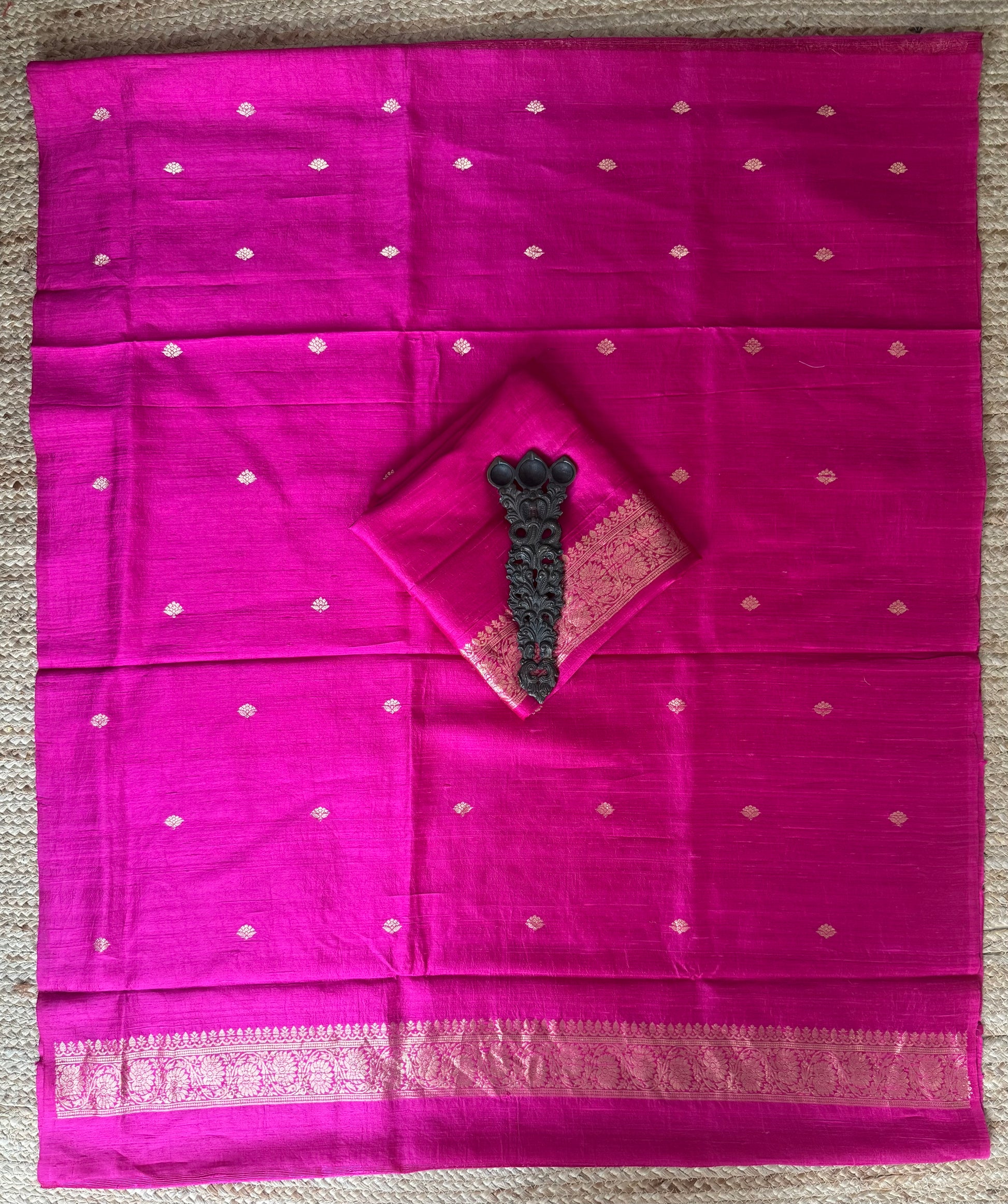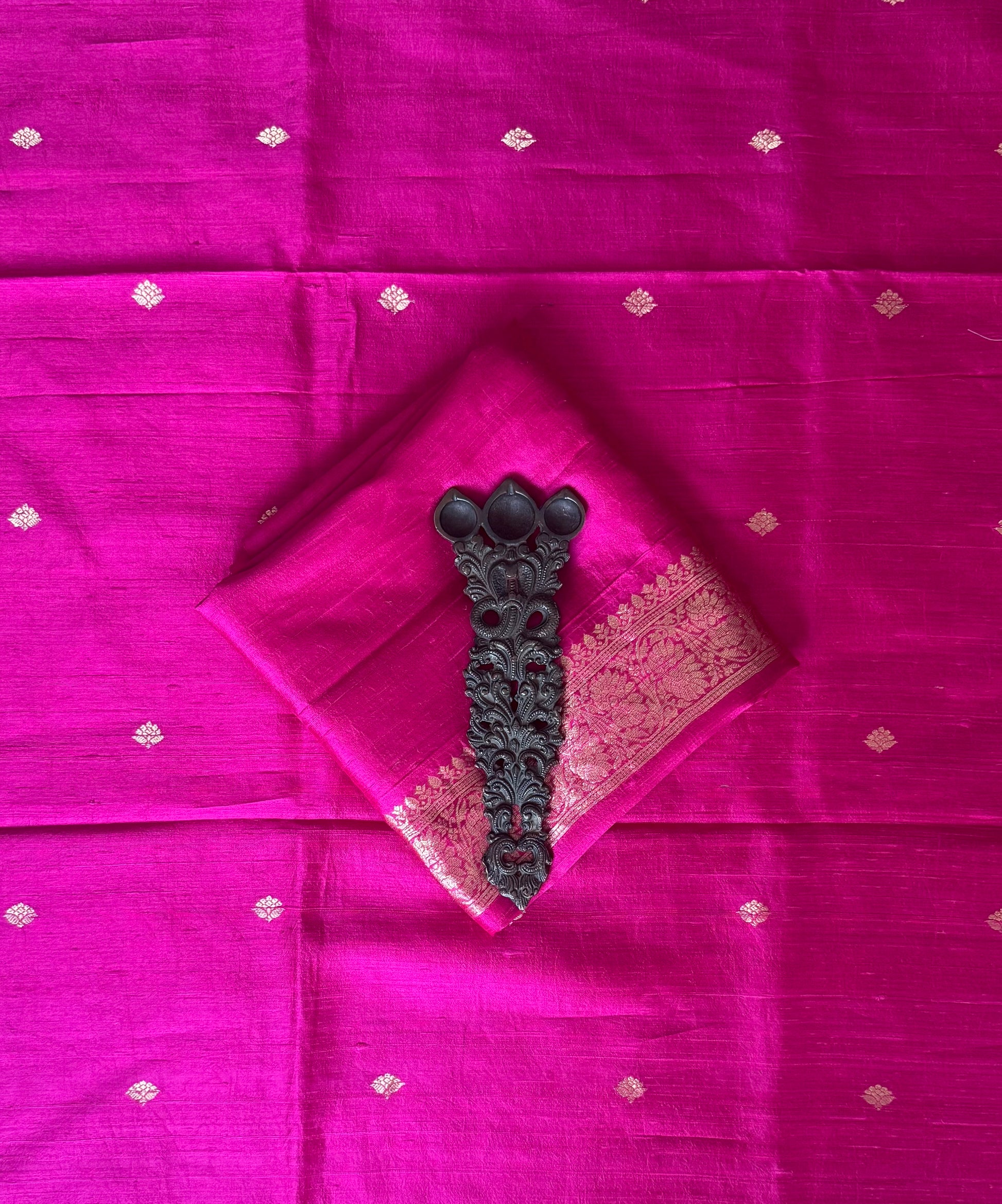 HOT PINK RAW SILK CERTIFIED HANDLOOM BANARSI SUIT WITH WOVEN ZARI THREE PIECE SUIT