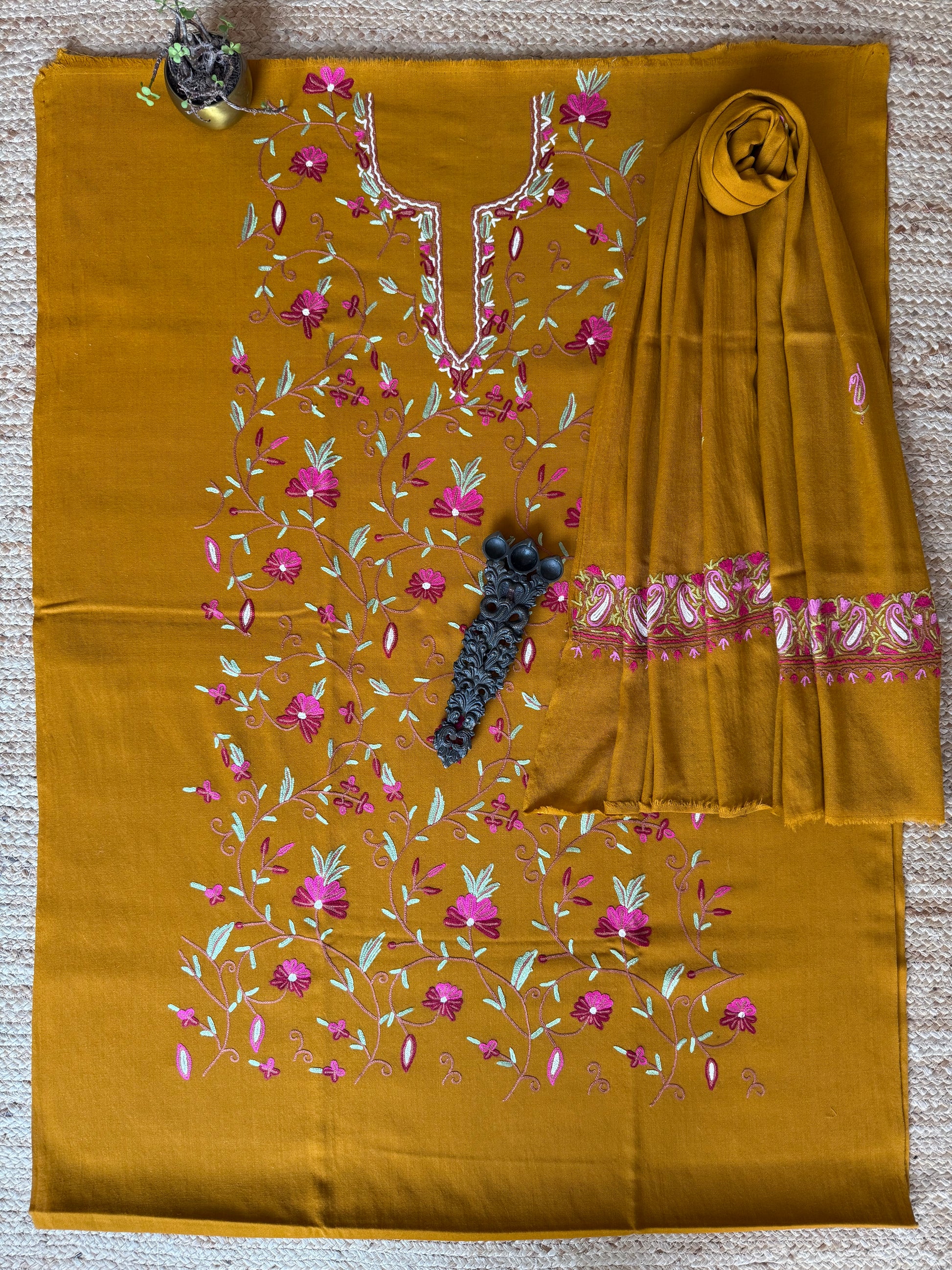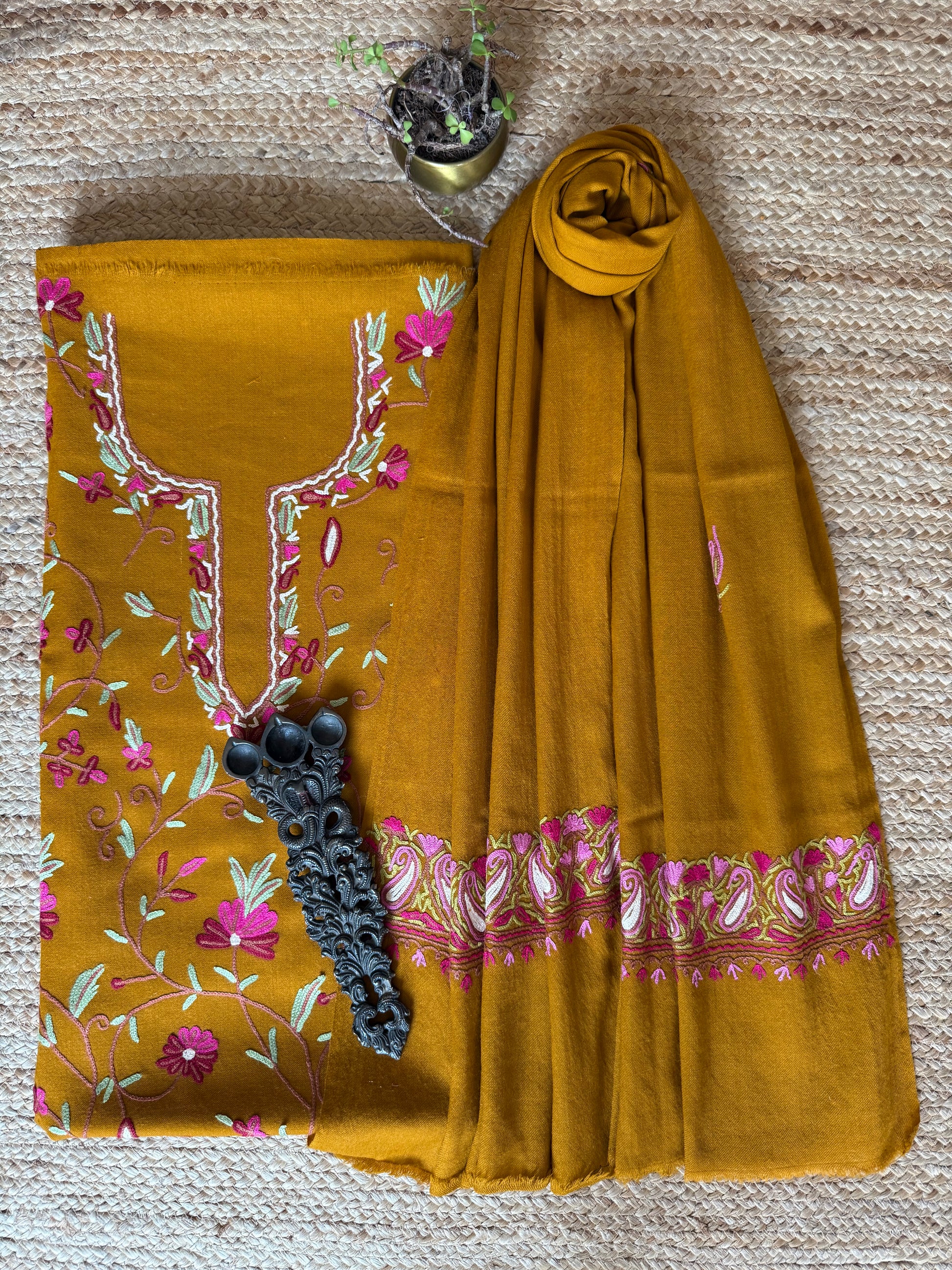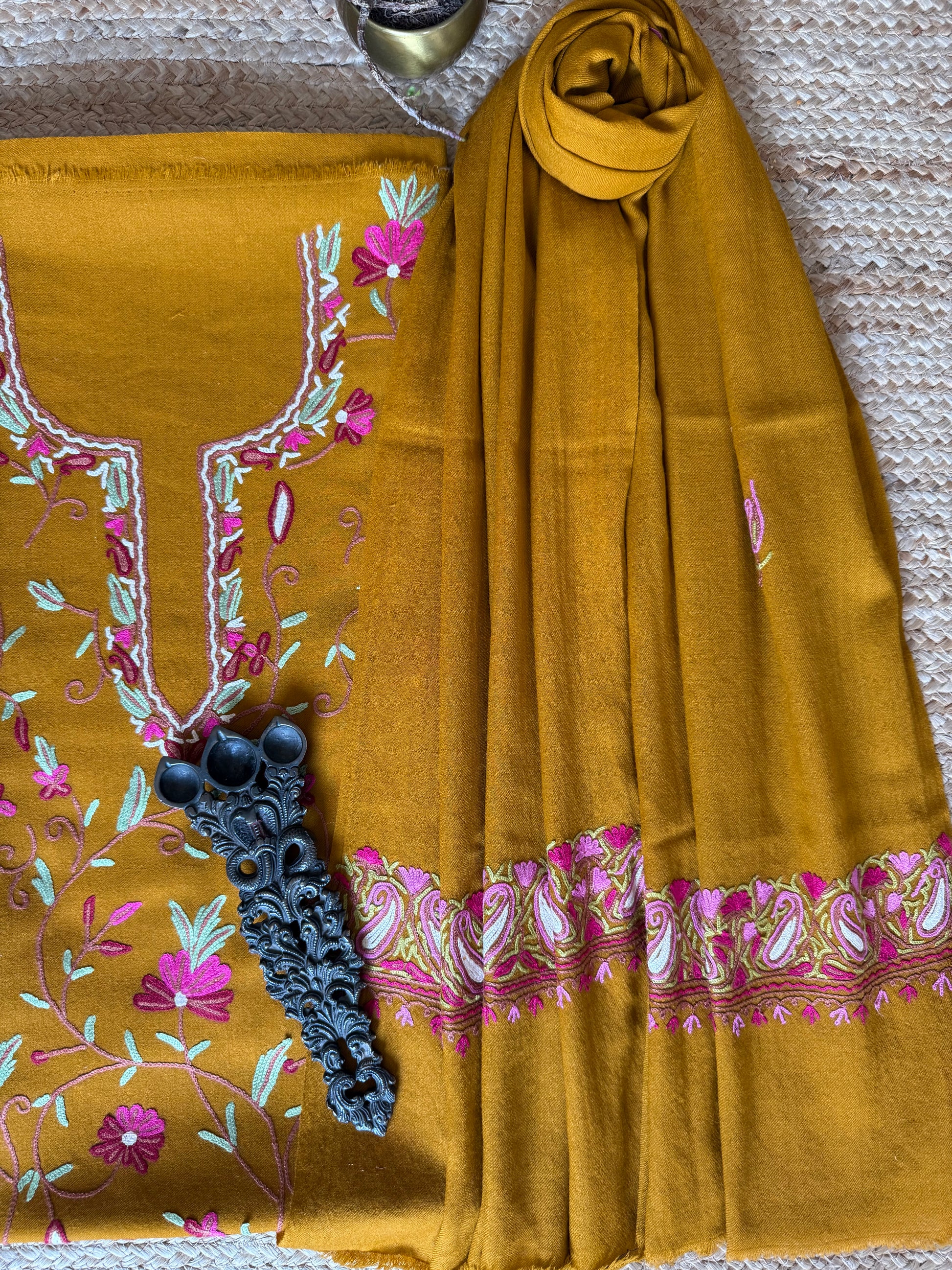 OCHRE YELLOW THREE PIECE JAL EMBROIDERED WORK MERINO WOOL UNSTITCHED SUIT SET WITH HAND EMBROIDERY (AARI WORK / SOZNI) WS -5